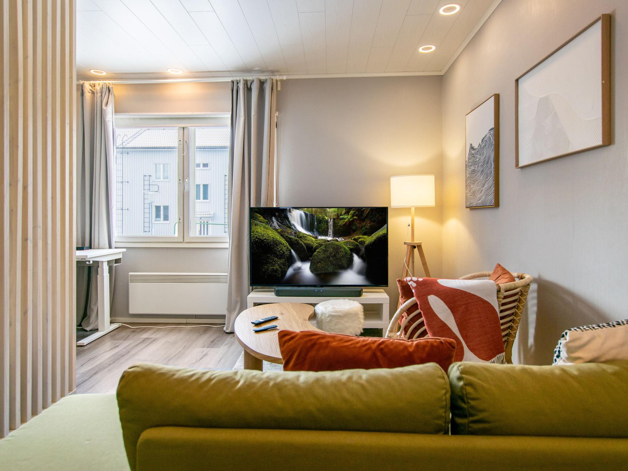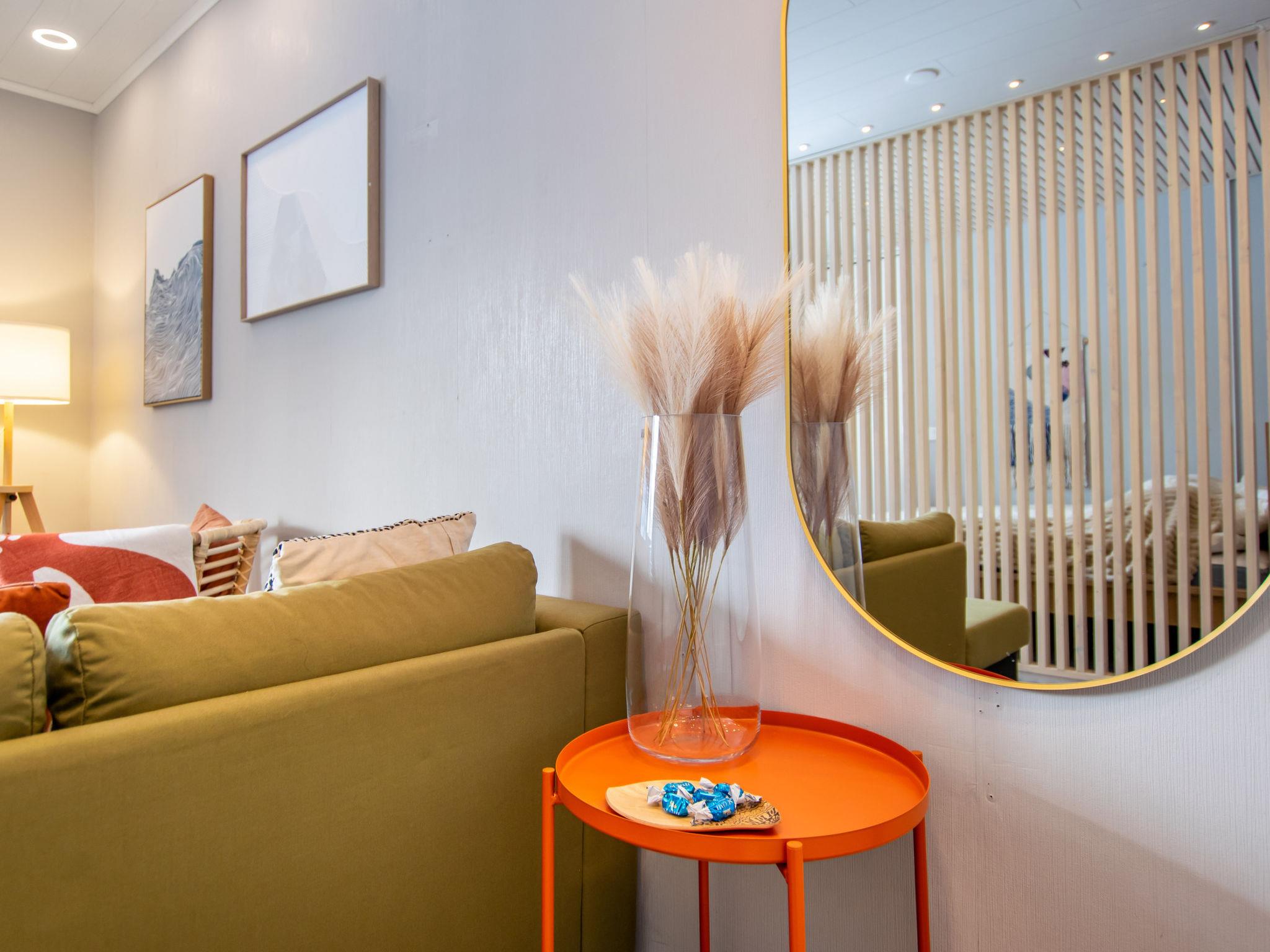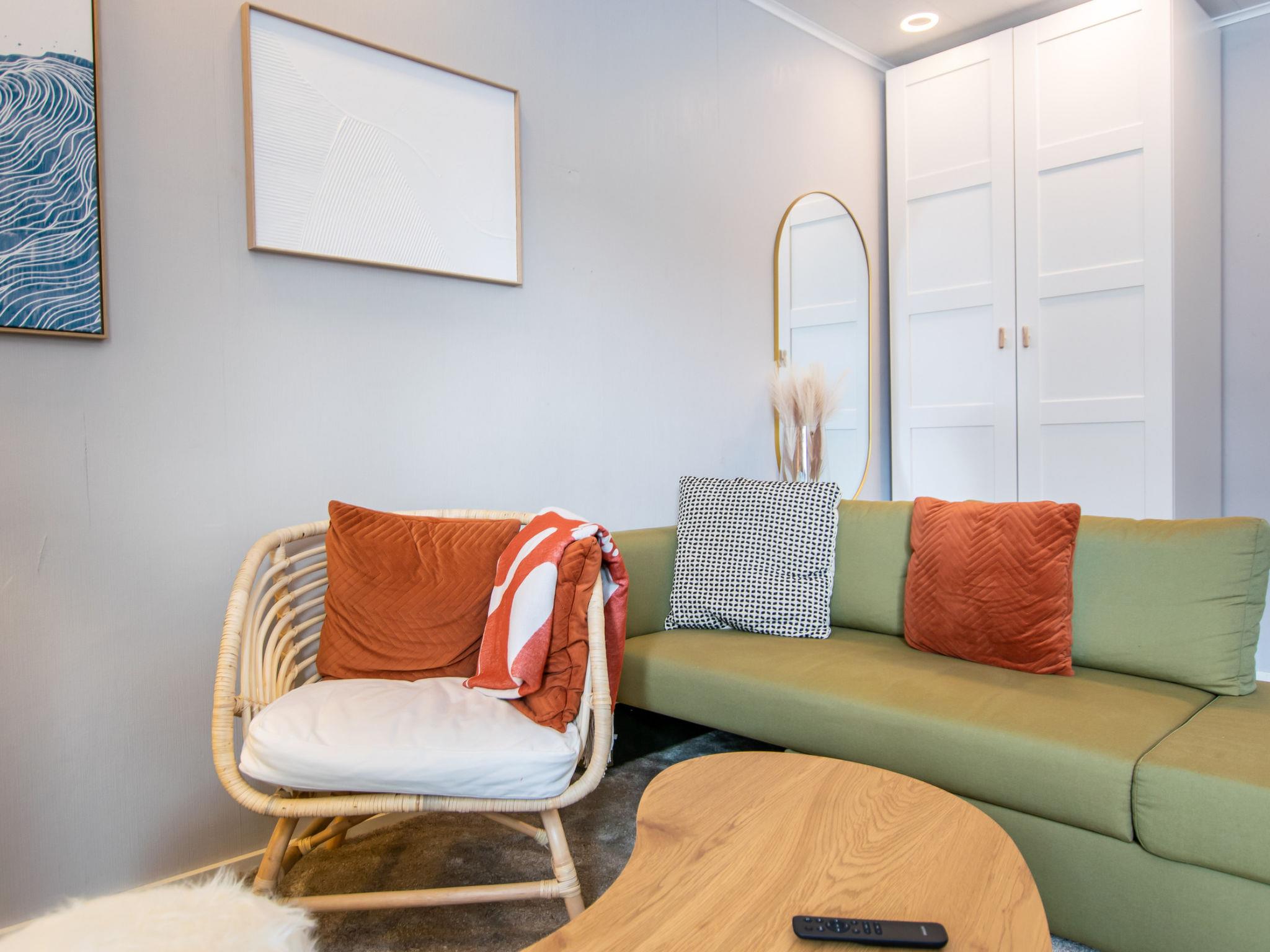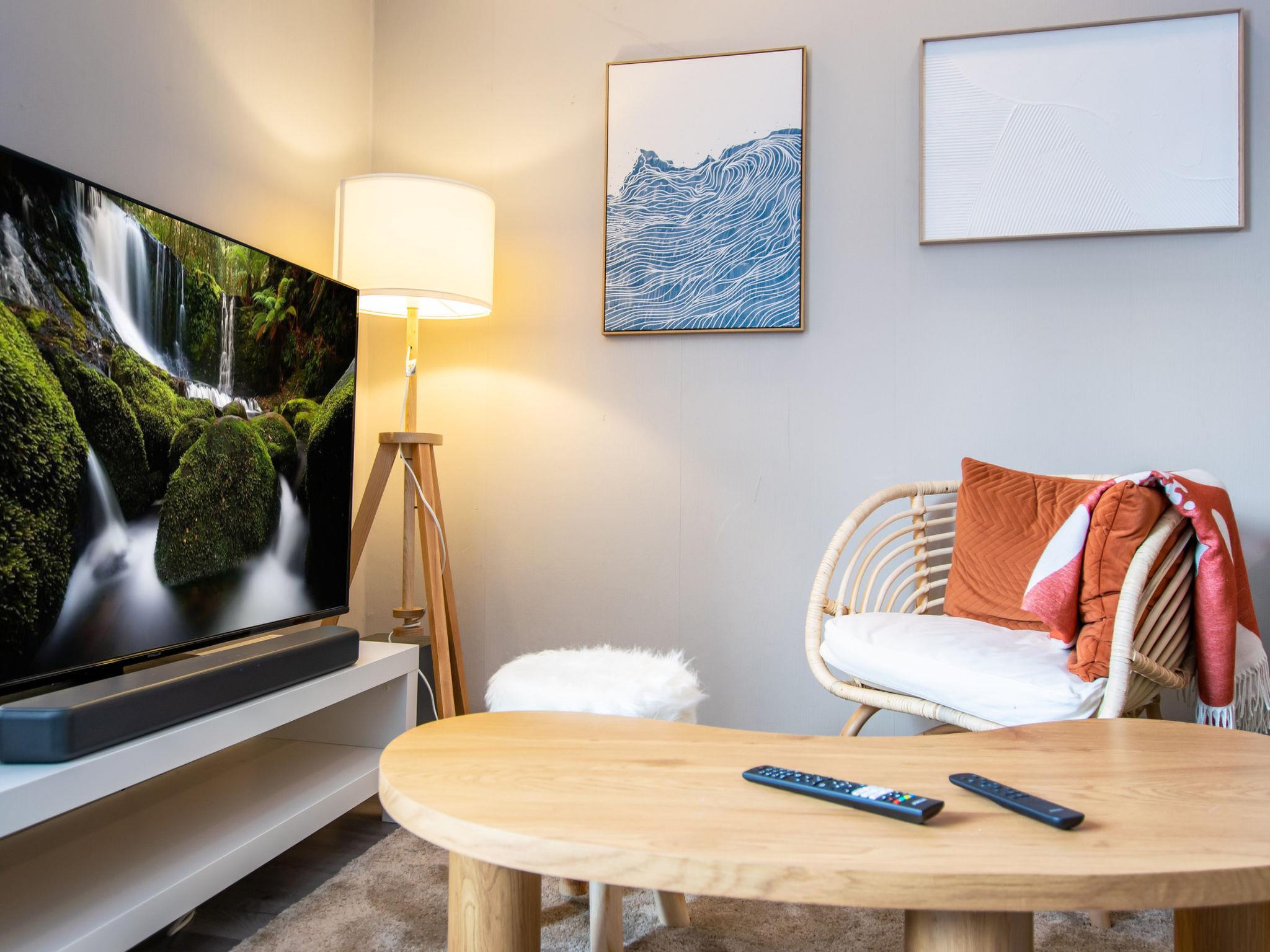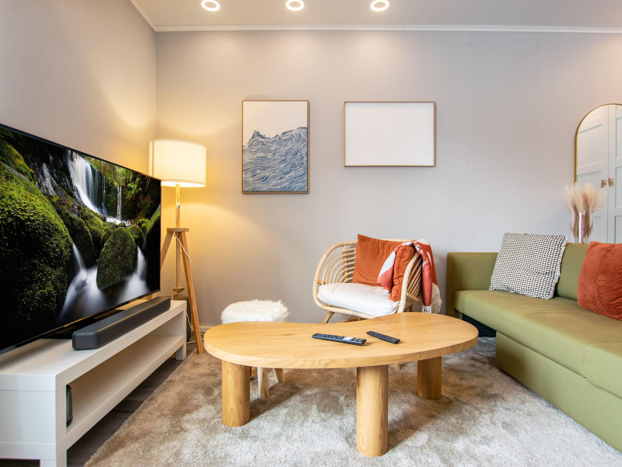 The living room features a sofa, chair, wardrobe, large flat-screen TV, and a soundbar that allows for Bluetooth music playback. There is also a desk in the living room, along with a sleeping area separated by a slatted wall, which has a double bed measuring 160 x 200 cm. The sofa includes an additional bed for one, measuring 70 x 190 cm.