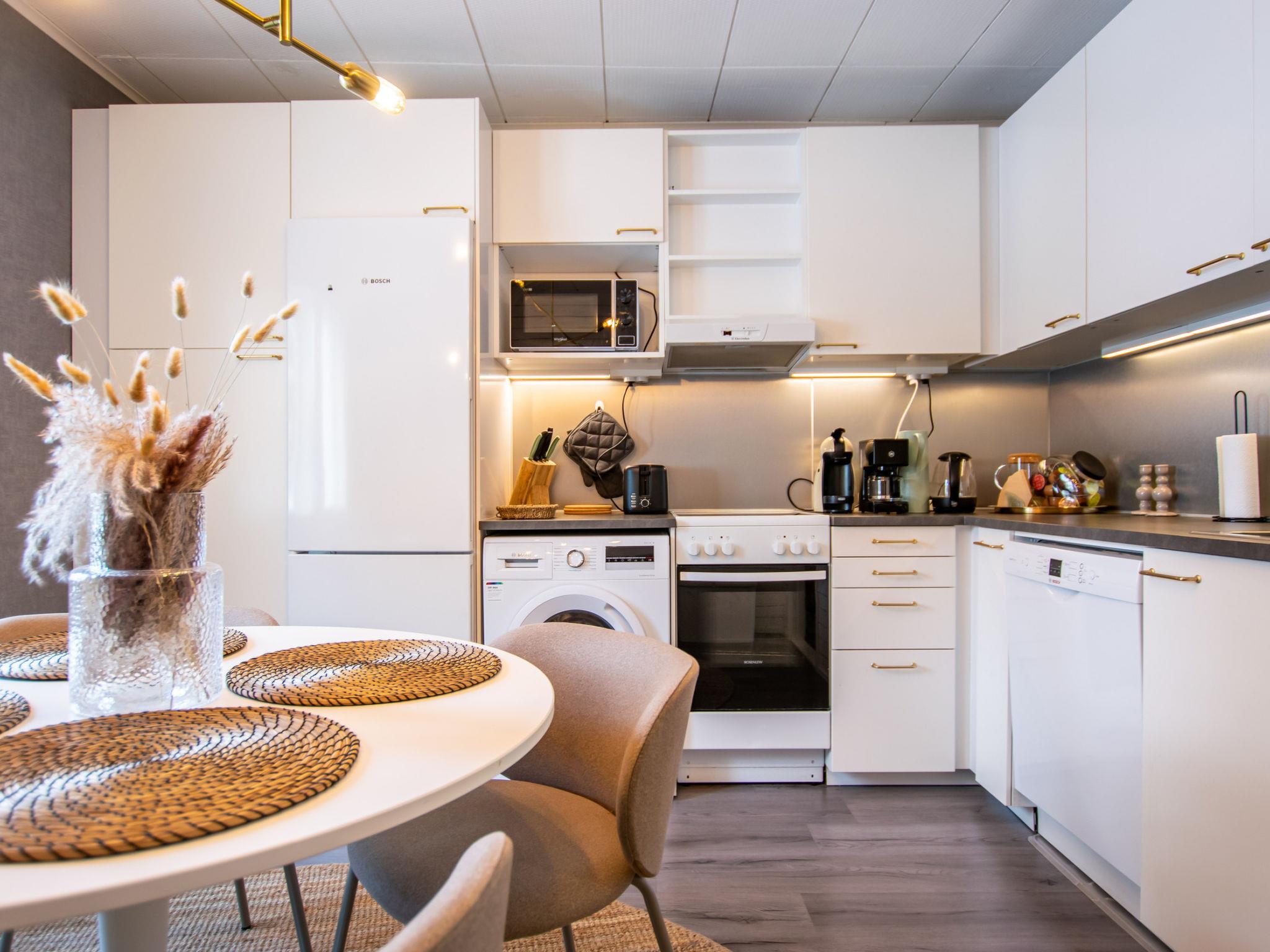 Spacious and well-equipped kitchen with a ceramic stove, extractor hood, dishwasher, washing machine, dining area for four, and sufficient dishes.
