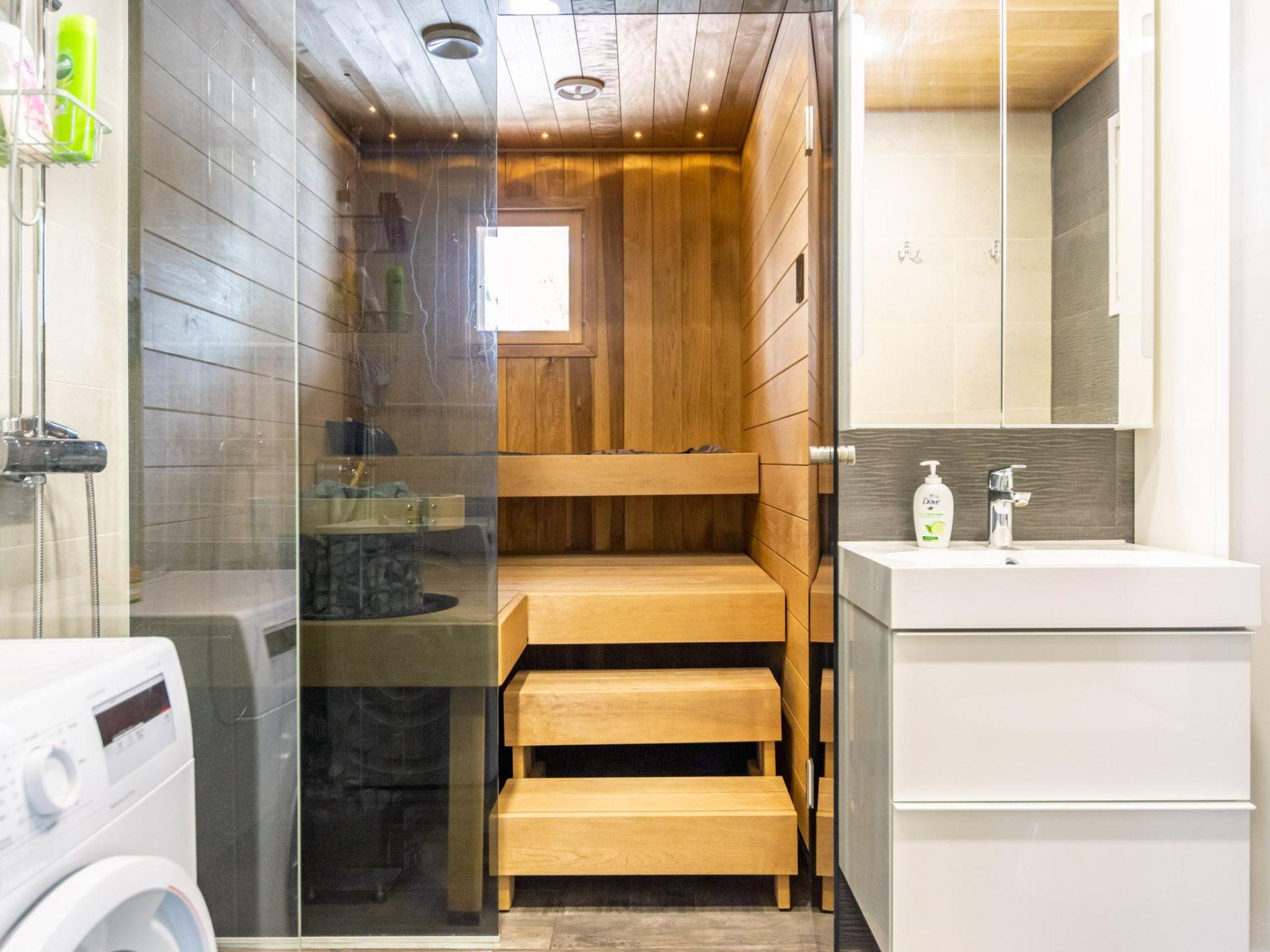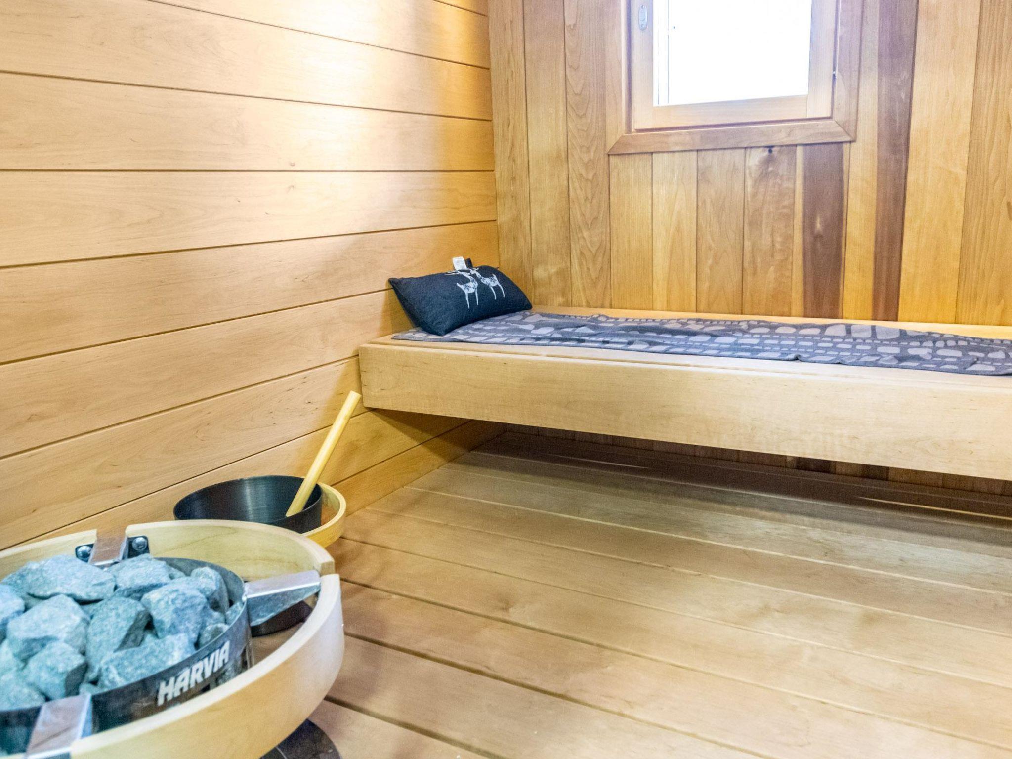 The lakeside sauna has a wood-burning sauna stove, dressing room/living area with a small kitchen (fridge, microwave, coffee maker), fireplace and loft.