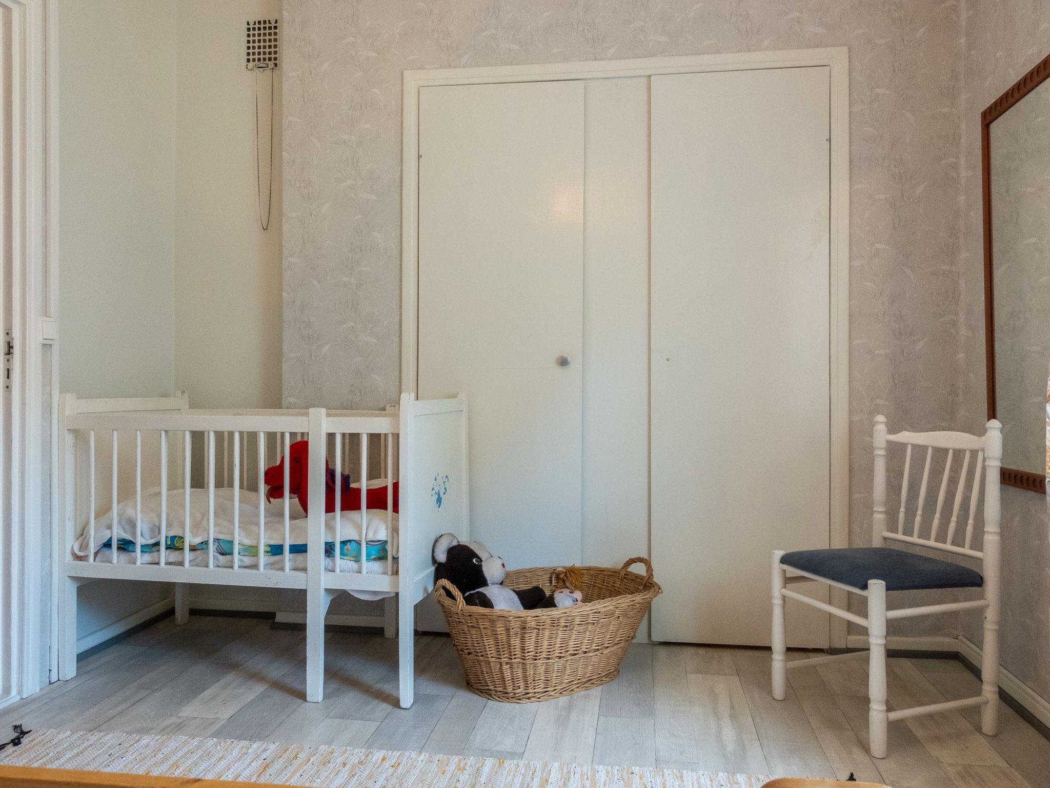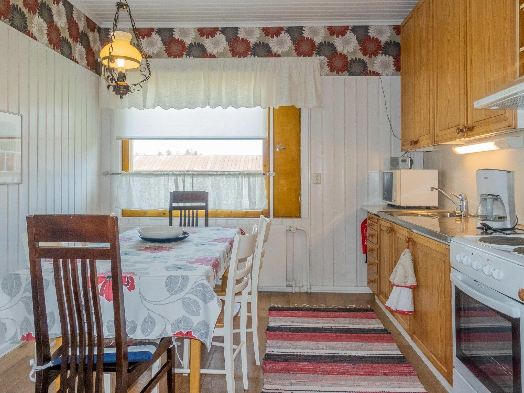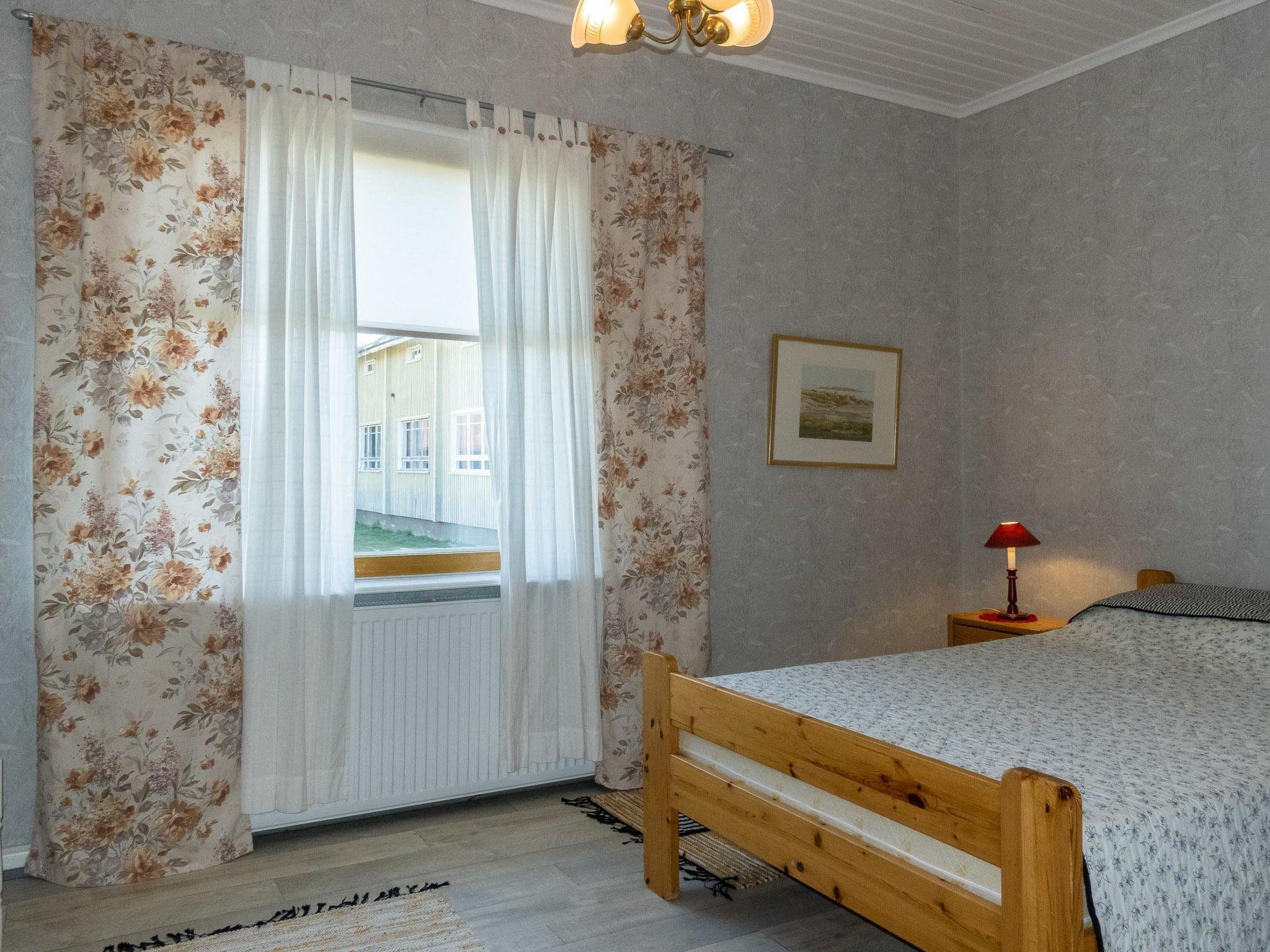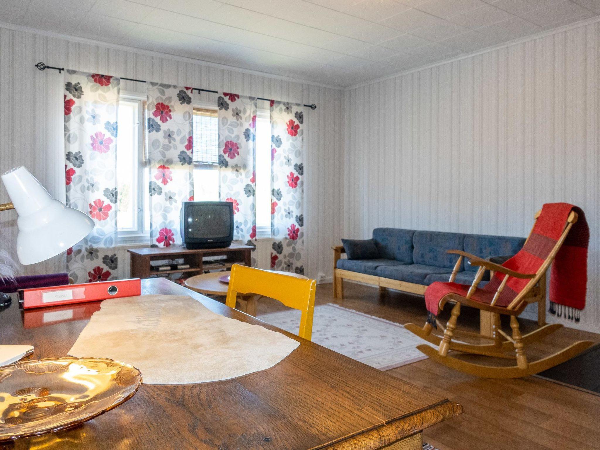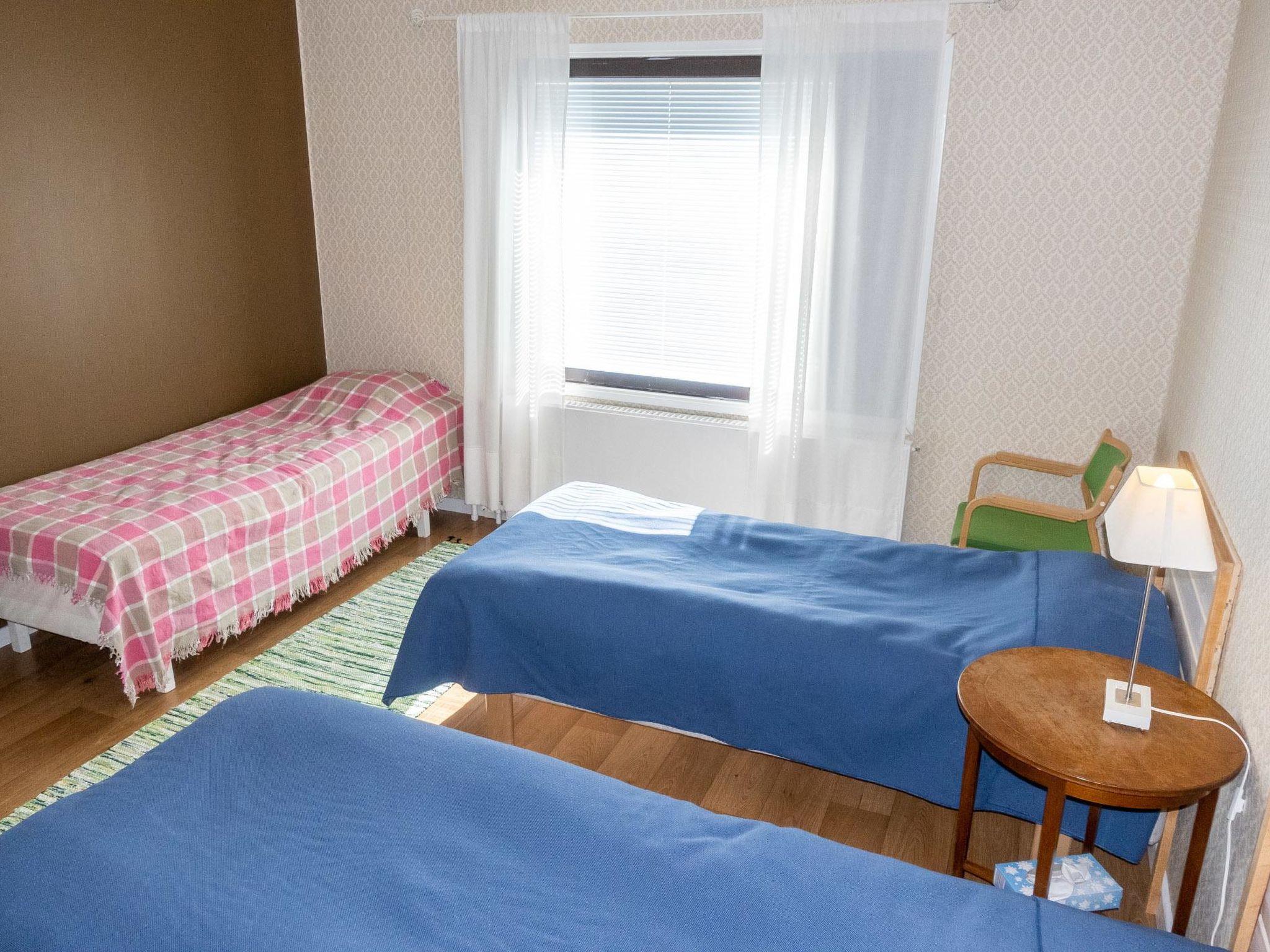 Gable apartment in a row house containing three apartments in total. The house is log-built (board lining, interior walls partially covered), former apartment in village school building, built in 1947 and renovated in 2015.