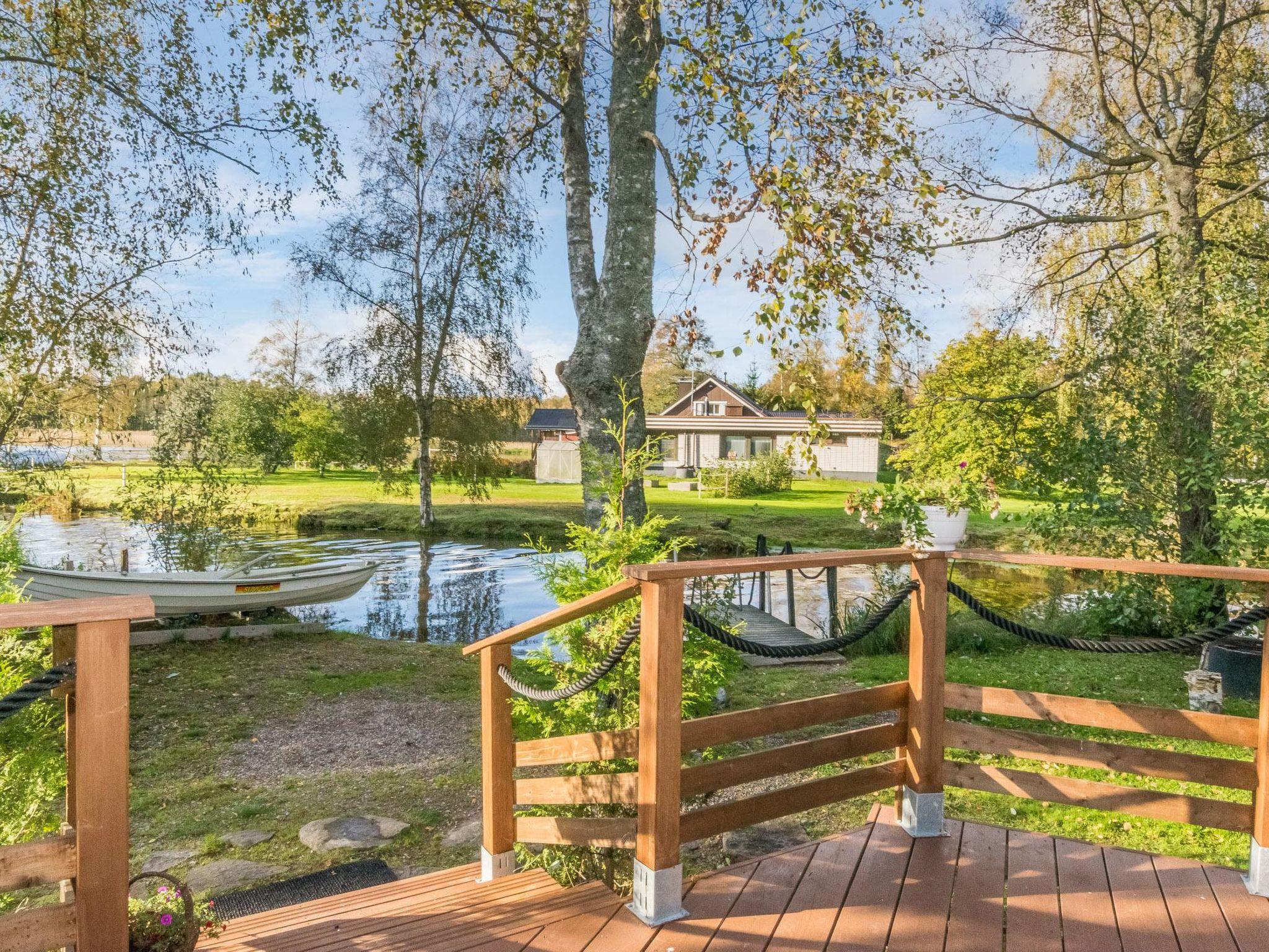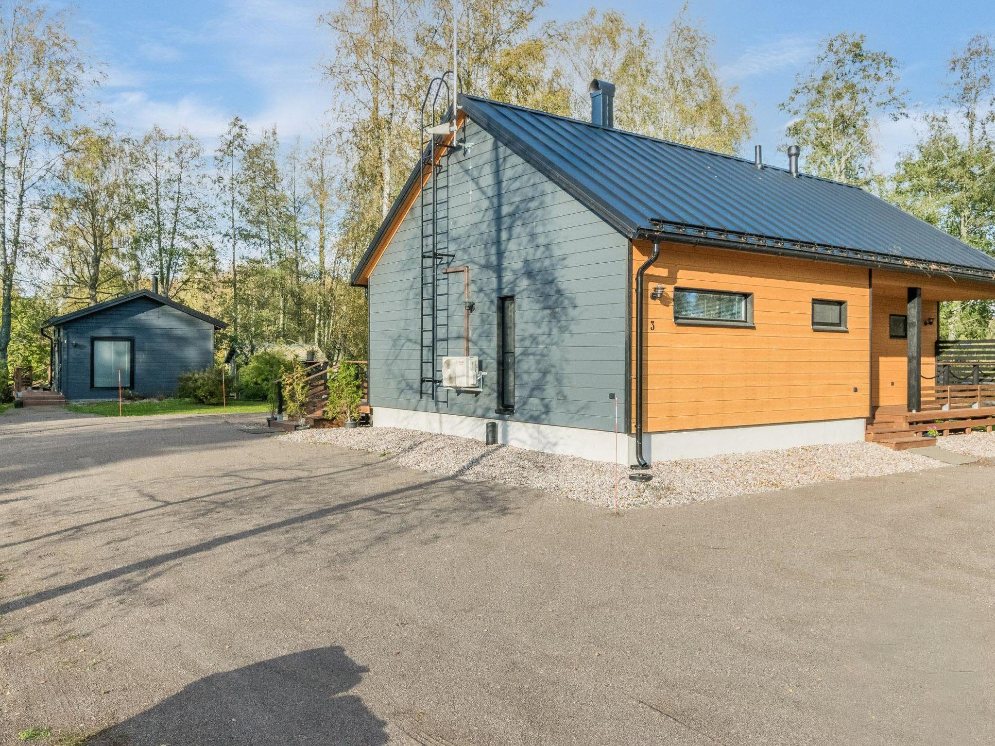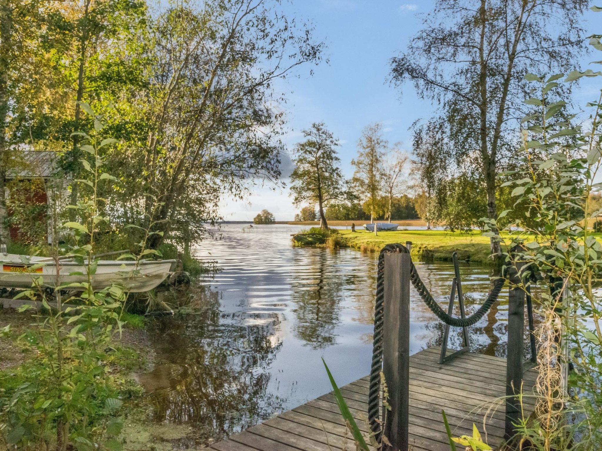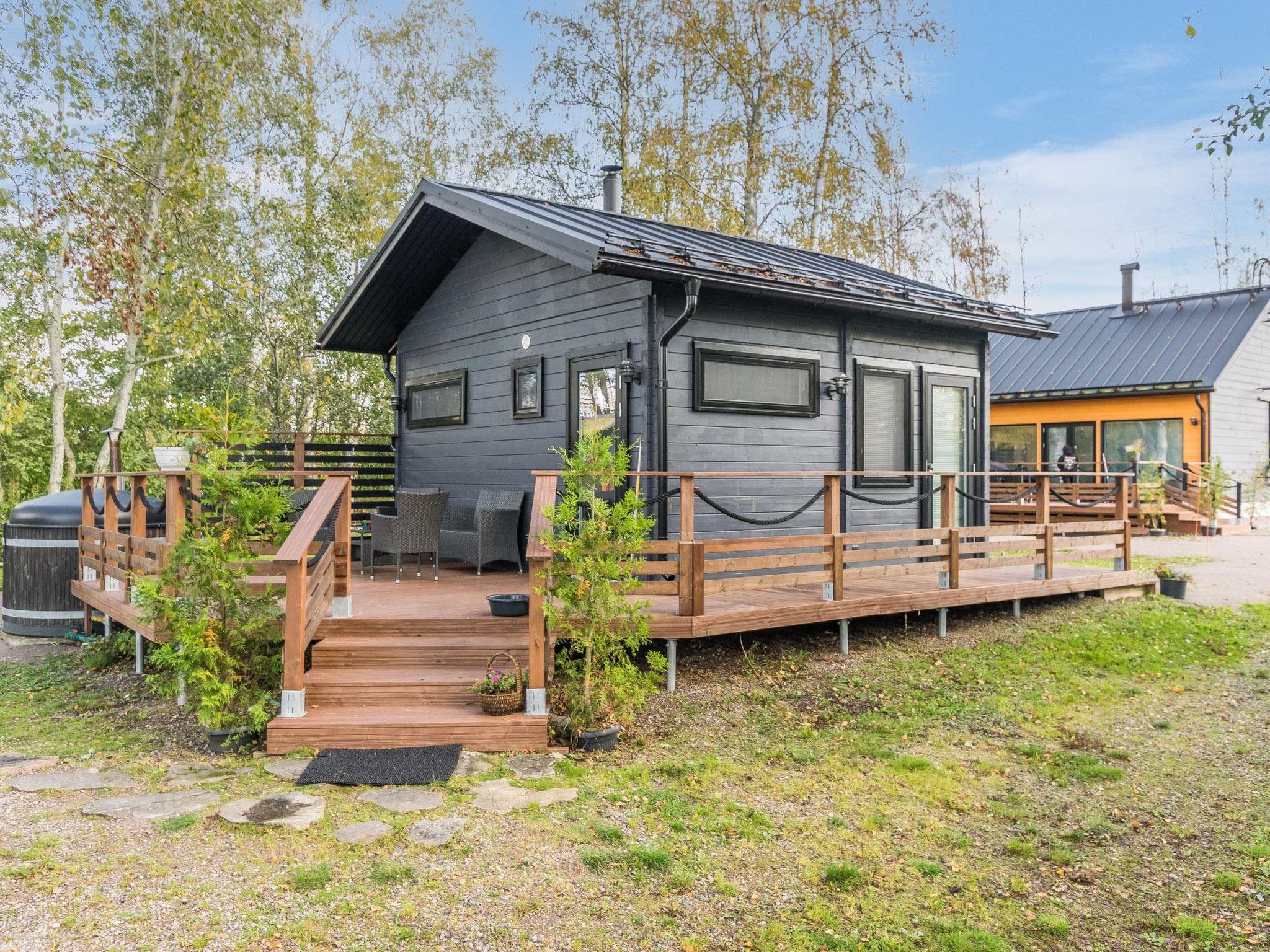 70 km to the north from Turku, Lake Pyhäjärvi 30 m, shallow sandy riverbank, a small pier, and a rowing boat. Wooden cabin (built in 2021), combined living room and kitchen, two bedrooms; one with a double bed, and the other with a bunk bed where the lower bed is 160 x 200 cm and the upper bed is 140 x 200 cm. The living room has a sofa bed that can be extended to a size of 140 x 190 cm. The cabin also features a utility room with a washing machine and WC/shower room with two showers. The living room has an air-source heat pump for cooling/heating.