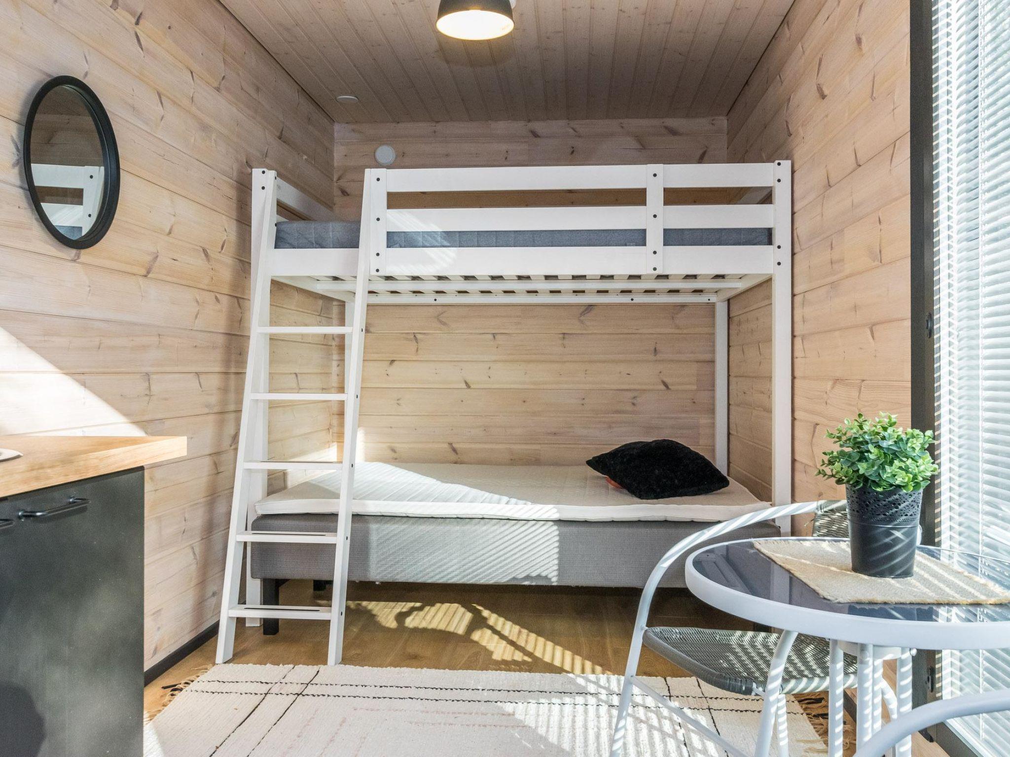 The lakeside sauna has a separate room with its own water point and refrigerator. In the room, there is a bunk bed. The lower bed is 160 x 200 cm and the upper bed is 140 x 200 cm. The sauna has a wood-burning sauna stove, and from the sauna window, there is a view of the beach. The terrace is equipped with outdoor furniture and a wood-heated hot tub available for an extra fee.