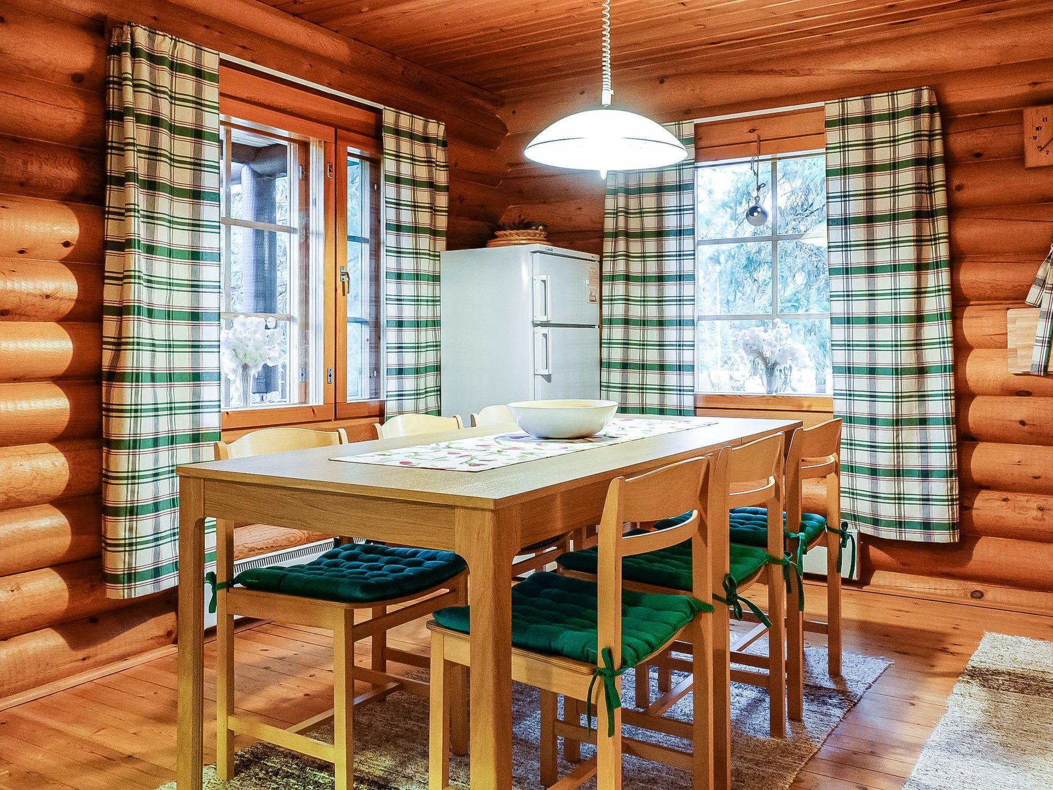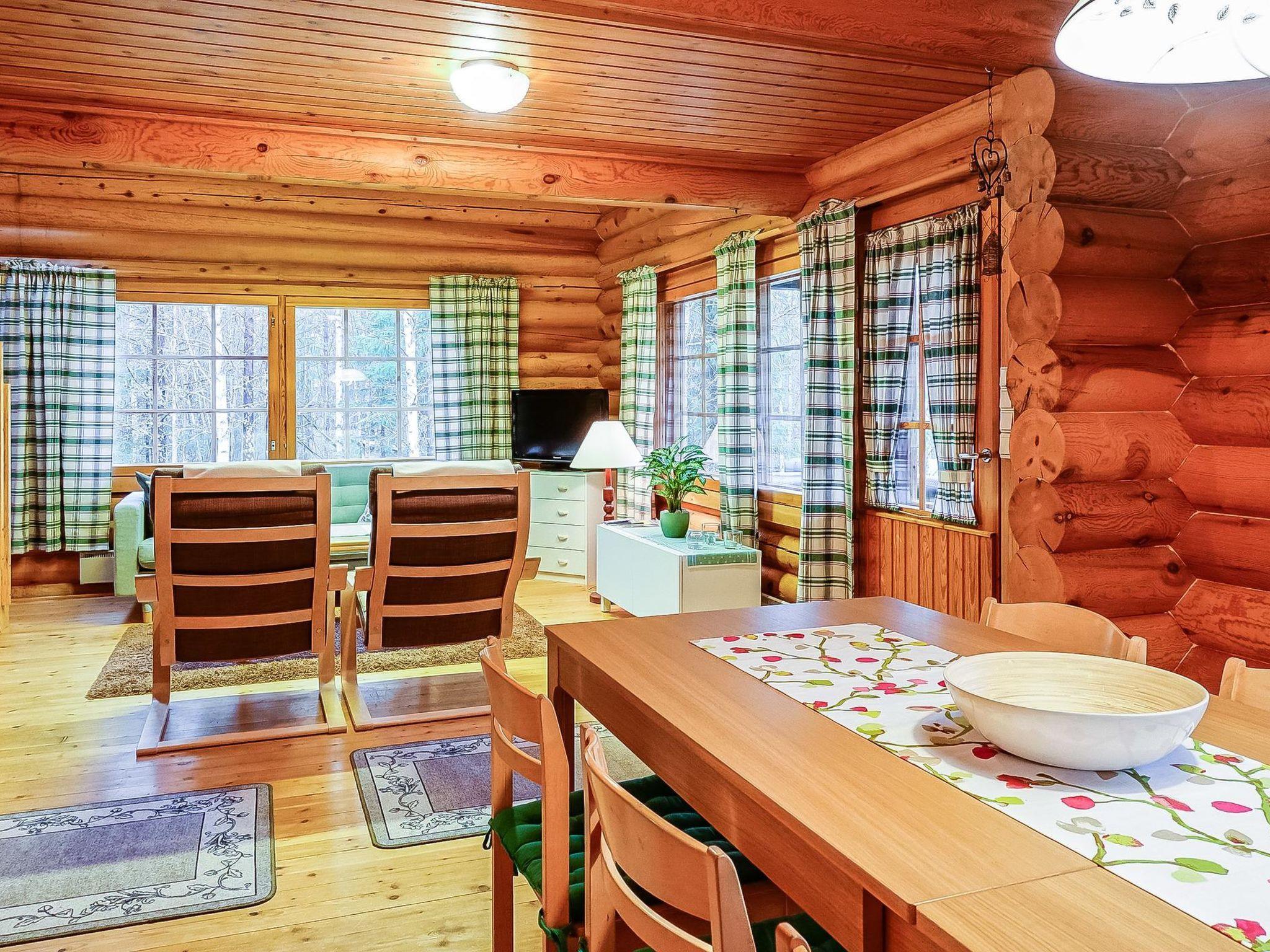 Round log cabin, built in 1990. Living room/kitchen, bedroom with double bed, loft with 4 beds and living area, sauna, washroom, separate WC, covered porch, terrase and balcony. Gas grill use for summer time. Outdoor storage for firewood and for skies (there's also a ski waxing stand).