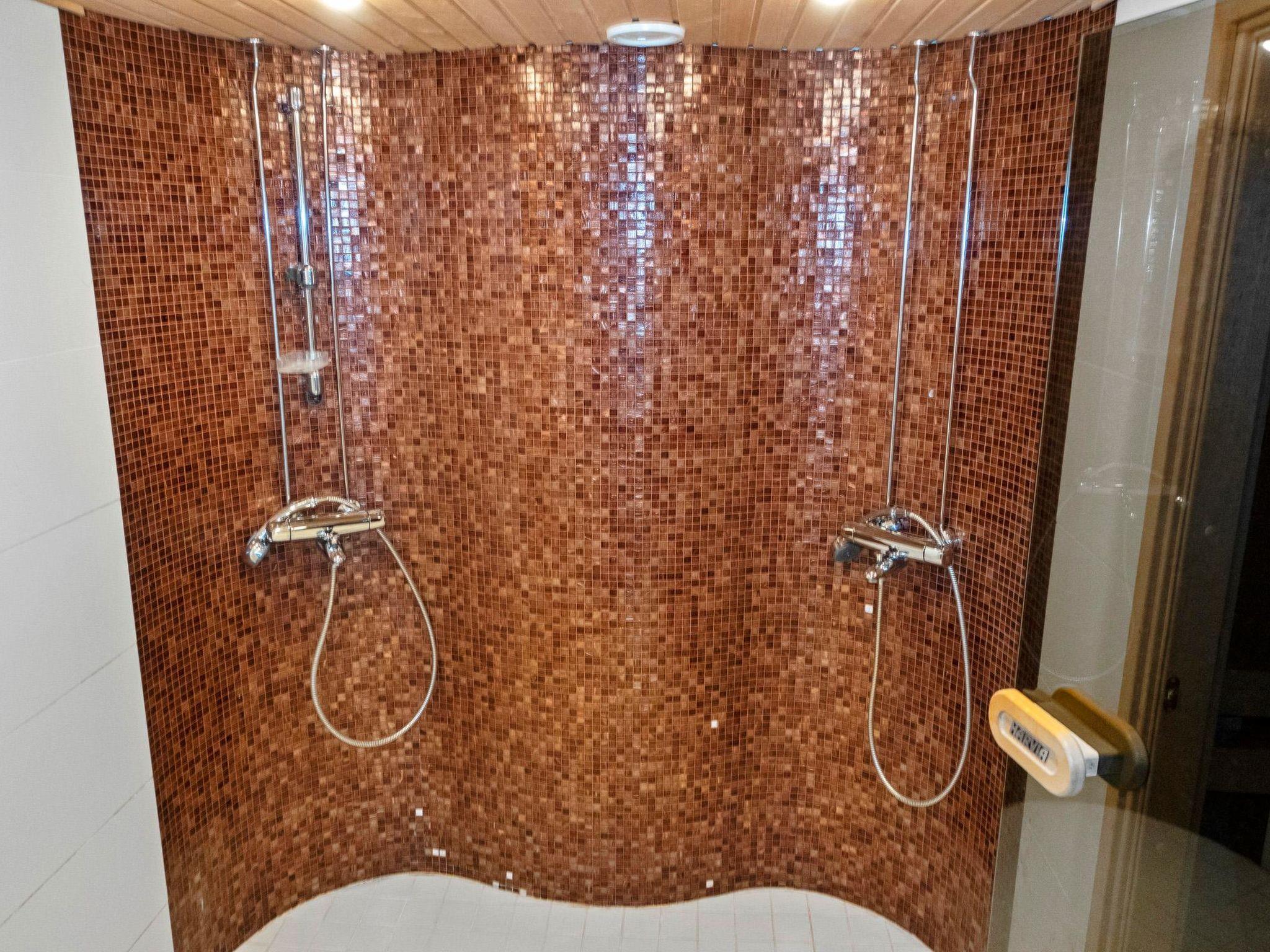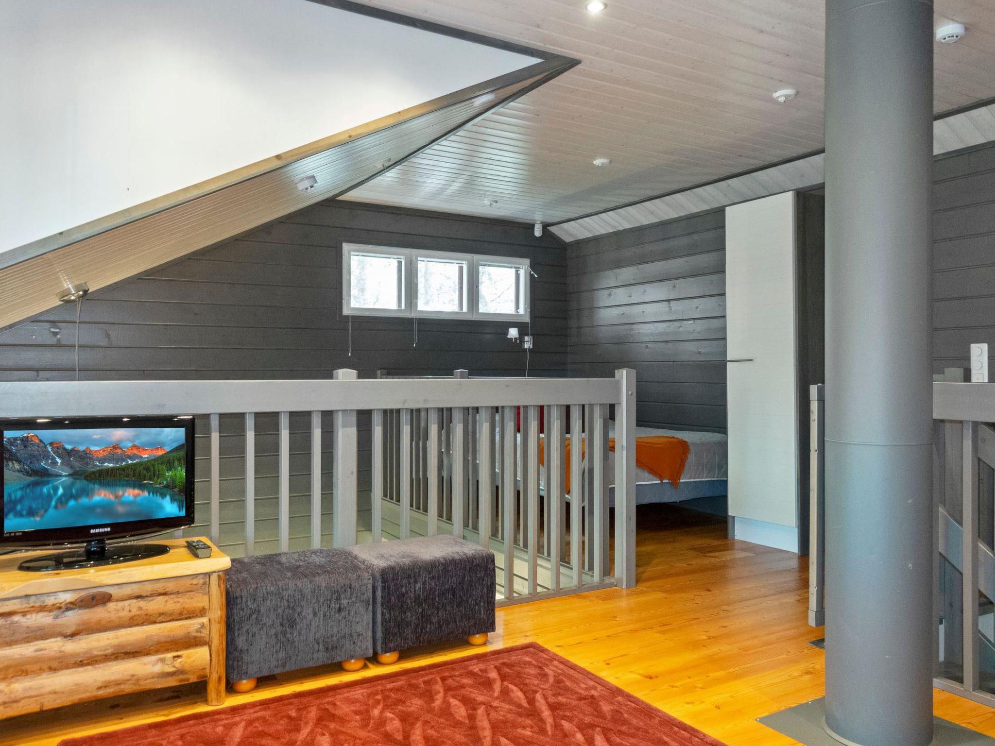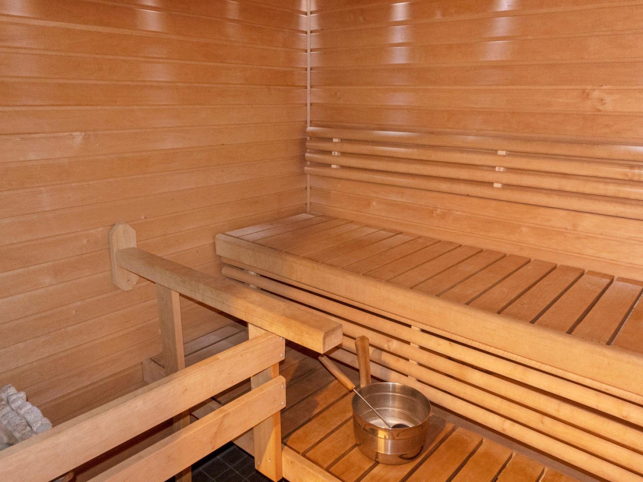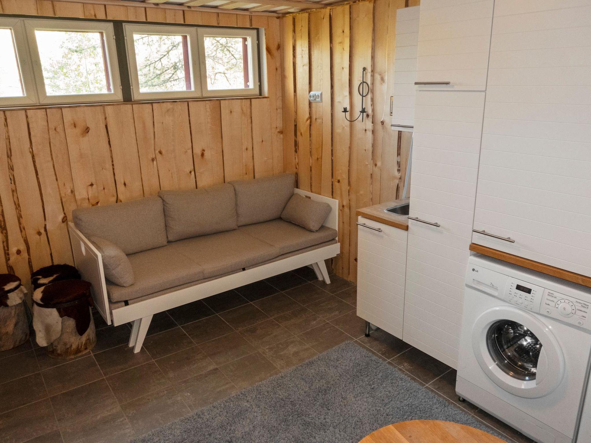 On the ground floor there is sauna, washroom, bedroom with 2 beds (no window), living area/utility room, spreadable sofa and separate WC. Exit to the outside and also to the garage.