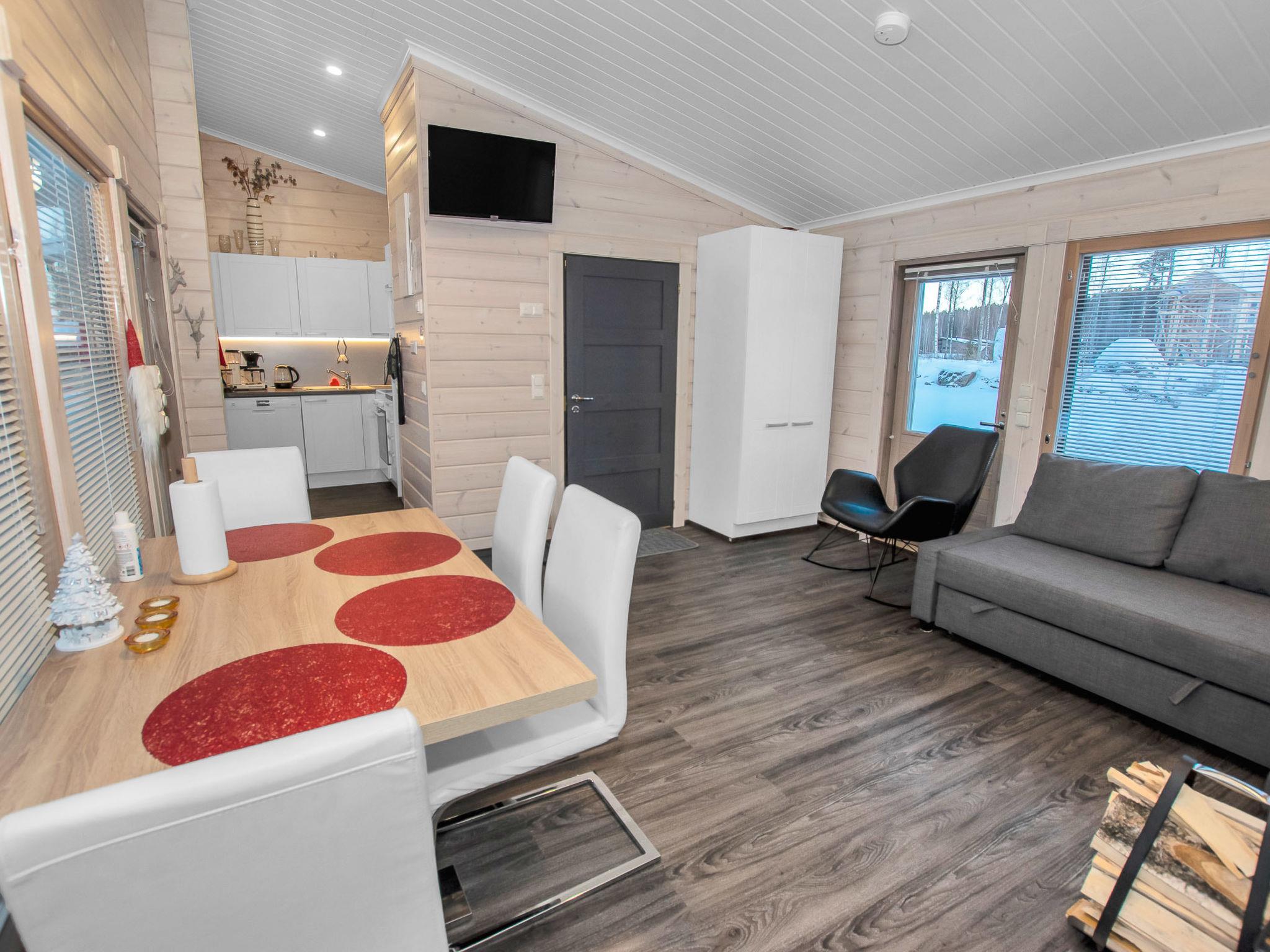 The cabin has well-equipped kitchen, living area with spreadable sofa bed and bedroom with double bed.