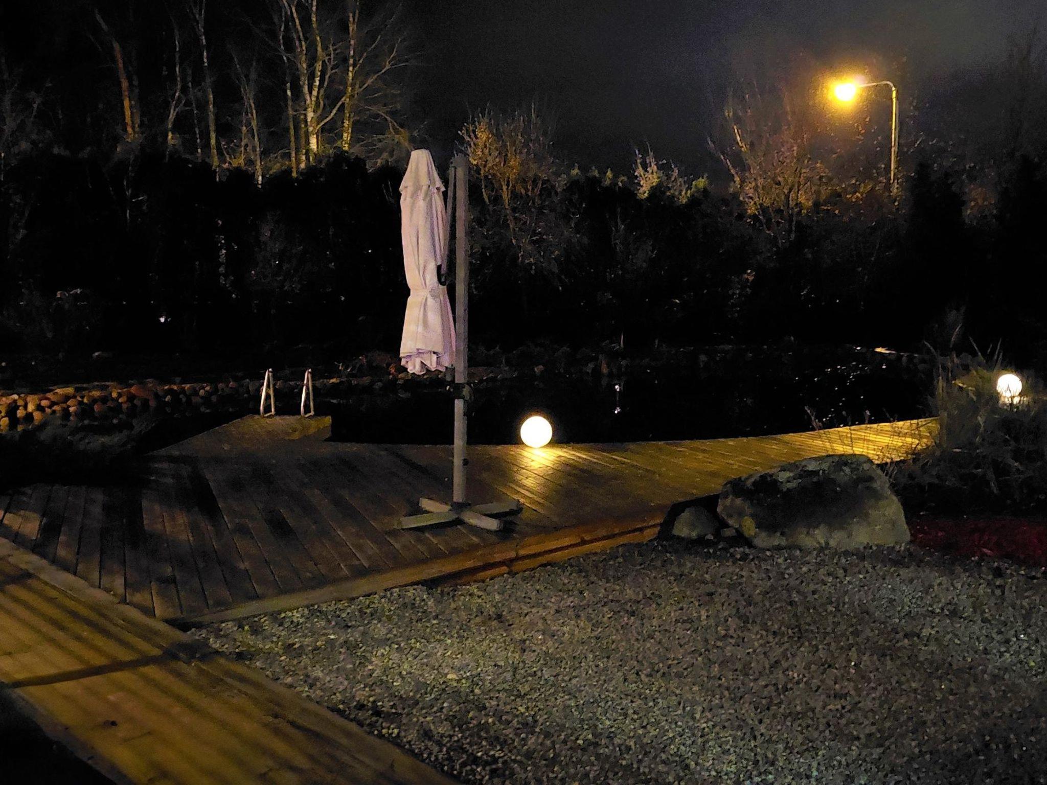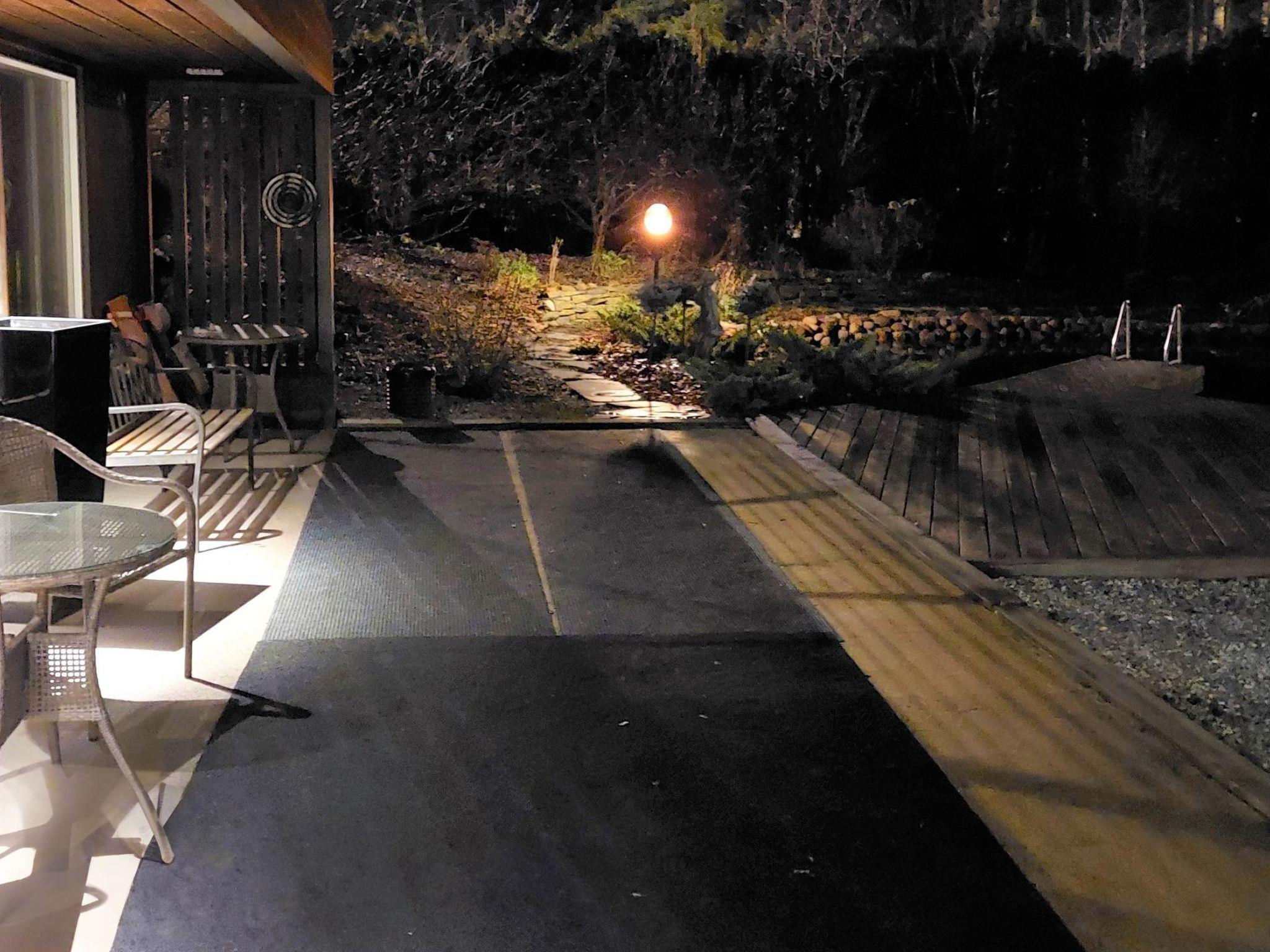 Outside, there is a swimming pool lined with a waterproof membrane, measuring approximately 18 x 8 x 1.4 m. A smaller section serves as an overflow pool that is not intended for swimming. The pool edges are lined with loose, round natural stones, and the pool bottom is covered with a rubber membrane. The outdoor pool is available during the warm season.