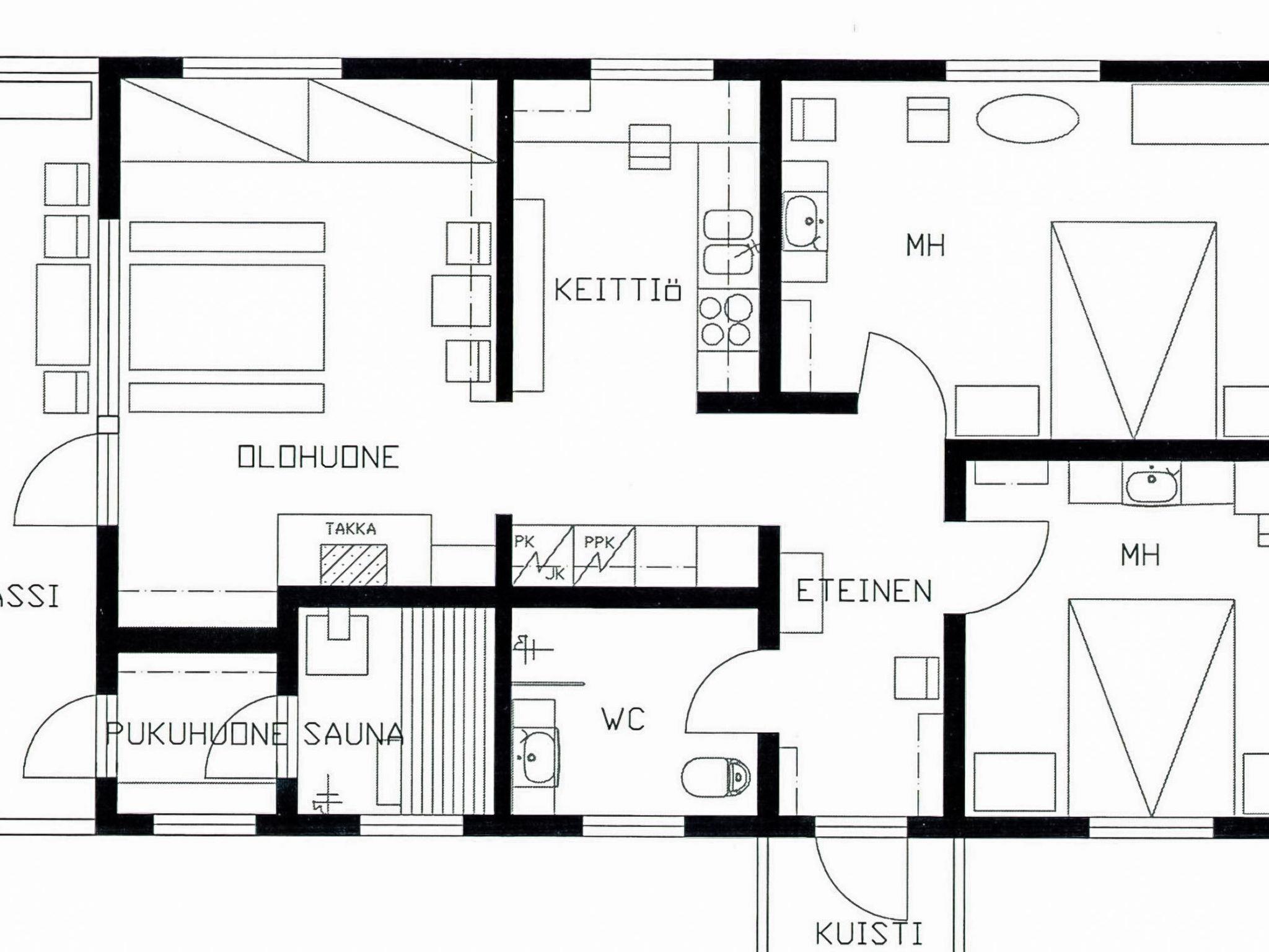 Cottage for 4-6 people on a spacious plot, at the end of a cottage road, with a sunny yard and beach. Partially covered terrace facing the lake for evening sun. Two bedrooms, each with two beds. Kitchen, living room/dining area, toilet/shower room. 2 extra beds in the living room. Access to the sauna via the terrace, dressing room. The sauna has a wood-fired stove and a shower in the steam room.