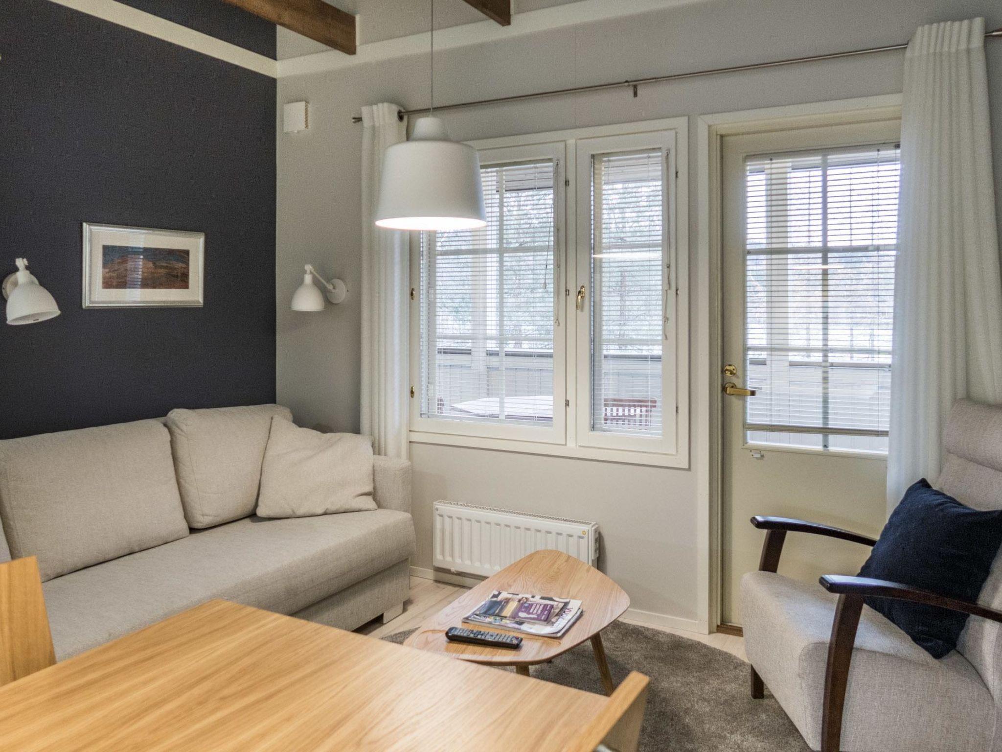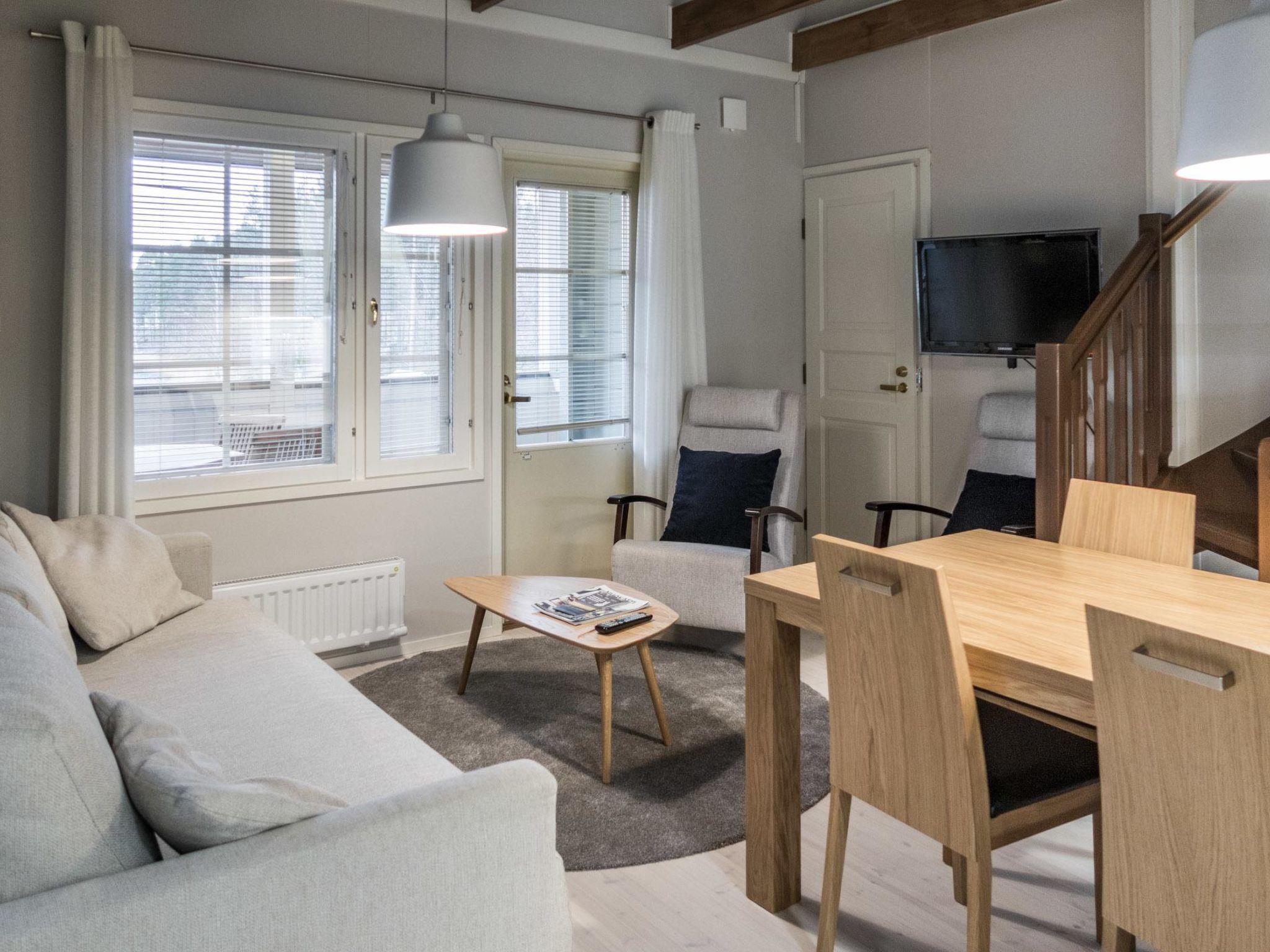 Mustikka - apartment is 40 m² + 15 m² balcony. There is a combination of livingroom/kitchen, with sofabed for 1-2 persons. One bedroom with separate beds for 2 persons. 2. floor is separate beds for two. Shower / toilet, sauna (electric heating), terrace. Shared swimming place, distance about 50 m.