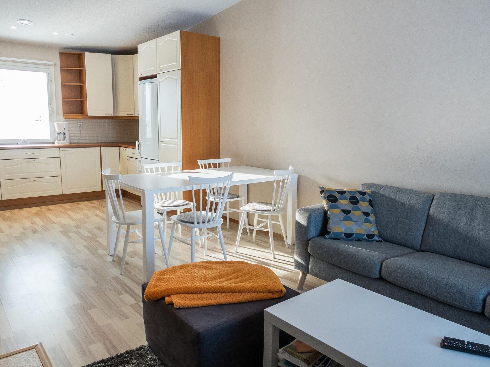 The total area of the apartment is 73 m², on one floor. Spacious living room/kitchen, dining group for 5 people, two separate bedrooms, one with a double bed (motor bed) and another with separate beds for 2. In addition, a folding bed/mattress as an extra bed, mainly for a child. Sauna (electric sauna stove), shower corner and utility room with access to the covered back terrace.