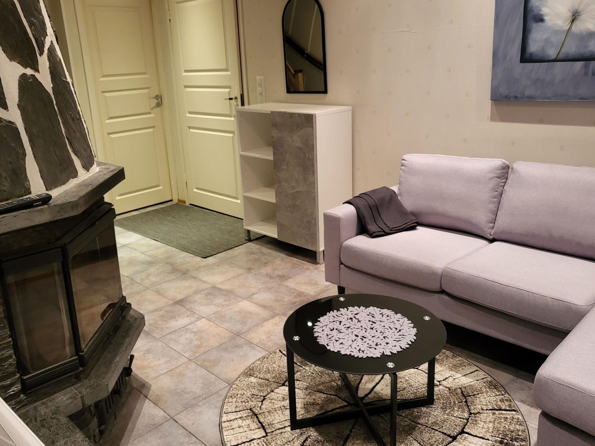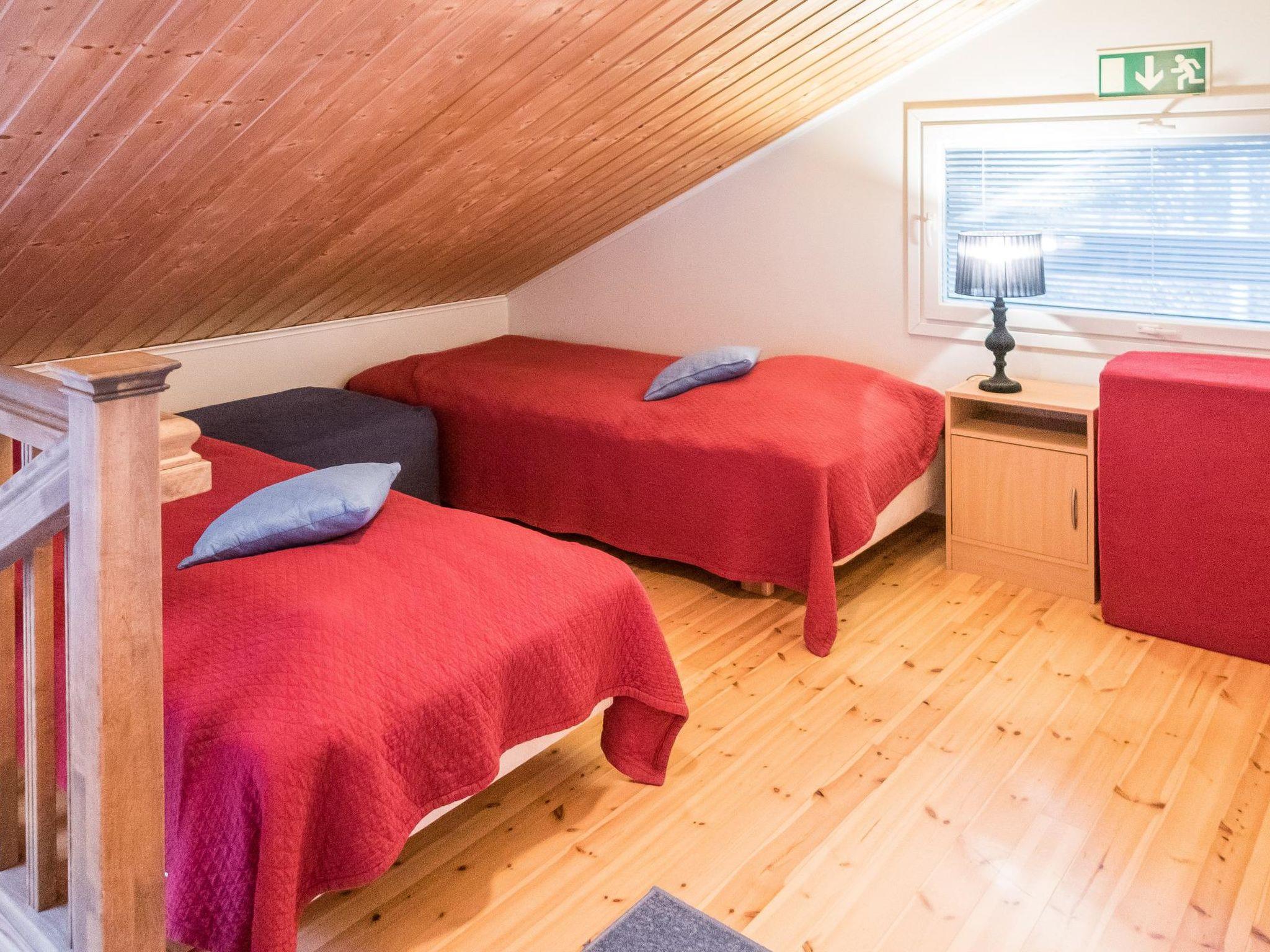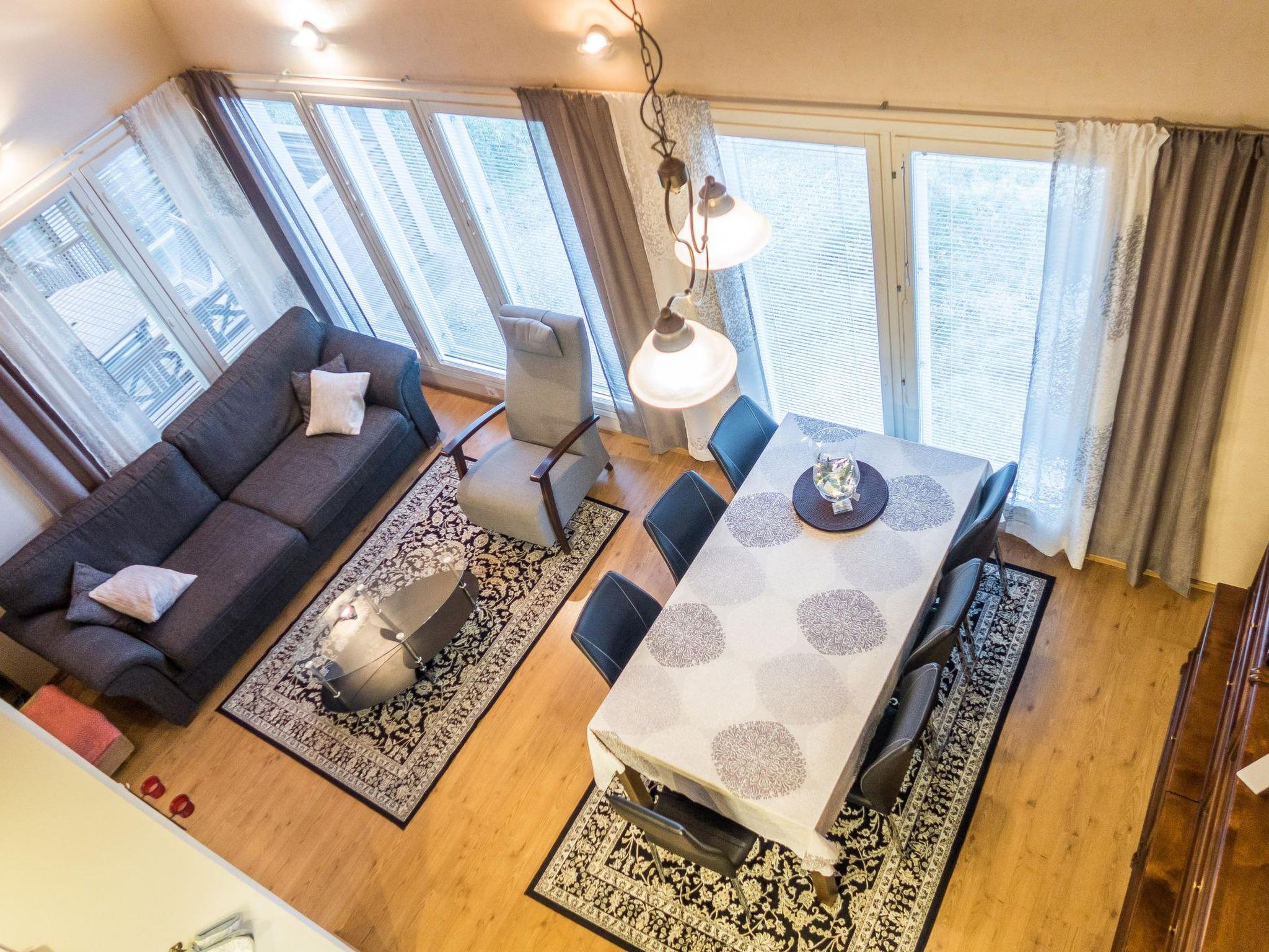 Total area approx. 112 m², on three floors. On the middle floor, an open kitchen and living room, a dining set for 6-8. A bedroom with a double bed (160 cm). Separate toilet. In the open loft, separate beds for 4 (2 x 80 cm and 2 x 110 cm beds), the loft is open space. On the lowest floor, a room with a fireplace, with a sofa bed for 1-2 as an alternative bed, and a bedroom with a double bed (160 cm). Washroom/toilet and sauna (electric stove), in addition a small utility room (washing machine, cleaning equipment). There is a drying cabinet in the airing cupboard downstairs. In connection with the middle floor, a terrace/balcony with garden furniture and an electric grill (in use during the summer).