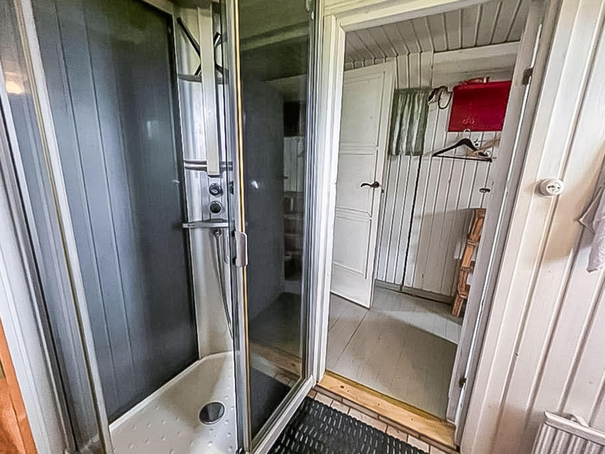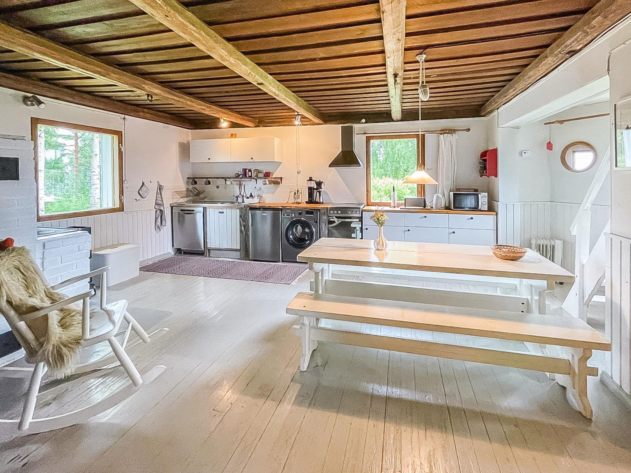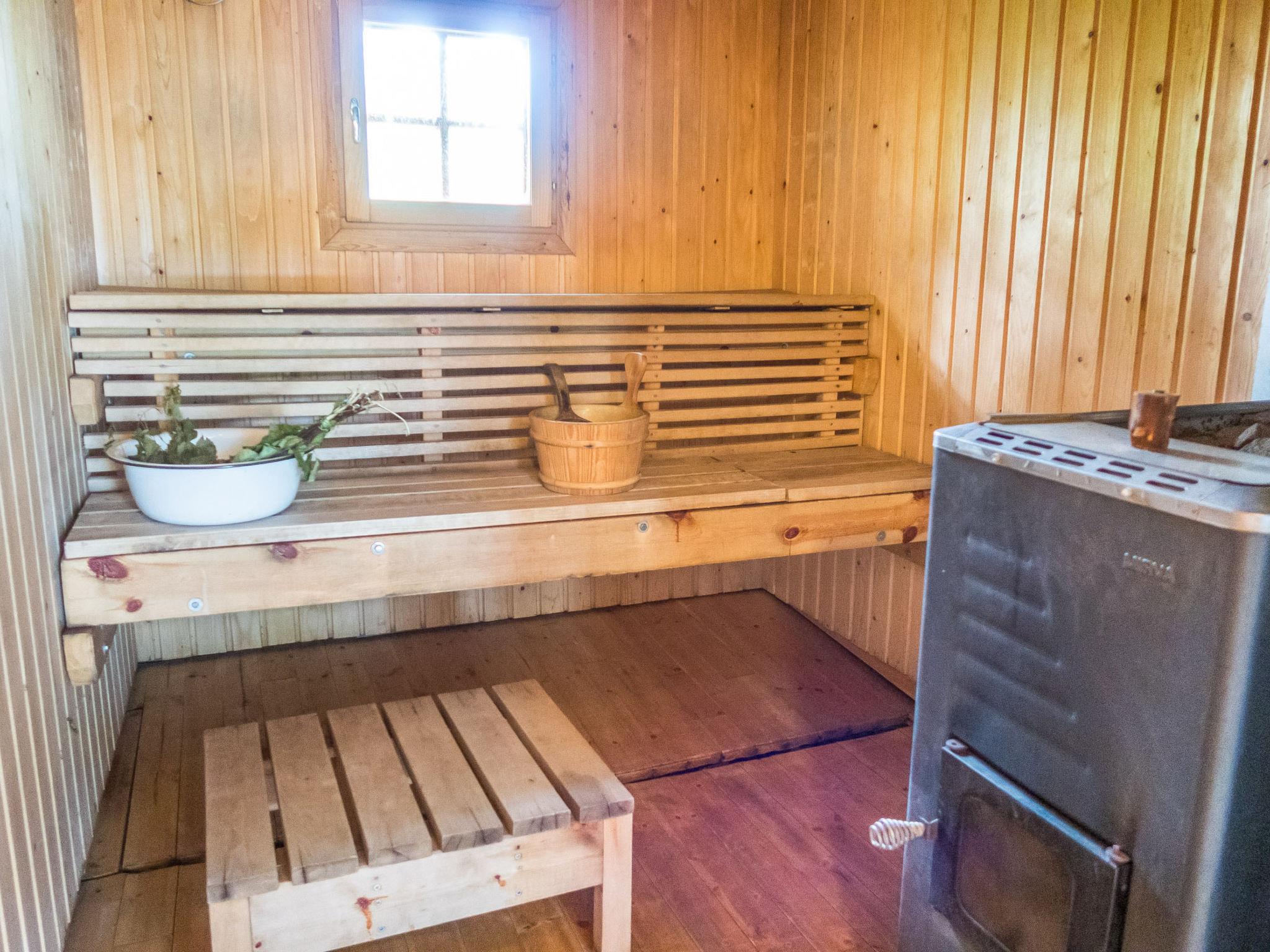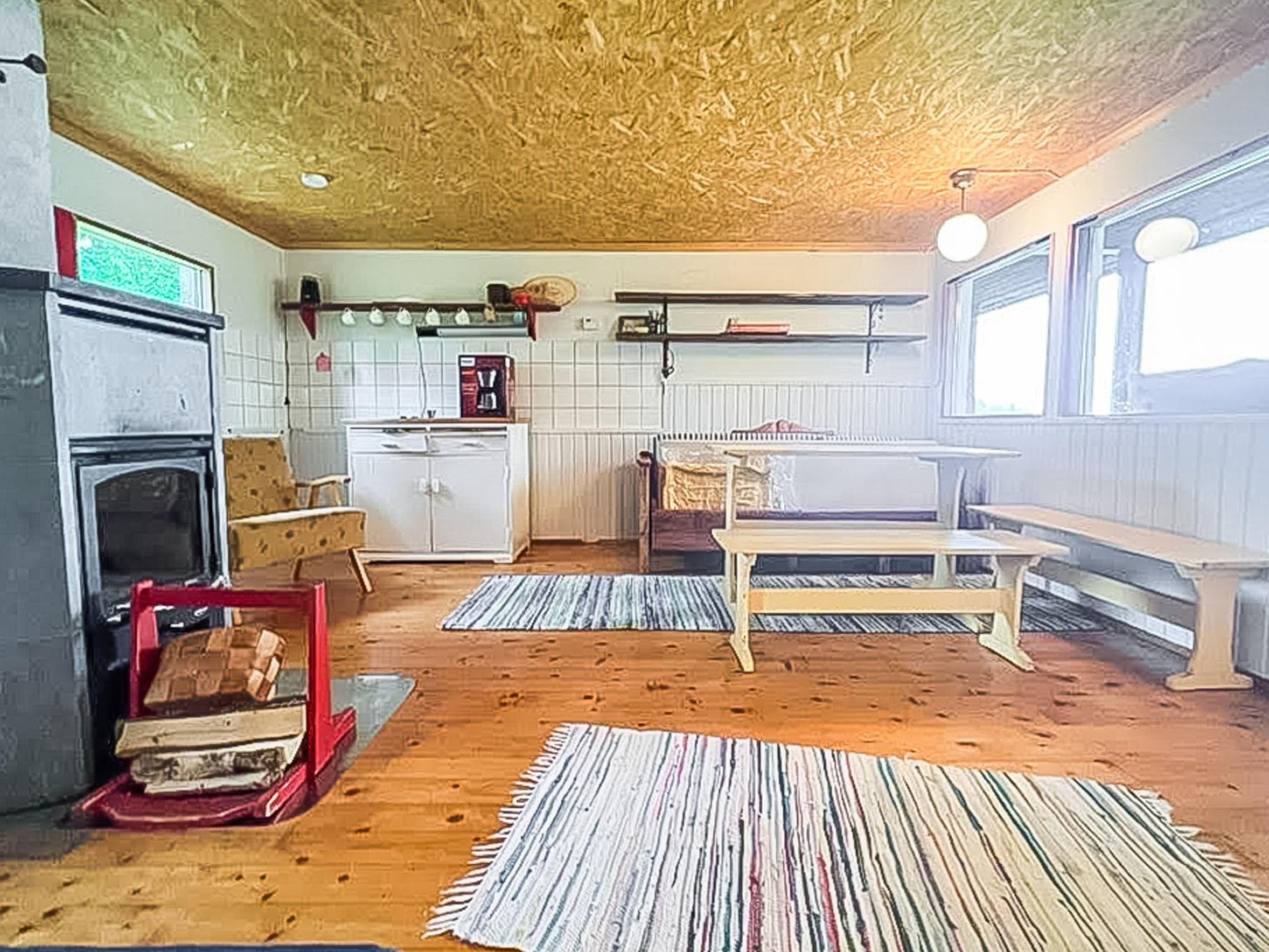 The area of ??the main building is 100 m² on two floors (ground floor 57 m², upper floor 43 m²). A spacious room with a large oven / stove, a dining table for 6-8 people. A sofa and TV in the side room. Access from the kitchen to the upper floor, where there are two bedrooms, both with separate beds for 2. Living room has divan sofa for 1-2 guests in the downstairs living room. In the main building there is a toilet/shower and a small electric sauna.