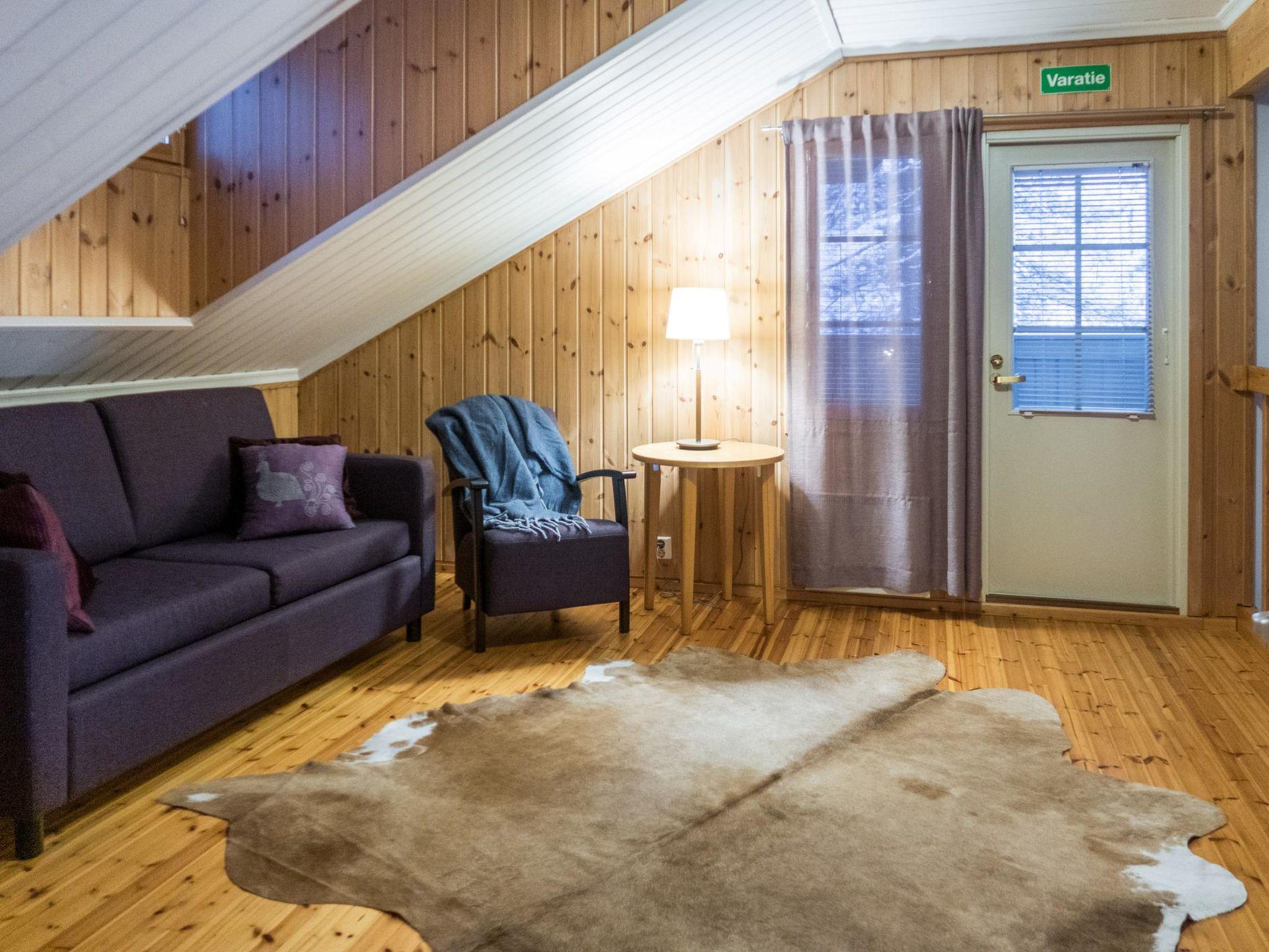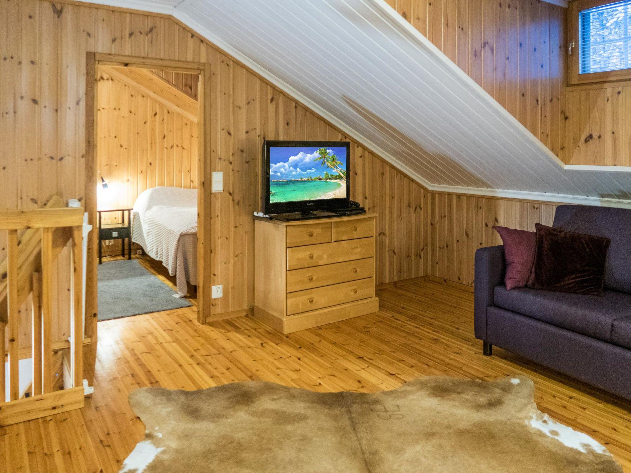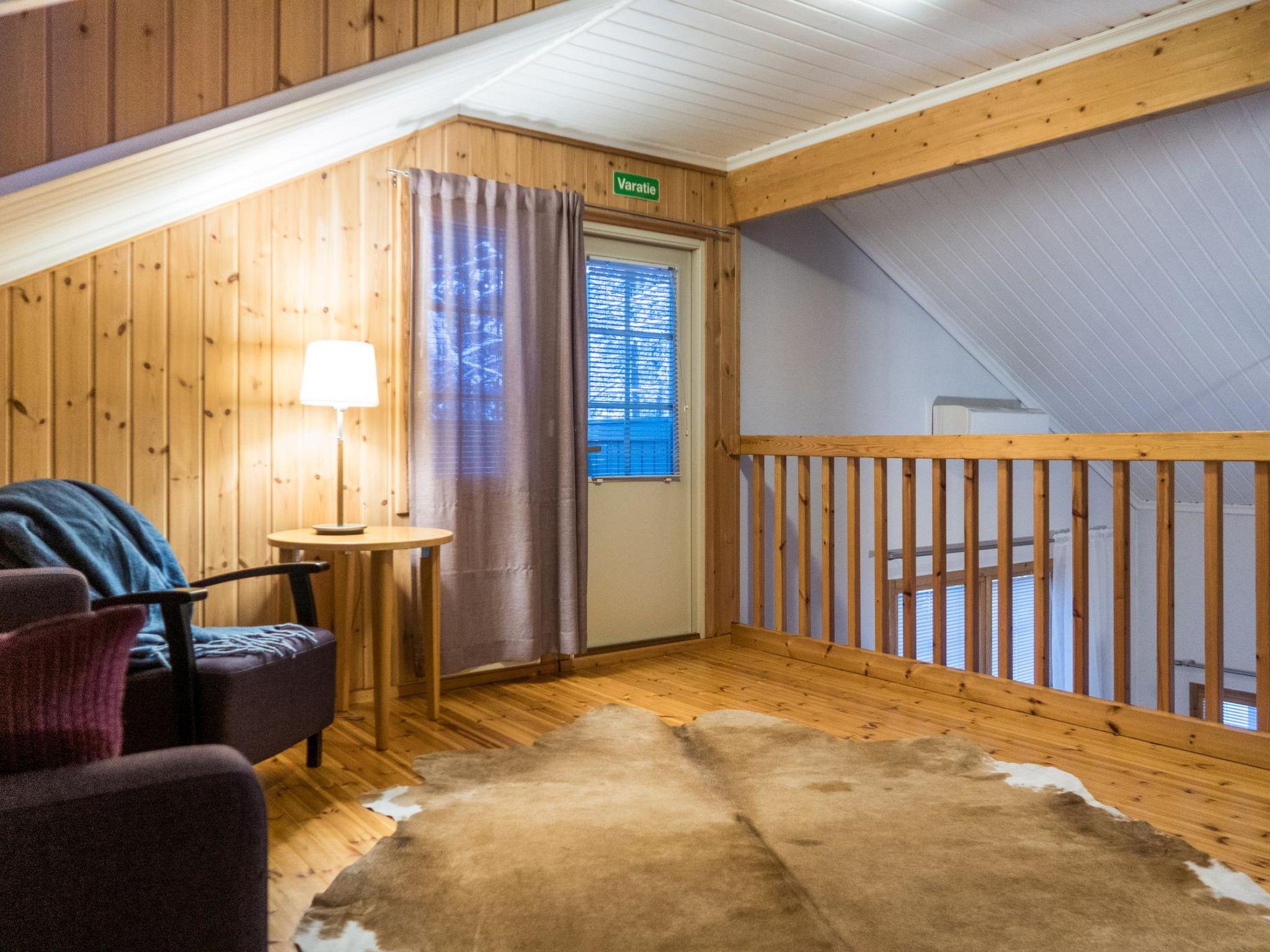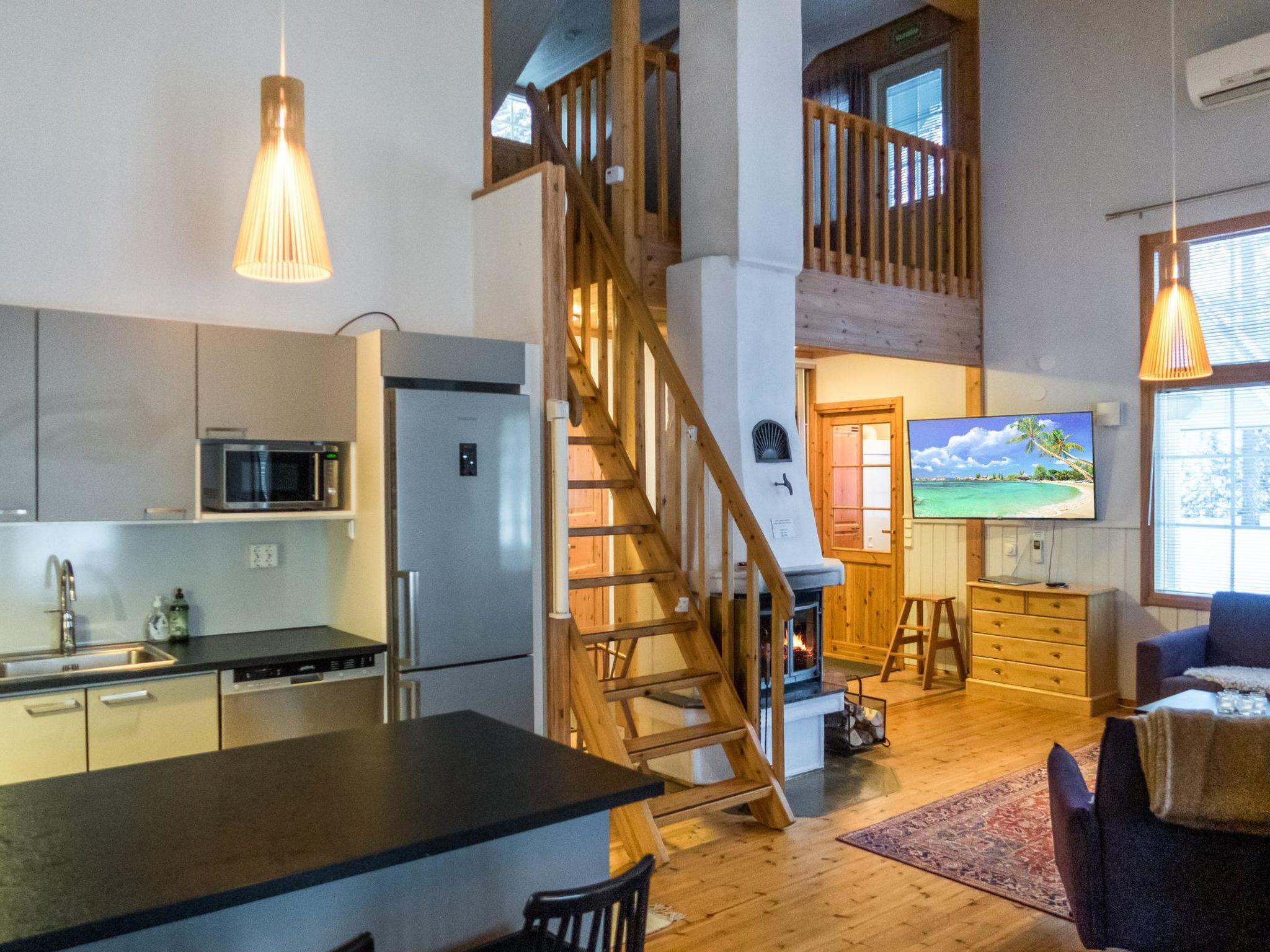 The Katinkulma 1 apartment has a total of 75 m² of space including a loft. Spacious living room / living room with a U-shaped kitchen, dining area with a dining group for 6, a cozy fireplace adds atmosphere. Downstairs, a bedroom with a double bed. Steep stairs to the loft, with a sofa bed for 1-2. Access from the loft to the bedroom with a double bed. Access from the loft to the balcony as well. Shower/wc, sauna (electric heater), porch and garden furniture for 4, view of the pond / Vuokatti slopes from the apartment. Särkinen pond 30 m, shared beach. There is a road between the beach and the holiday home (a ski track in winter).