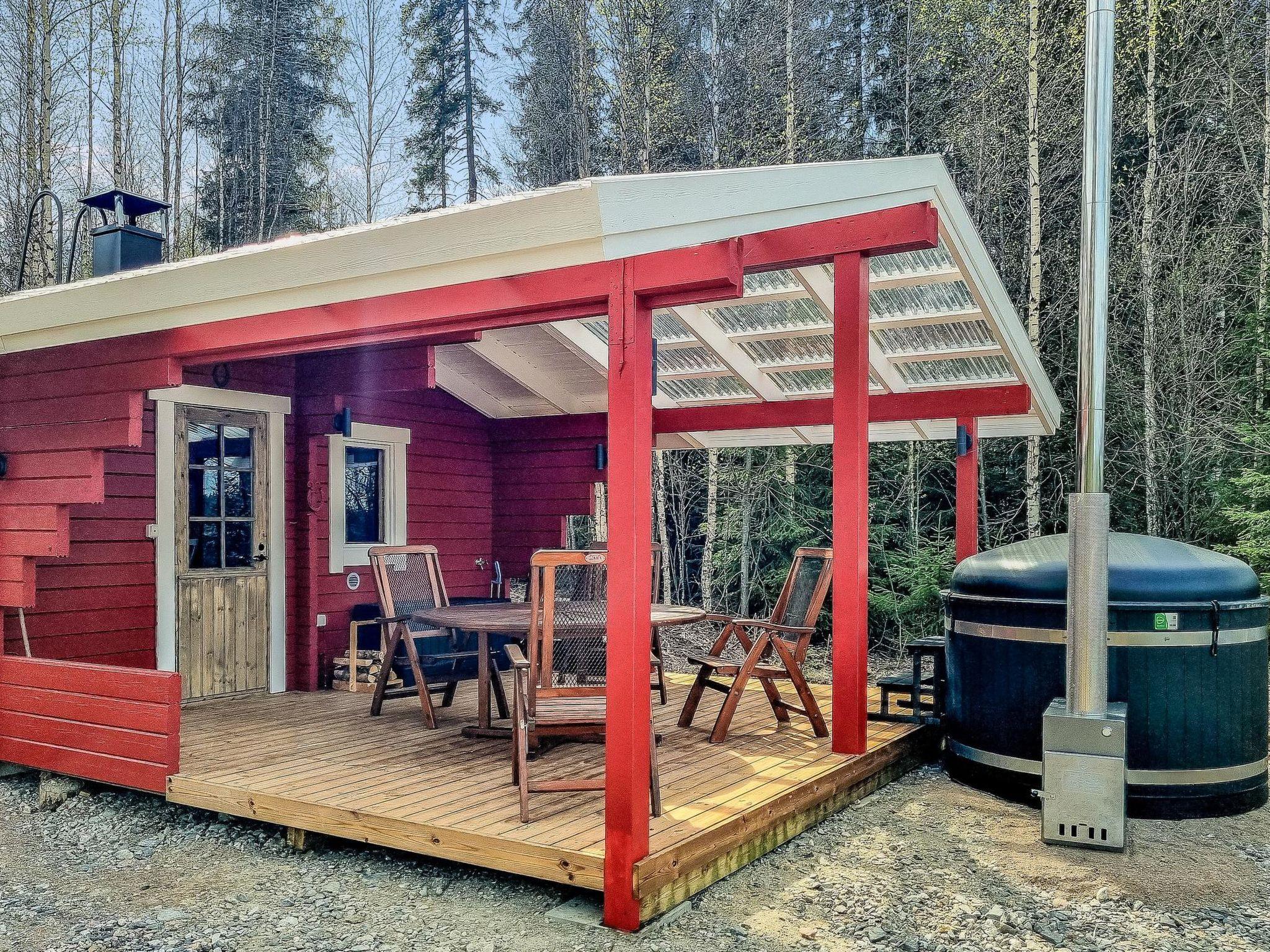 Wood-heated lakeside sauna in summer use, terrace with hot tub (for rent separately extra cost).