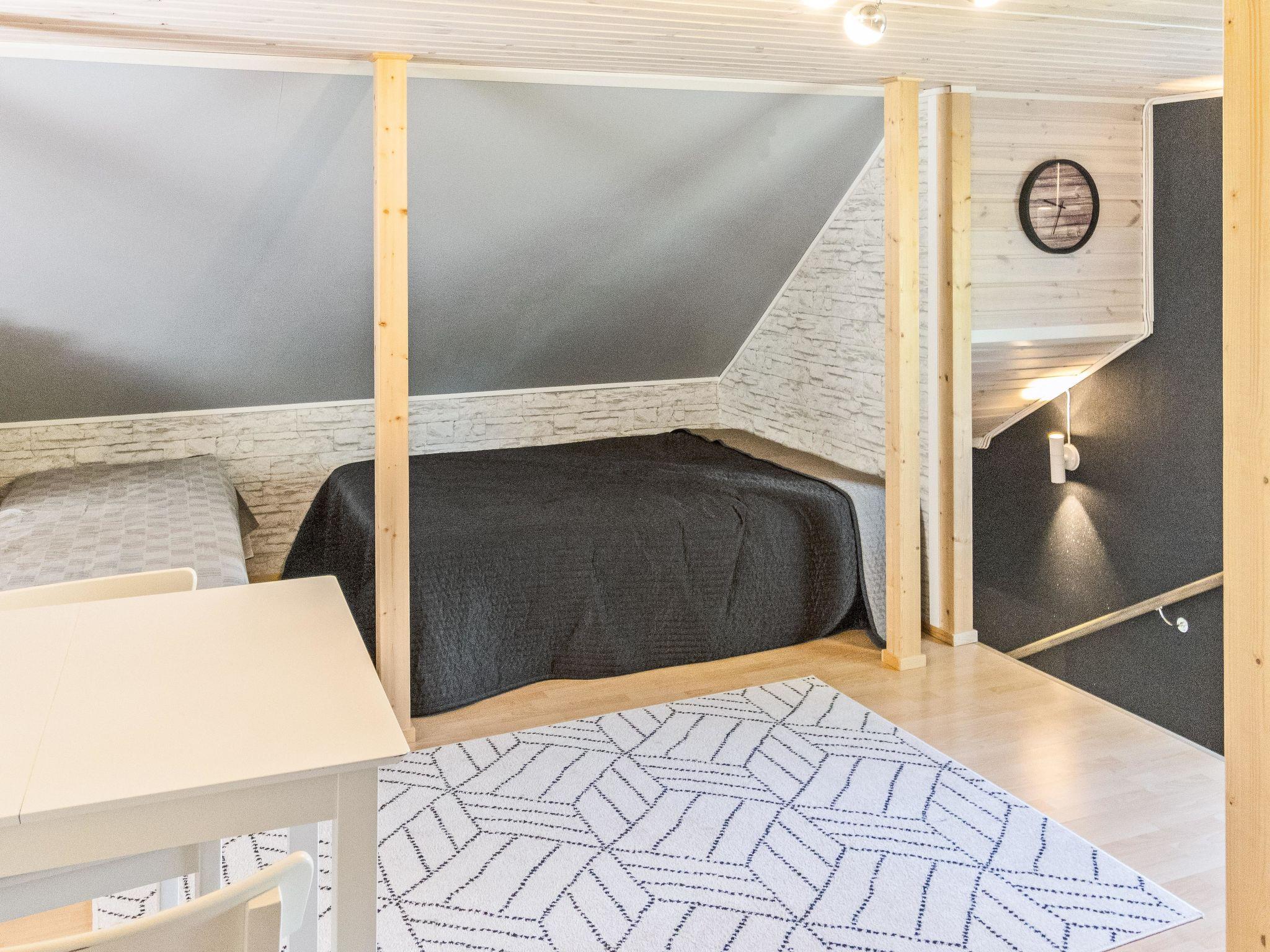 The ground floor features a cozy bedroom with a double bed, connected to a comfortable living room. The upper floor provides sleeping space for five people with separate beds. The rental price includes a barrel sauna with firewood, and guests can use the cabin's shower for washing. There is no sauna inside the cabin itself.