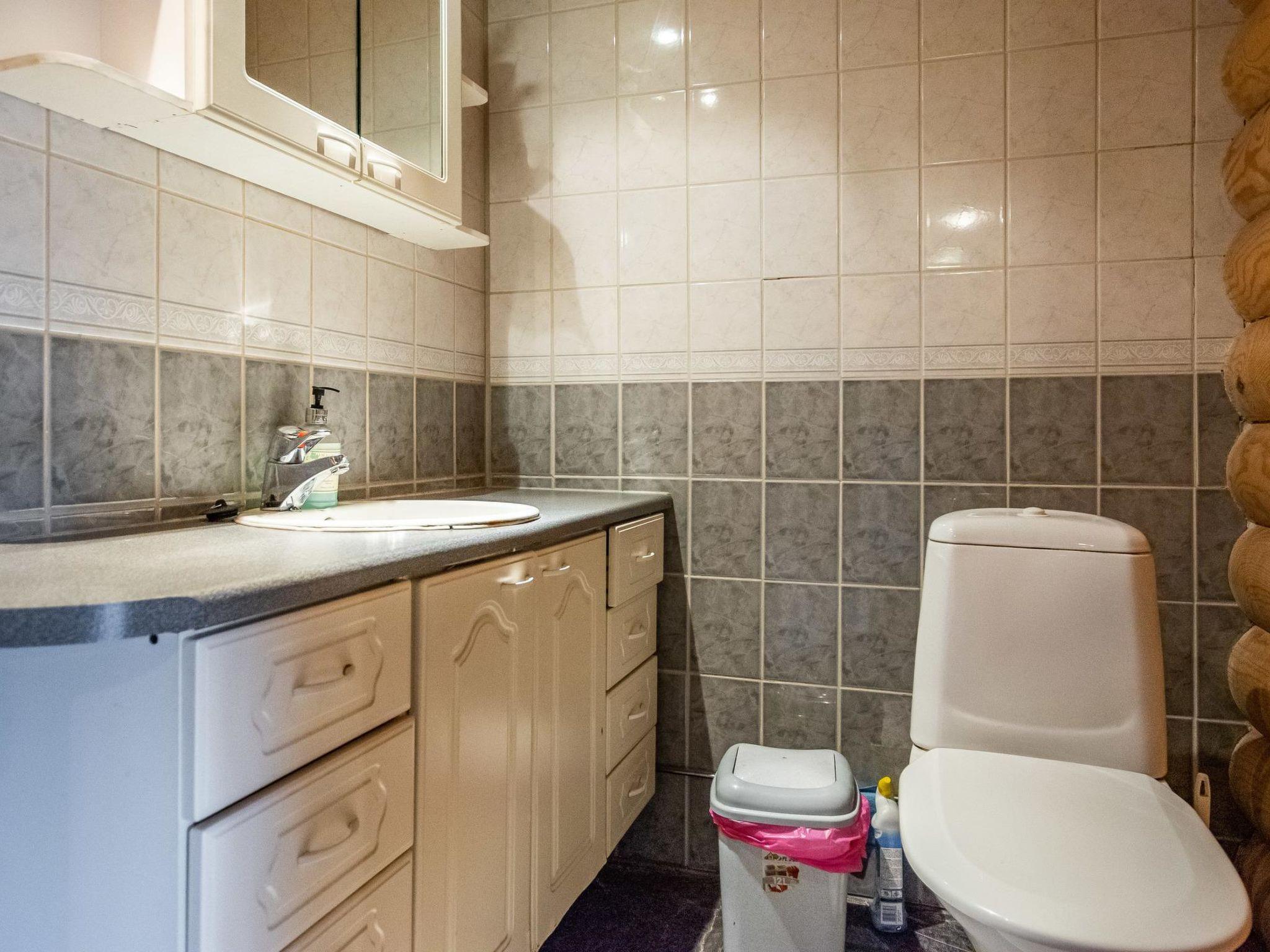 Two-storey log cottage 1999, living room/ kitchen, 2 bedrooms double bed in each, downstairs room with fireplace and sofa, washroom, sauna (elec. stove).