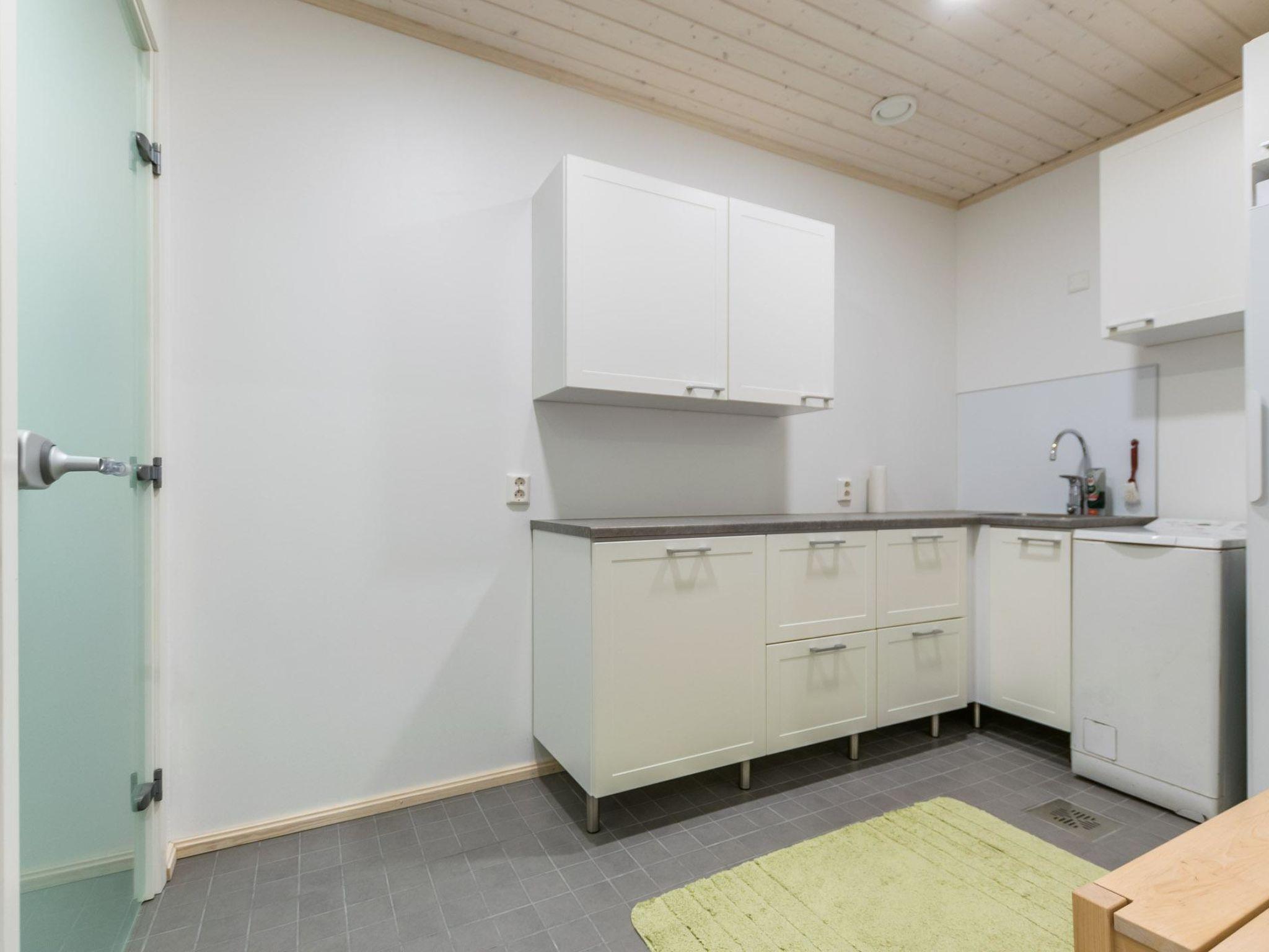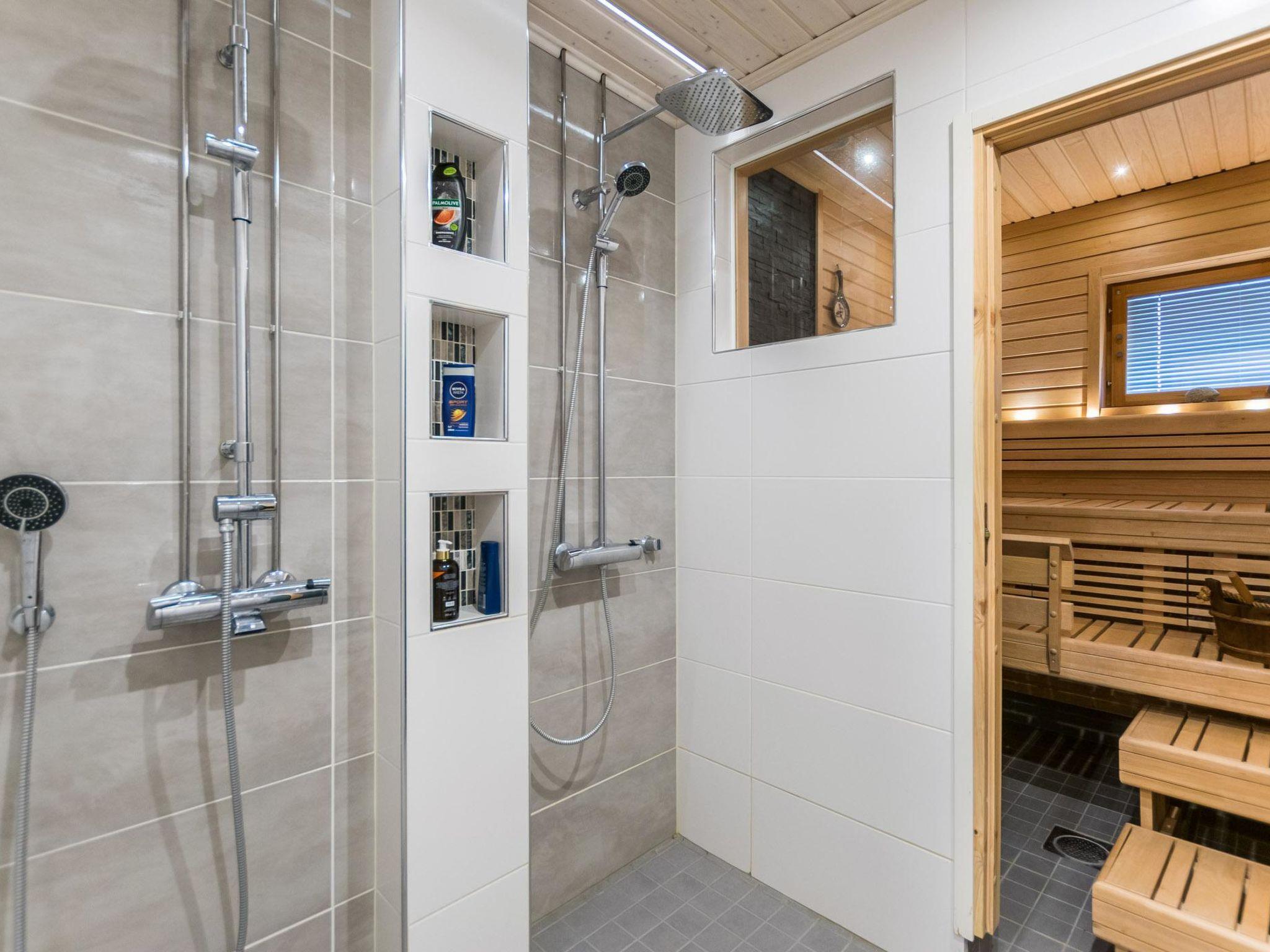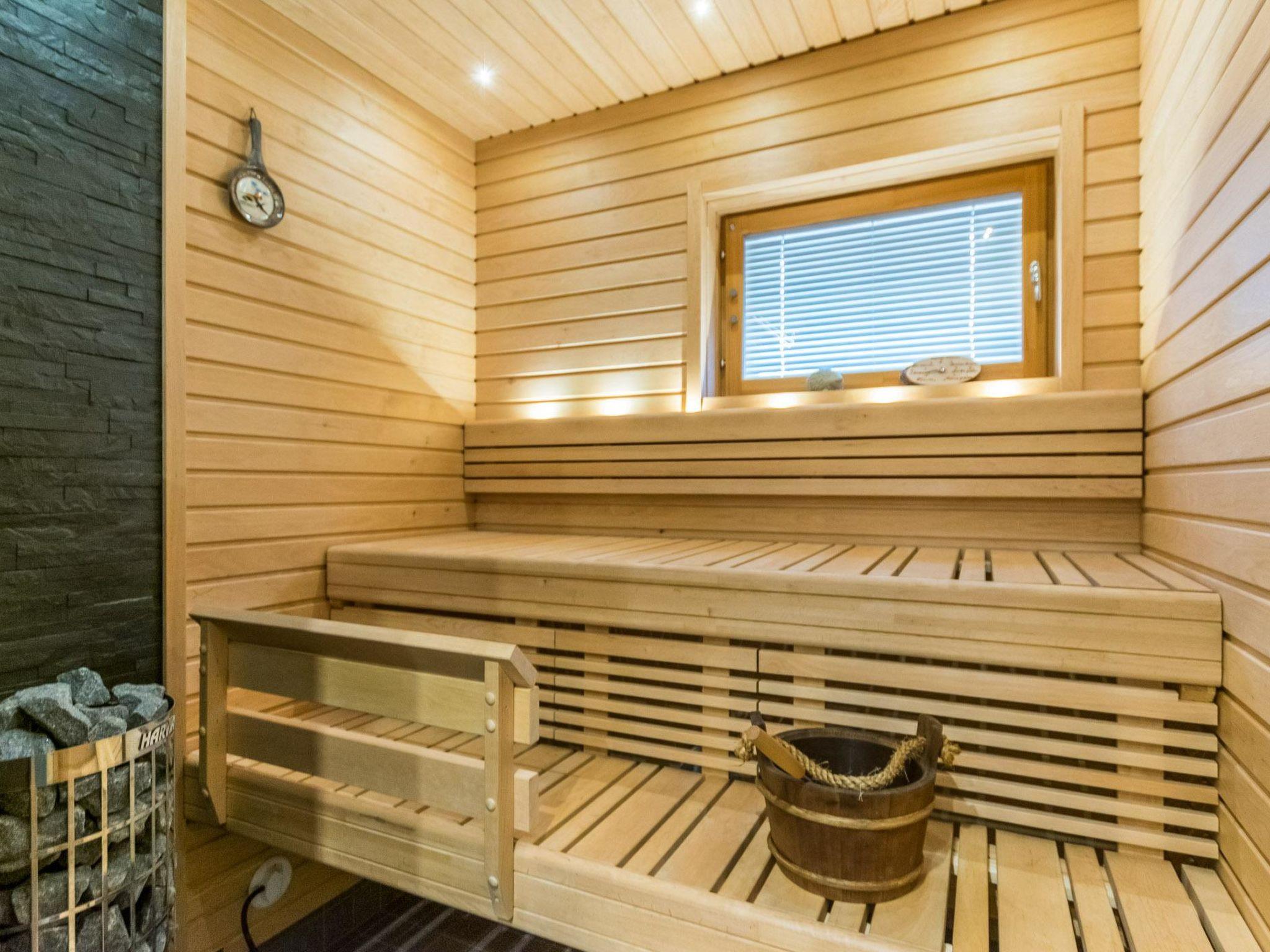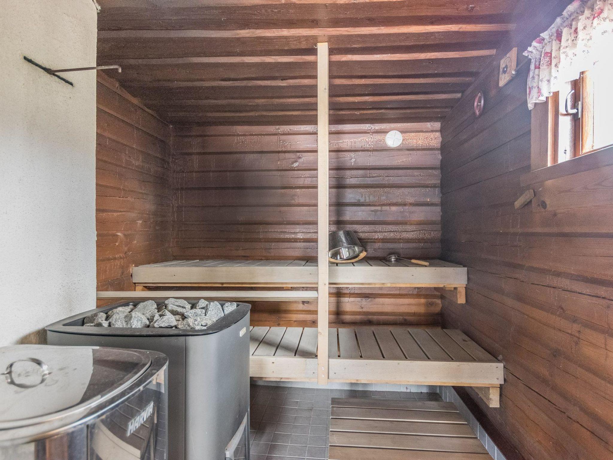 Downstairs, bedroom with one bed, separate toilet, utility room, washroom with two showers, sauna with electric stove, covered terrace.
