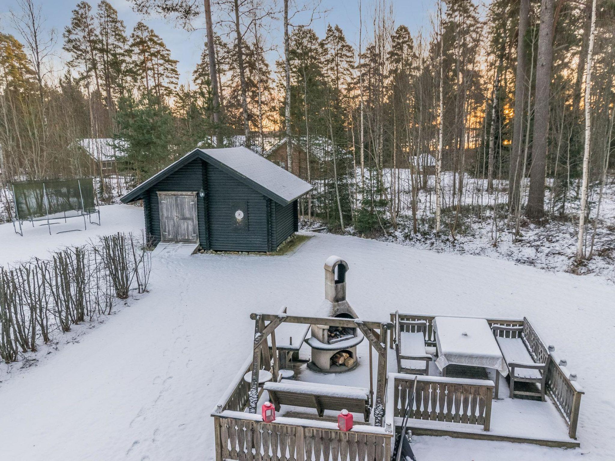 The yard includes a barbecue area. There is a trampoline (with a safety net) for children, shared between Kaivoskartano and Kultakartano, located at the corner of the Kaivoskartano plot; use is at your own risk. The holiday village area also offers a tennis court, beach volleyball court, and mini-golf course.