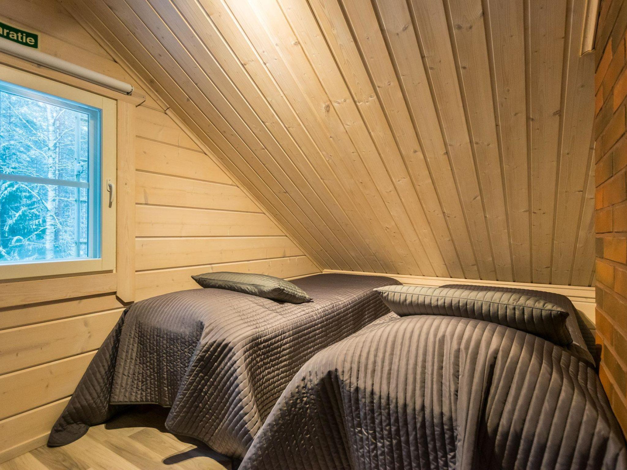The cabin's living area features a dining table for four, a heat-storing fireplace, a living room/kitchen, a TV, and two armchairs. Access to a wood-heated sauna is available through the inside or from the terrace. The bathroom includes a shower, a WC, and a washing machine. The loft has four beds, and there is a child safety gate upstairs.