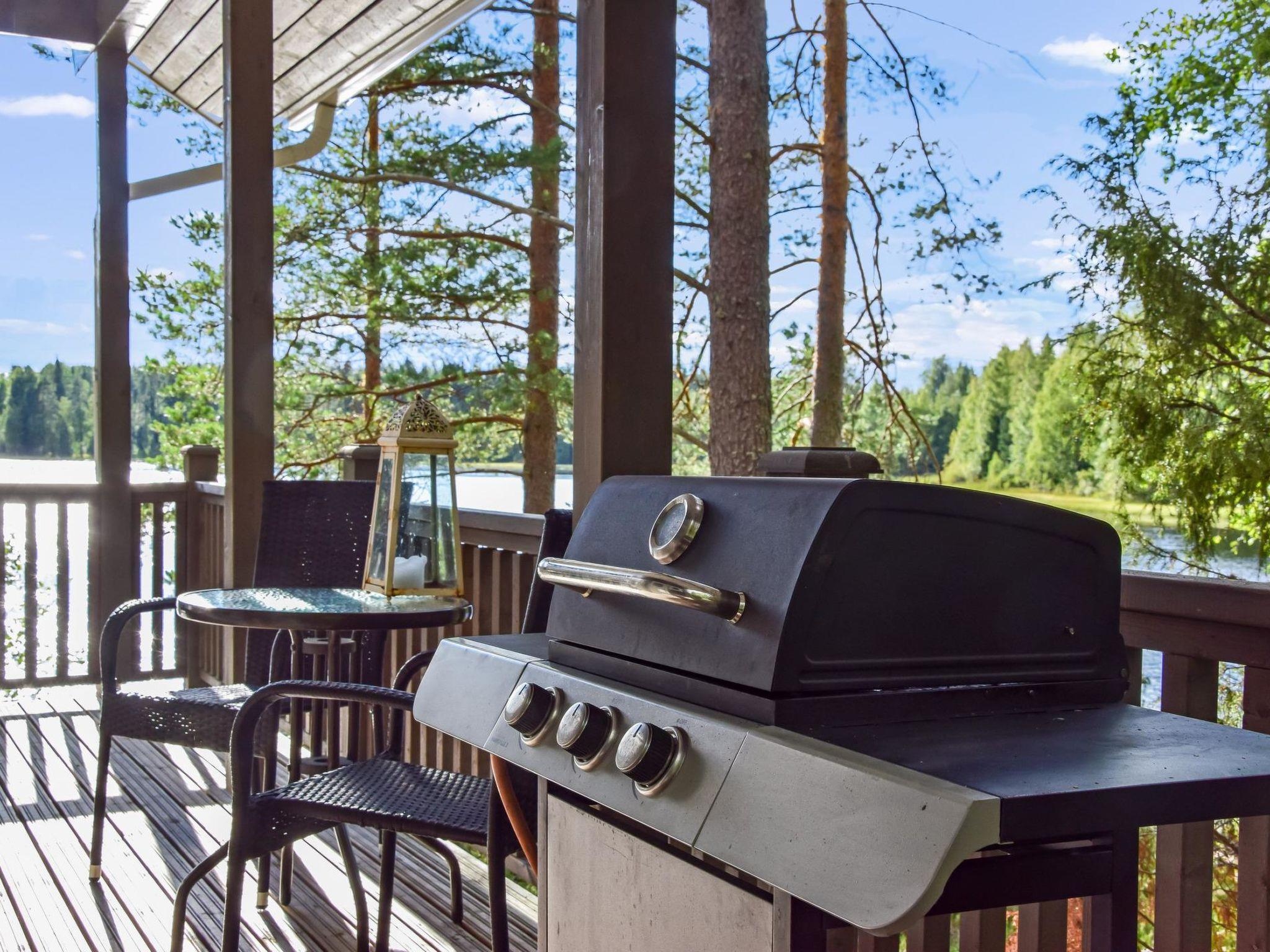 On the covered terrace, you will find a gas grill and garden chairs. In front of the cabin, there is a campfire. The yard also has a spacious parking area with an electric outlet for heating the car.