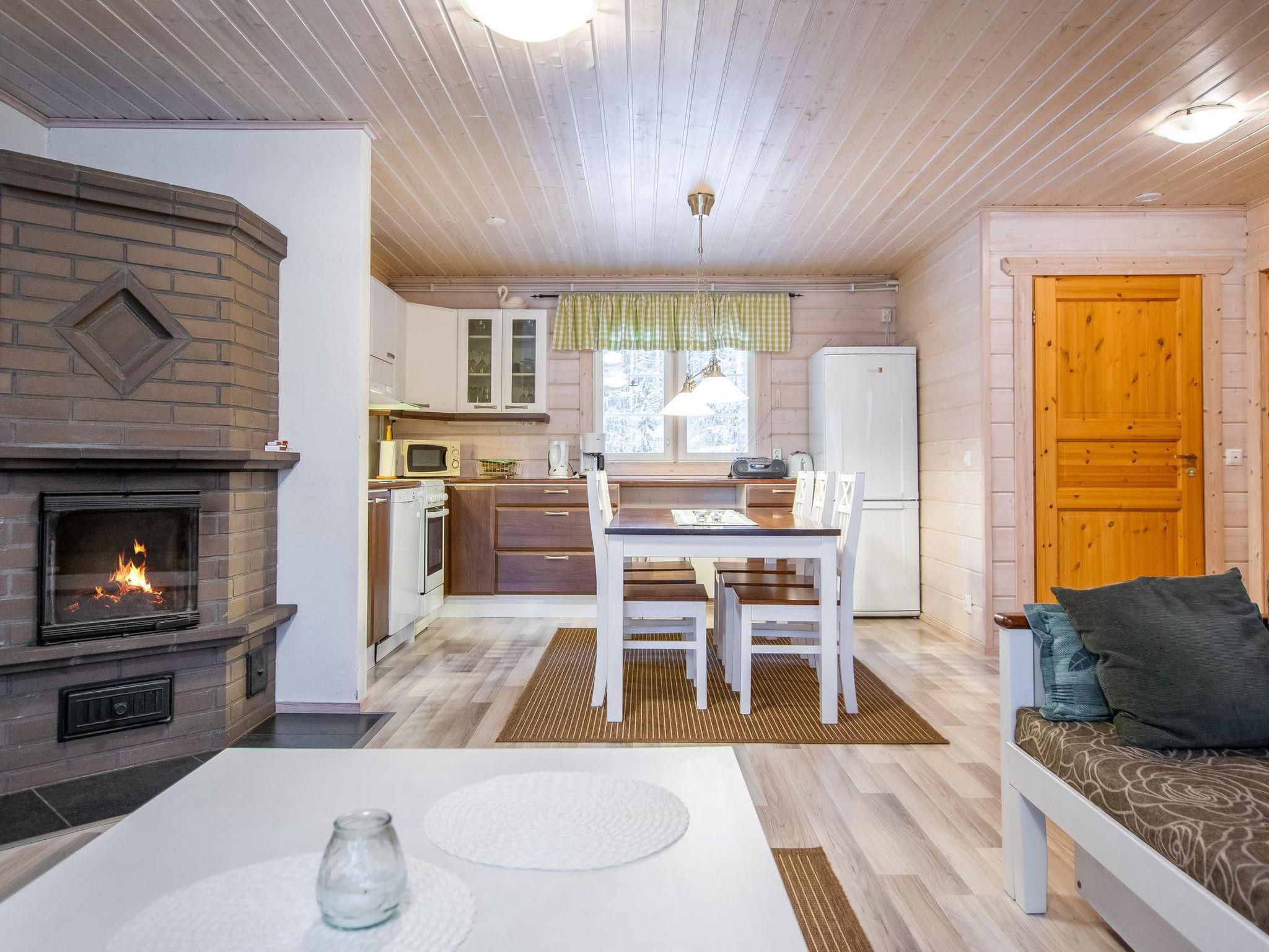 The log cabin (built in 2011) features a cozy open-plan living room and well-equipped kitchen. The living room includes a heat-storing fireplace, a TV, and a sofa set. The kitchen has a spacious dining table. The cabin has two bedrooms, each with two beds. Additionally, the living room has a pull-out sofa bed that converts into a 140 x 190 cm extra bed for two people.