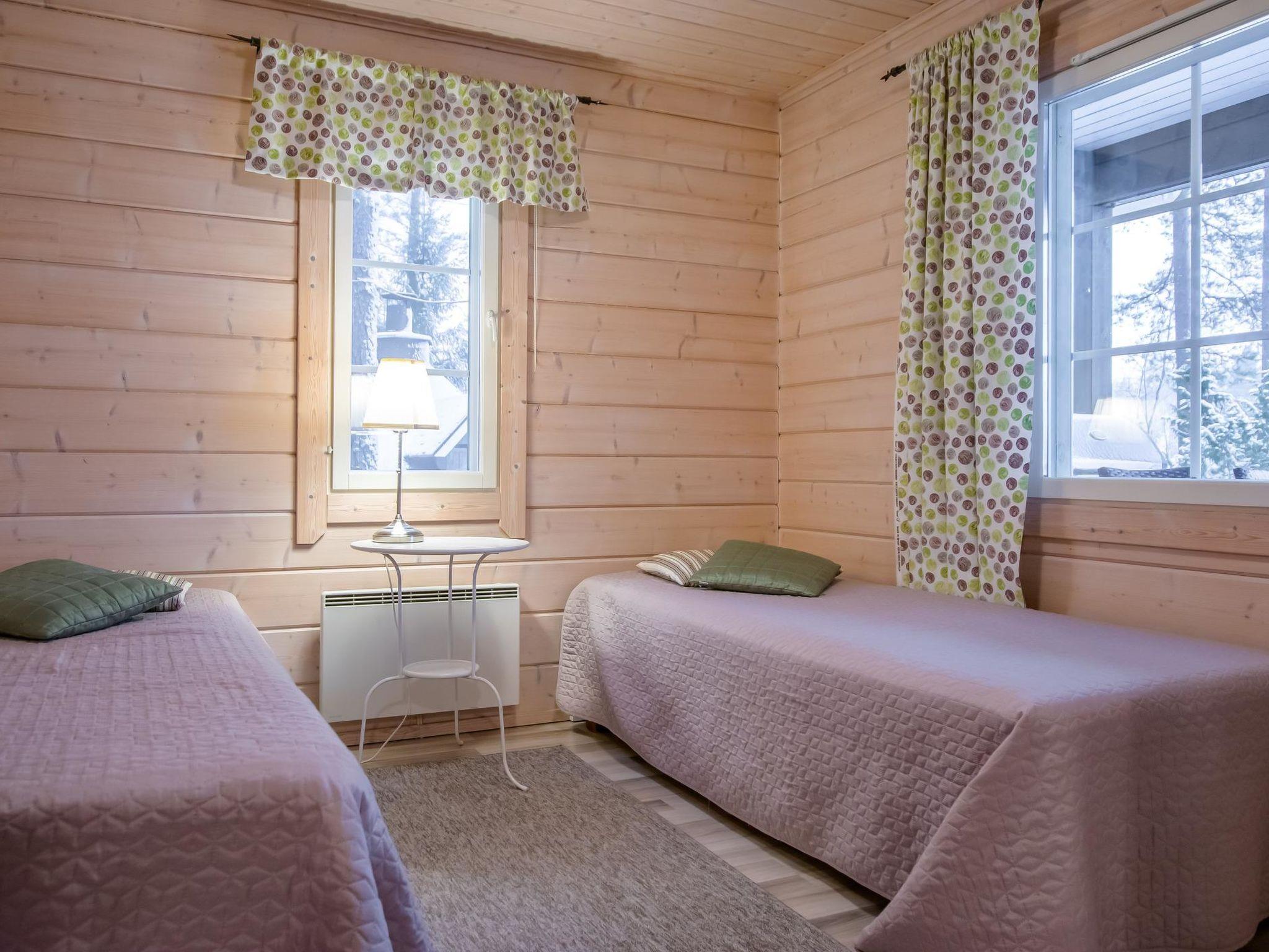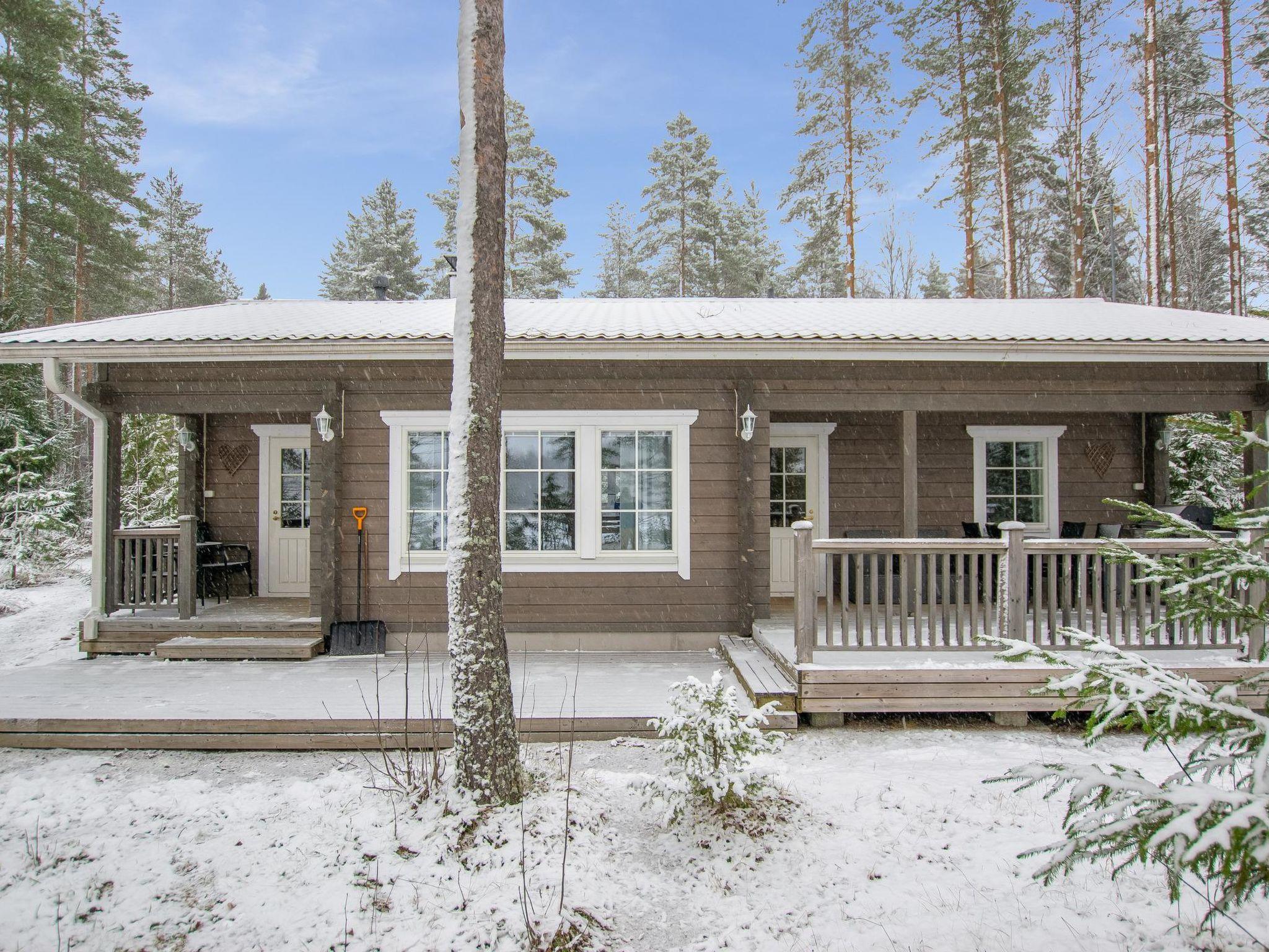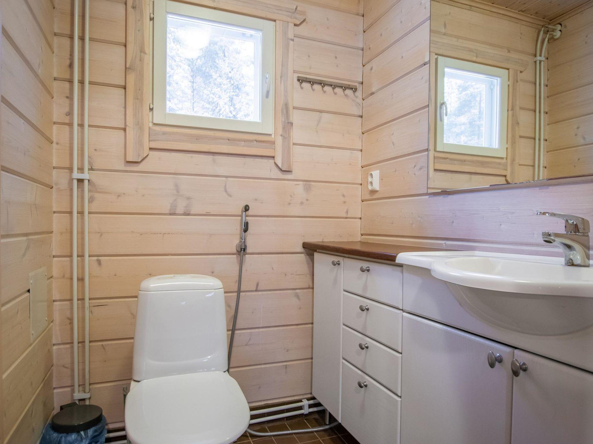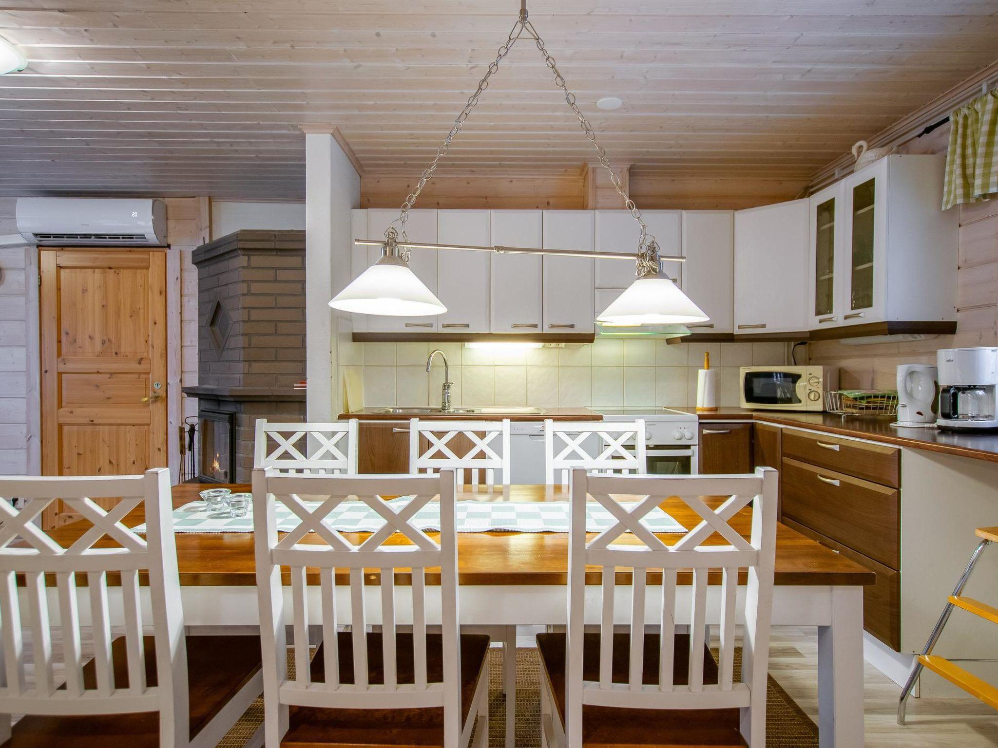 The sauna is equipped with a wood-burning stove, and the washroom has a shower and a separate WC. The cabin is equipped with an air-source heat pump for both cooling and heating.