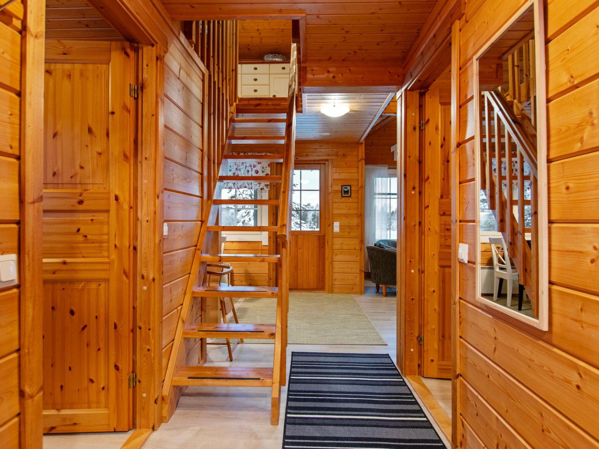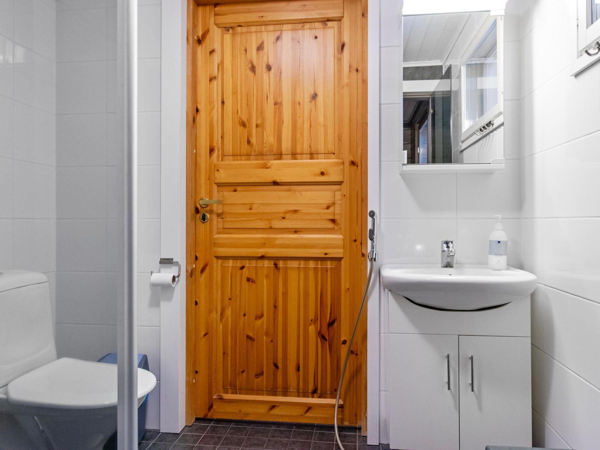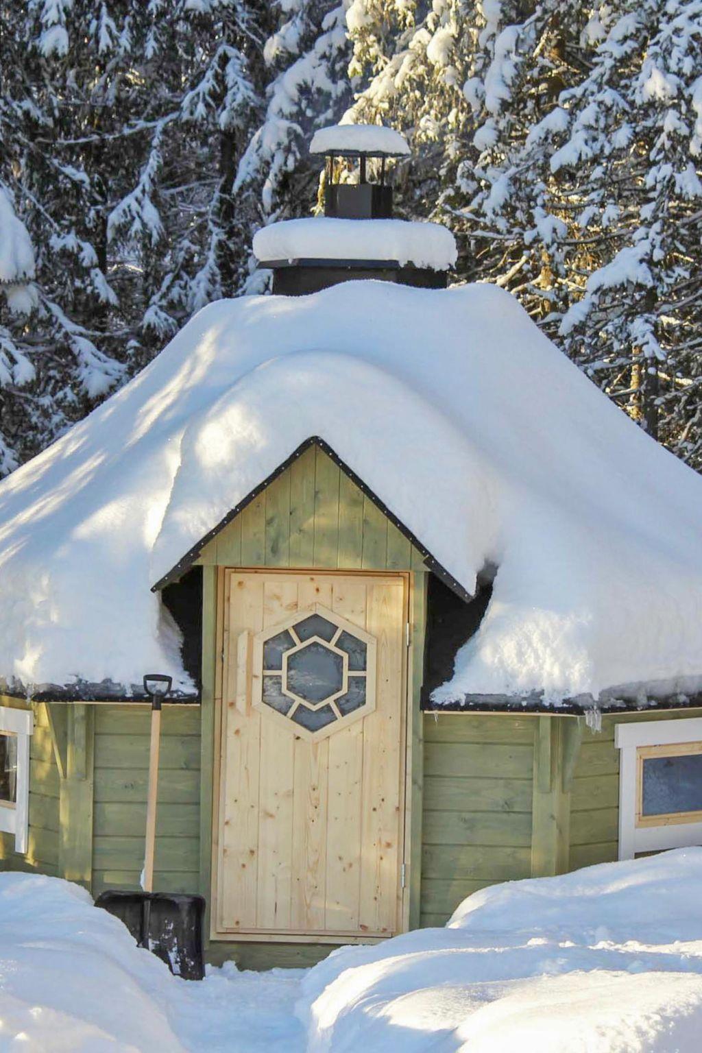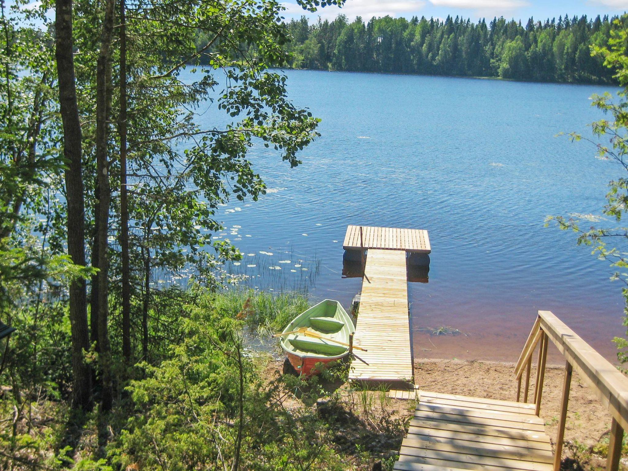 The sauna is equipped with a wood-burning stove, and the washroom includes a shower and a WC. In the yard, there is an atmospheric grill hut, and the terrace also has a gas grill. Steep stairs lead from the cabin down to the shore. The shallow shoreline has a sandy bottom. There is about 1 meter of water depth at the end of the pier.