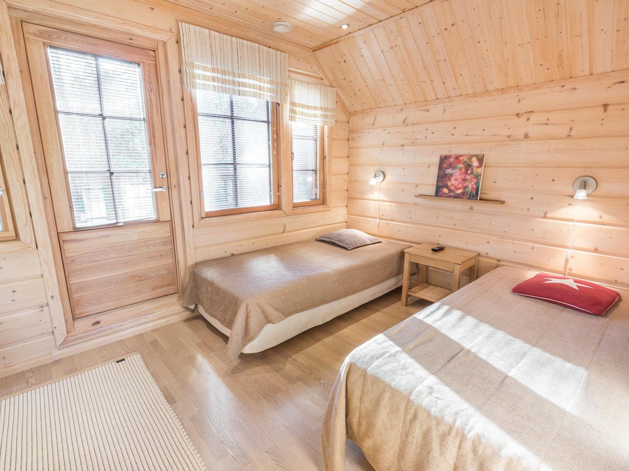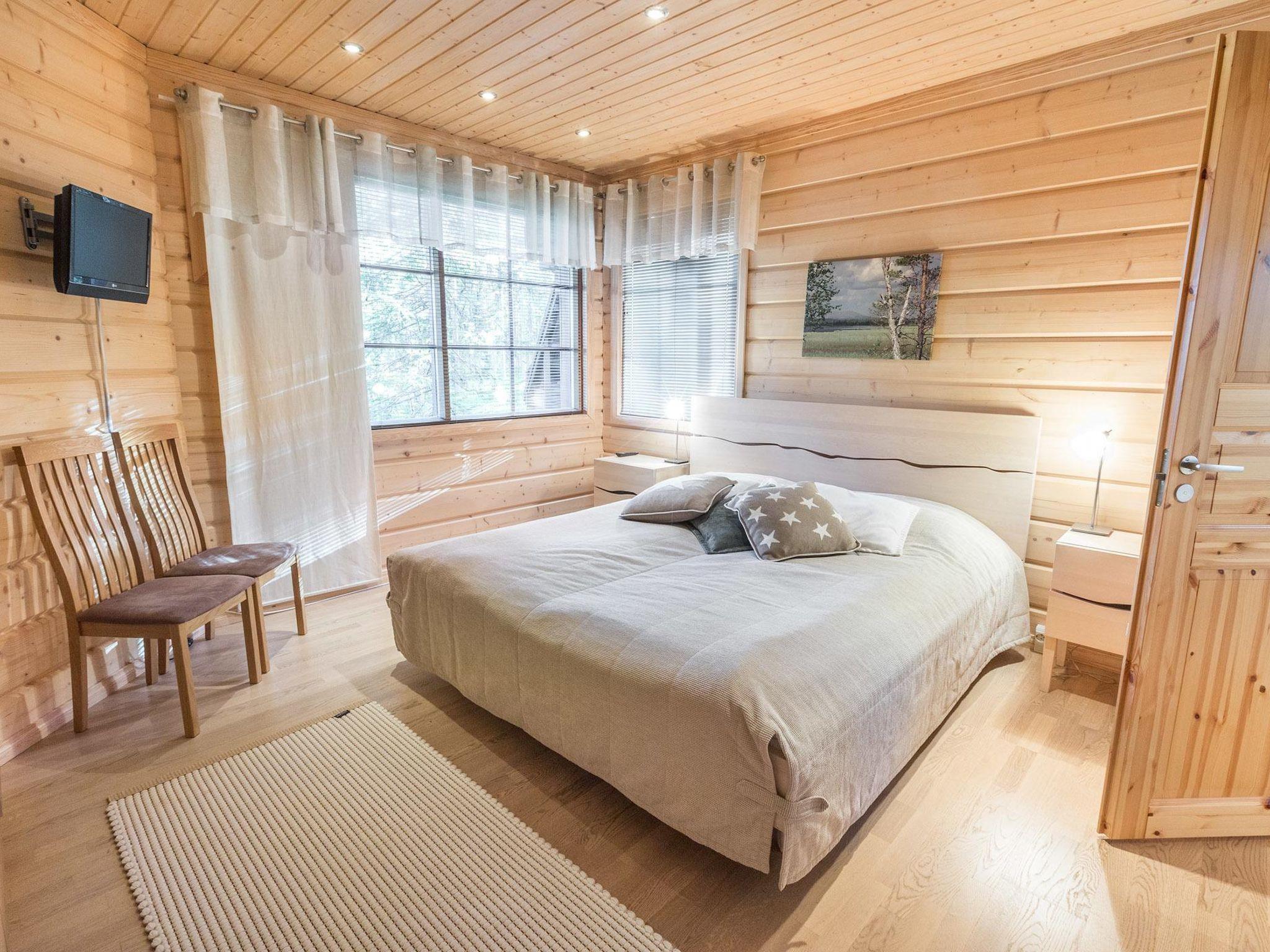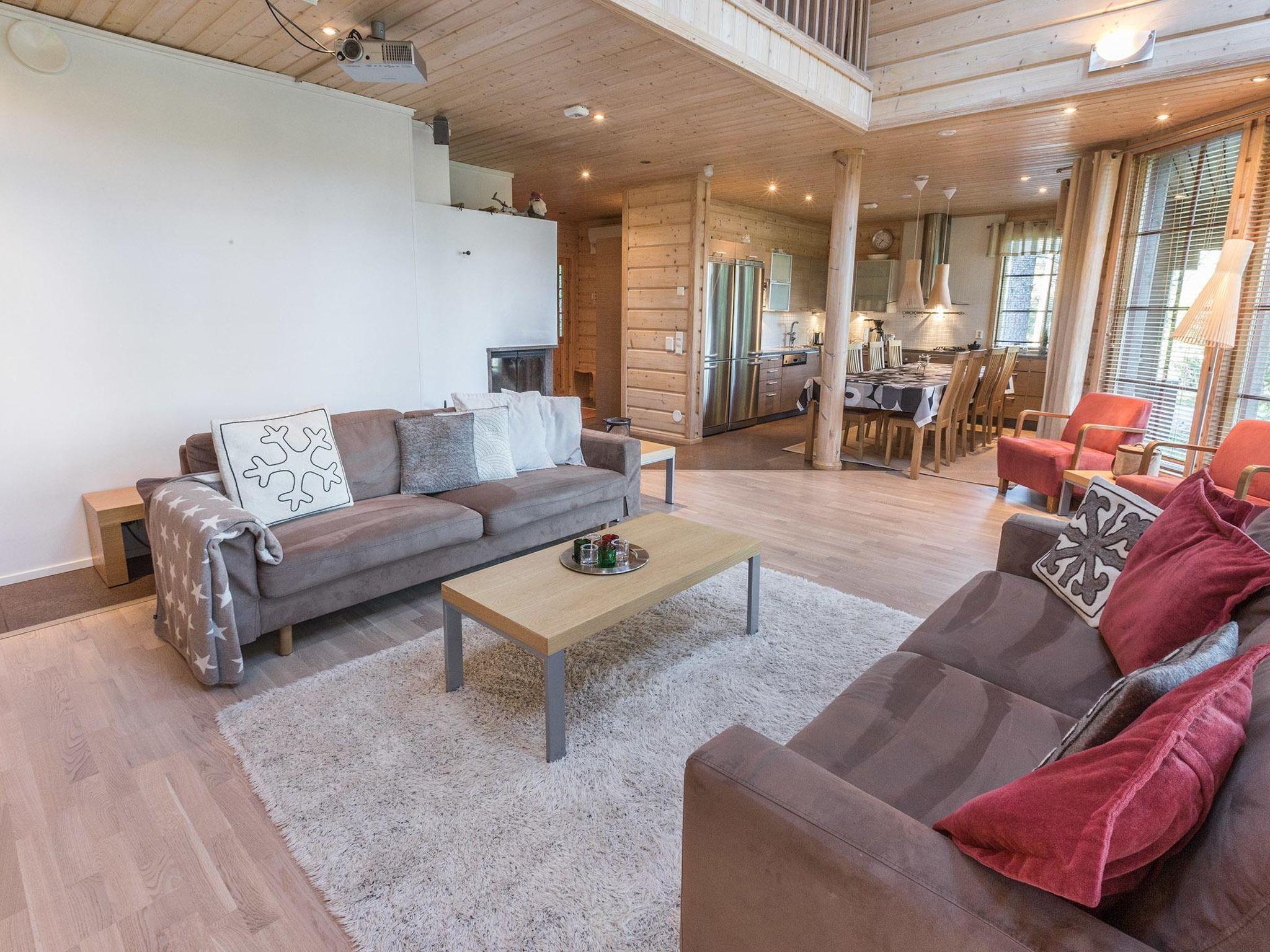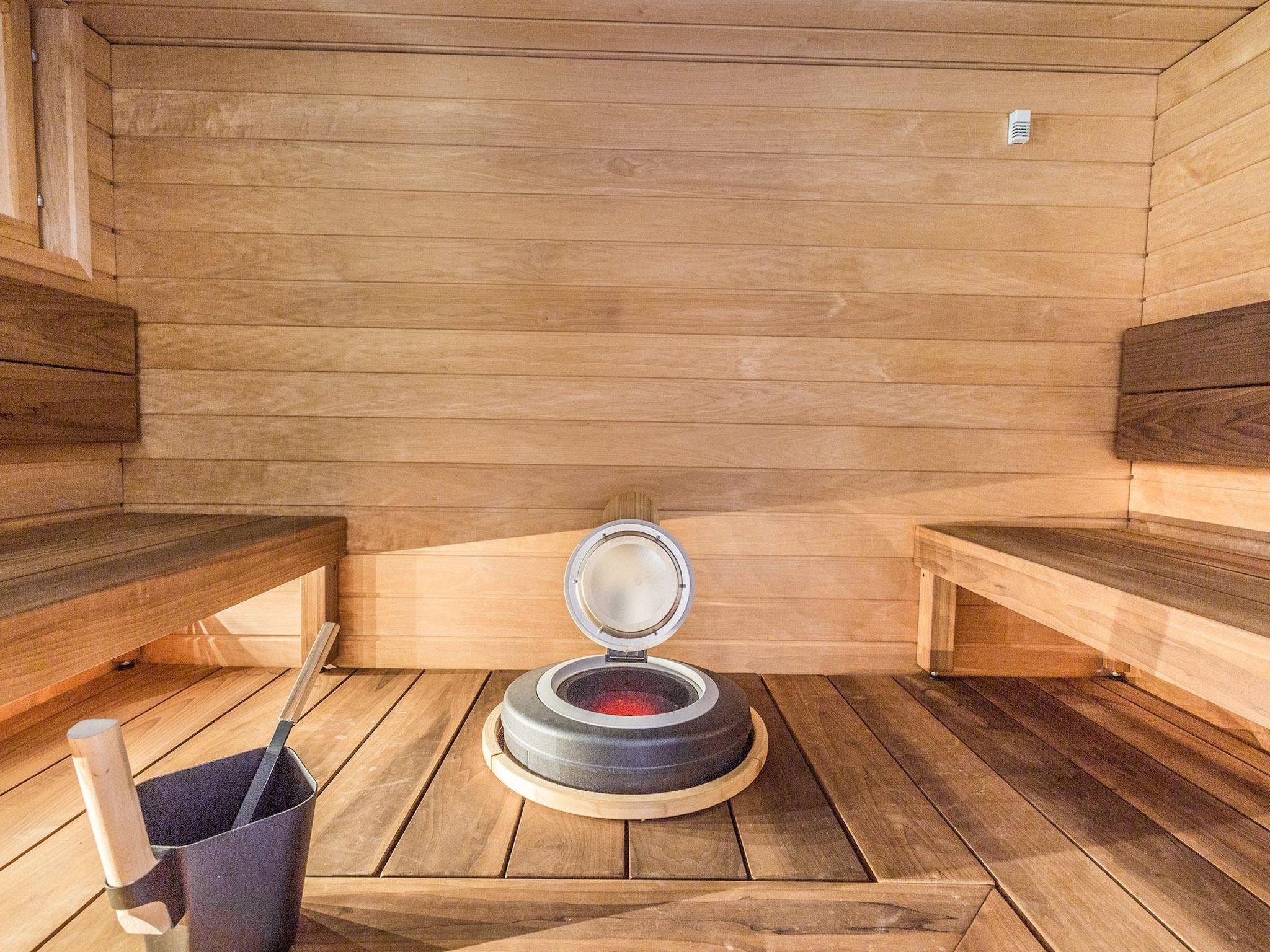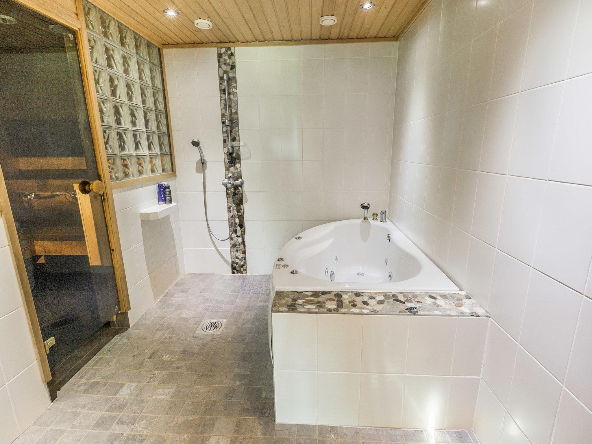 Downstairs: 2 bedrooms (one with a double bed and the other with two separate beds that can be combined), with a separate wardrobe/dressing room in the other. Large living room kitchen. Spacious and high living room, utility room, 2 x toilets. Sauna department: dressing room, bathroom and sauna room (heater ready immediately). 2 outdoor terraces. Fireplace.