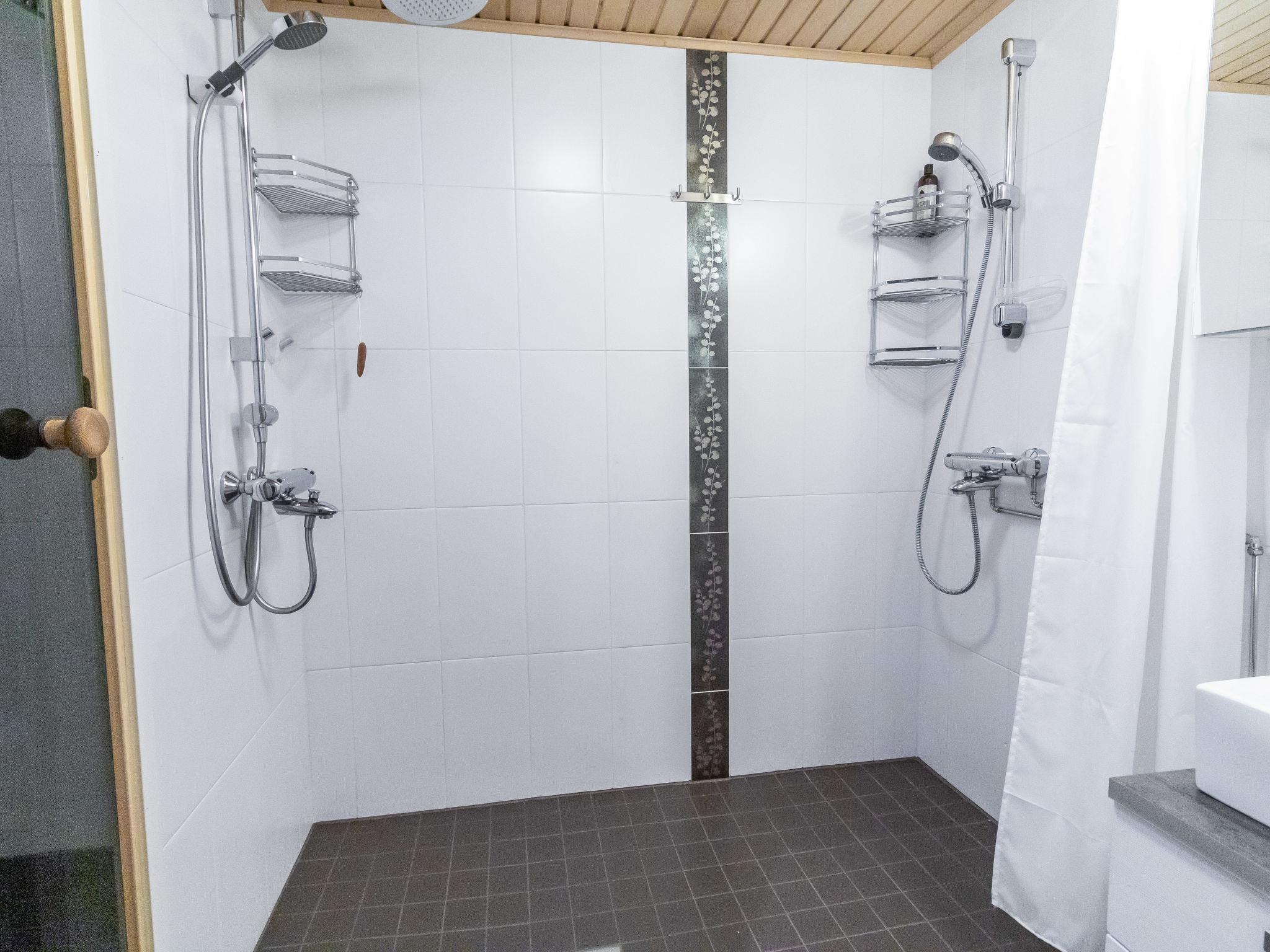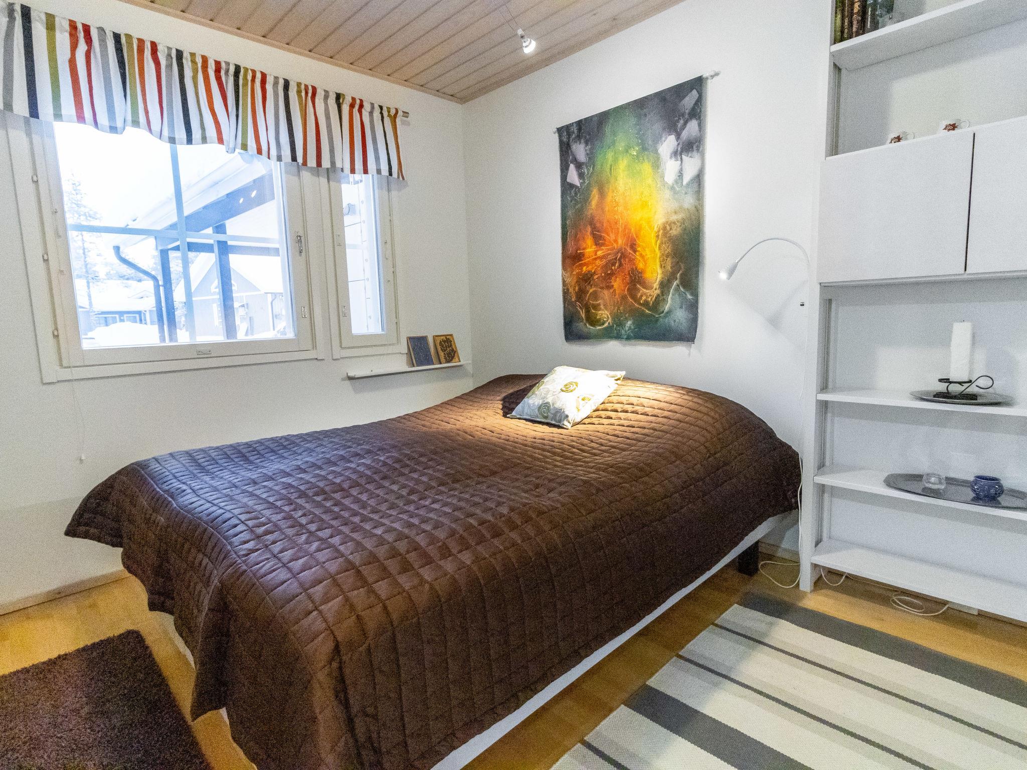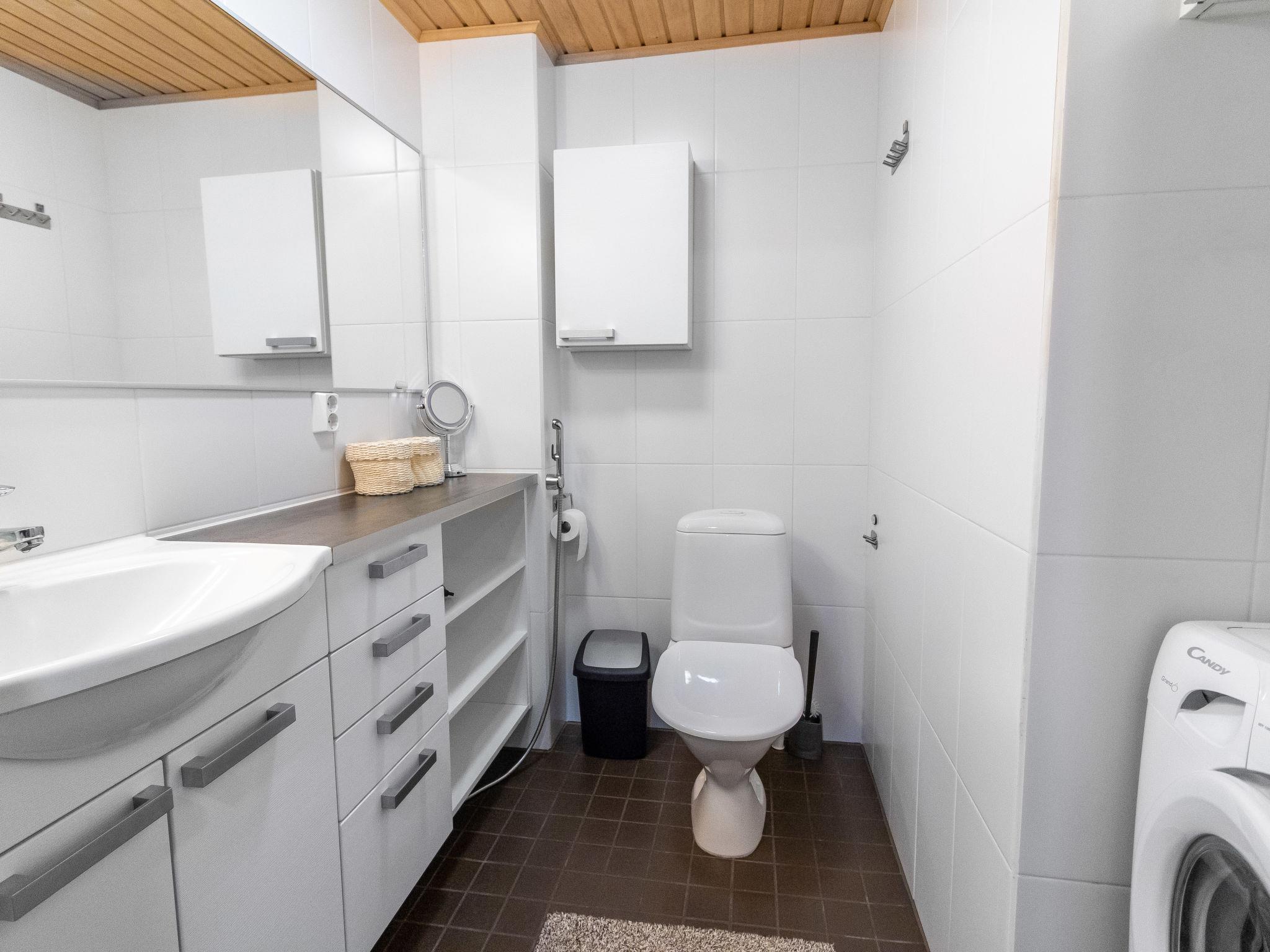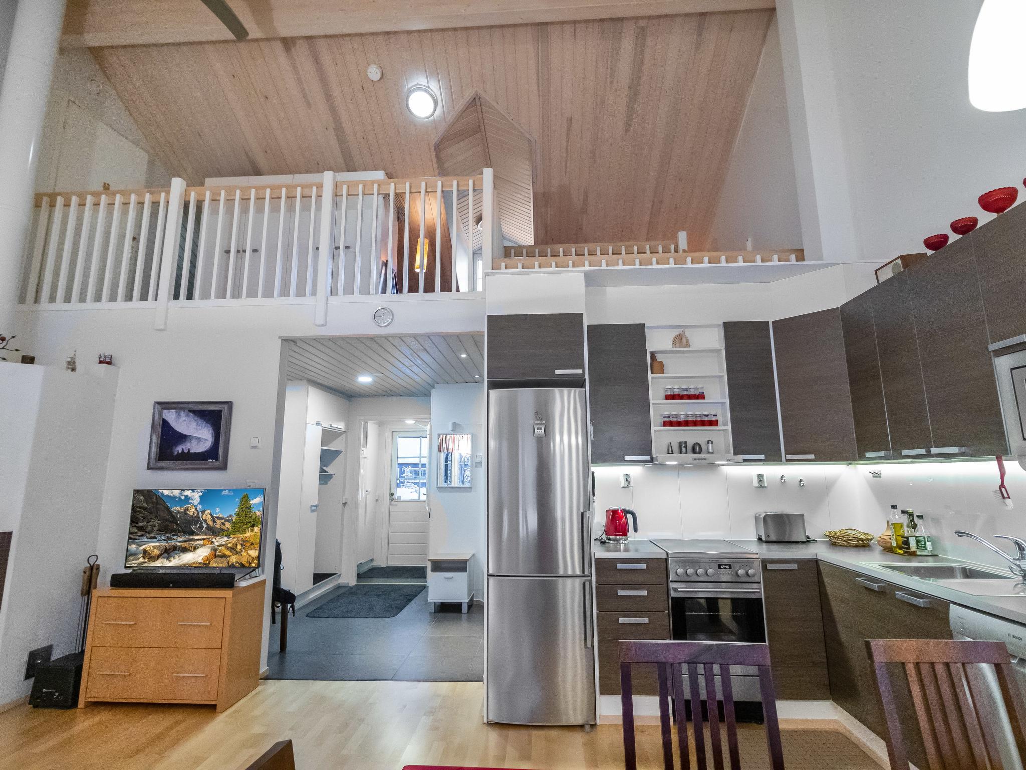 The well-equipped and spacious living room/kitchen provides a comfortable setting for spending time together and cooking. For relaxation, guests can enjoy an electric sauna and washroom facilities.