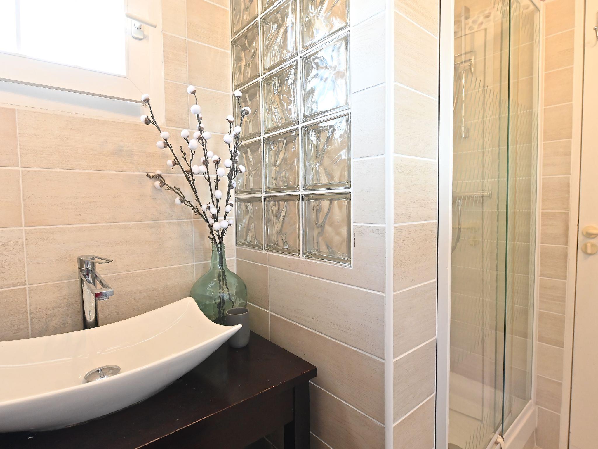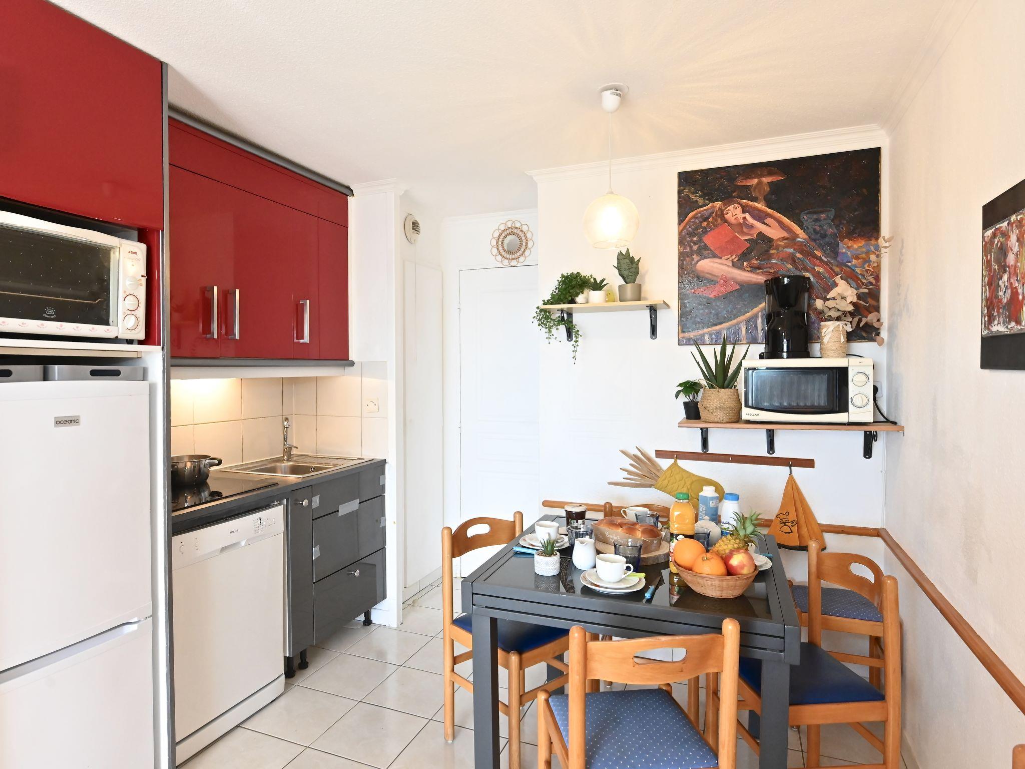 "Le Village (C0363)", 3-room apartment 40 m2 on 2 levels on 2nd floor. Living room with 2 sofabeds (80 cm, length 190 cm), TV (flat screen). Exit to the terrace. 1 small room with 1 x 2 bunk beds (80 cm, length 190 cm). Kitchenette (4 hot plates, mini-oven, dishwasher, toaster, kettle, microwave, freezer, electric coffee machine). Shower/WC. Electric heating. Upper floor: 1 room with 1 french bed (1 x 140 cm, length 190 cm), shower/WC. Exit to the terrace. 2 terraces 10 m2. Terrace furniture. Beautiful view of the sea. Facilities: Internet (WiFi, extra). Parking space n 2058 (roofed), height 180 cm. Please note: non-smokers only. Smoke alarm. Offer by a commercial proprietor according to Art. 155, IV, CGI