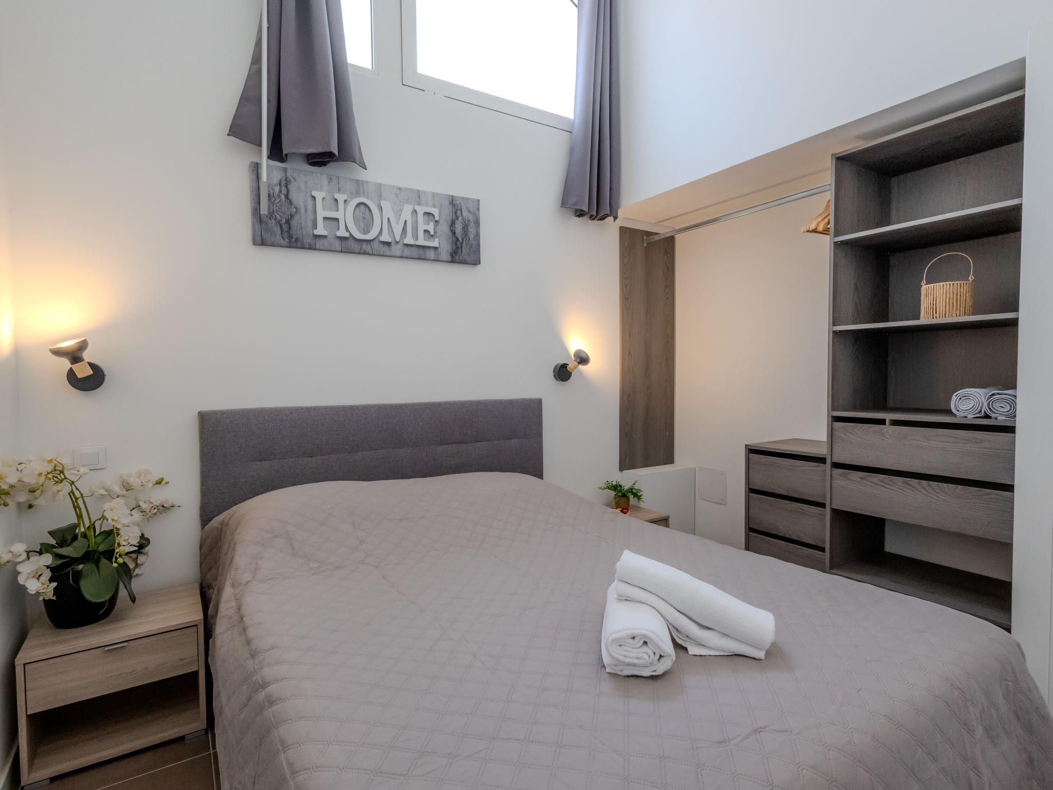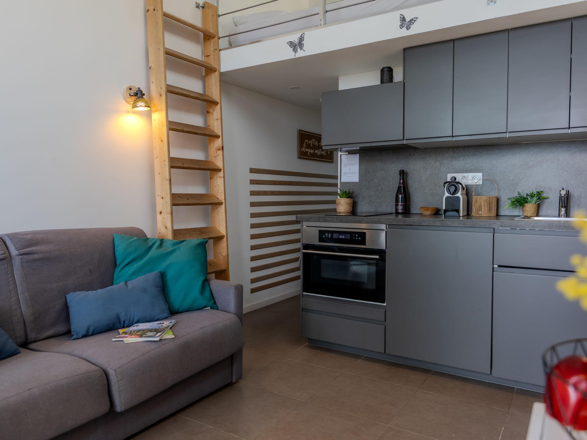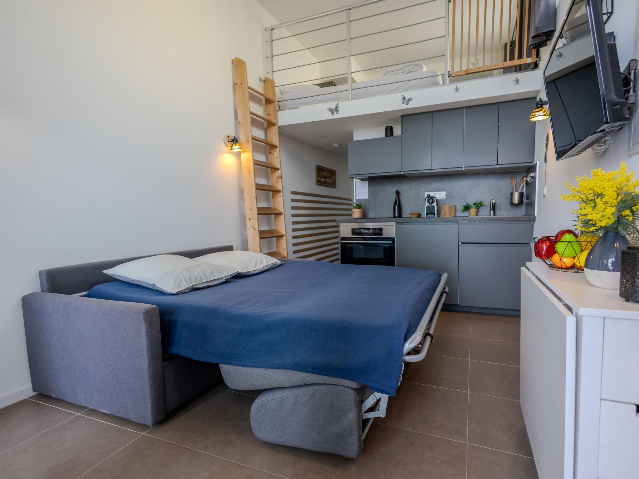 "J6 174 L'Esquinade", 2-room apartment 28 m2 on 2 levels, on the ground floor. With sloping ceilings, fully renovated in 2024, beautiful and modern furnishings: living/dining room with sloping ceilings, - 330 cm with 1 double sofabed (140 cm, length 190 cm), TV (flat screen). Exit to the terrace. 1 room with sloping ceilings, - 330 cm with 1 french bed (140 cm, length 190 cm). Small, open kitchen (oven, 2 induction hot plates, toaster, kettle, electric coffee machine, Capsules for coffee machine (Nespresso) extra) with dining table. Shower/WC. Electric heating, air-conditioning, forced-air heating. Upper floor: (steep stair) gallery with 2 beds (90 cm, length 190 cm). Terrace 15 m2, roofed, south facing position. Terrace furniture. Very beautiful view of the sea. Facilities: washing machine, iron, hair dryer. Internet (WiFi, extra). Parking (1 car). Please note: non-smokers only. Smoke alarm. Offer by a private individual according to Art. 155, IV of CGI.