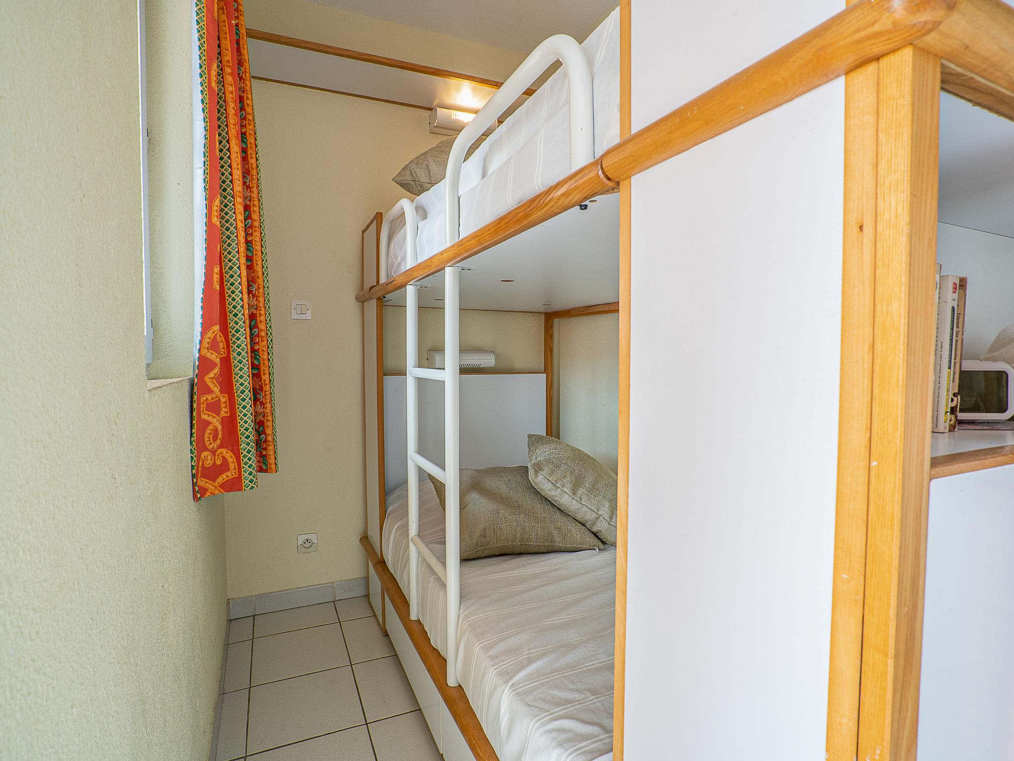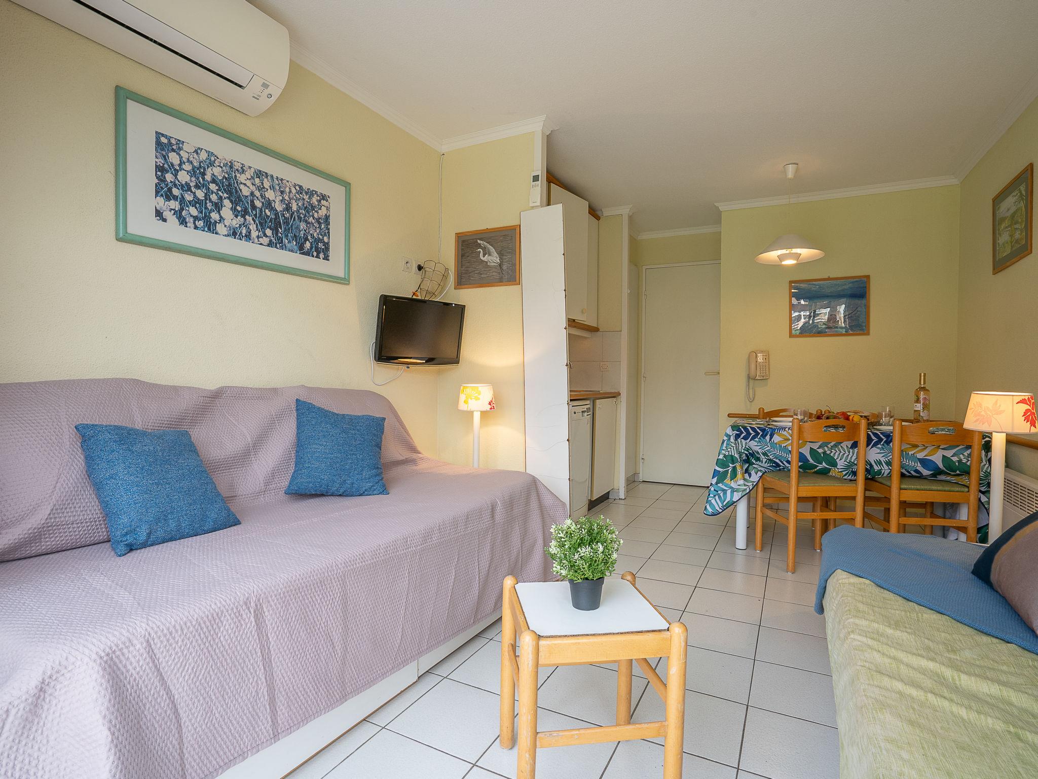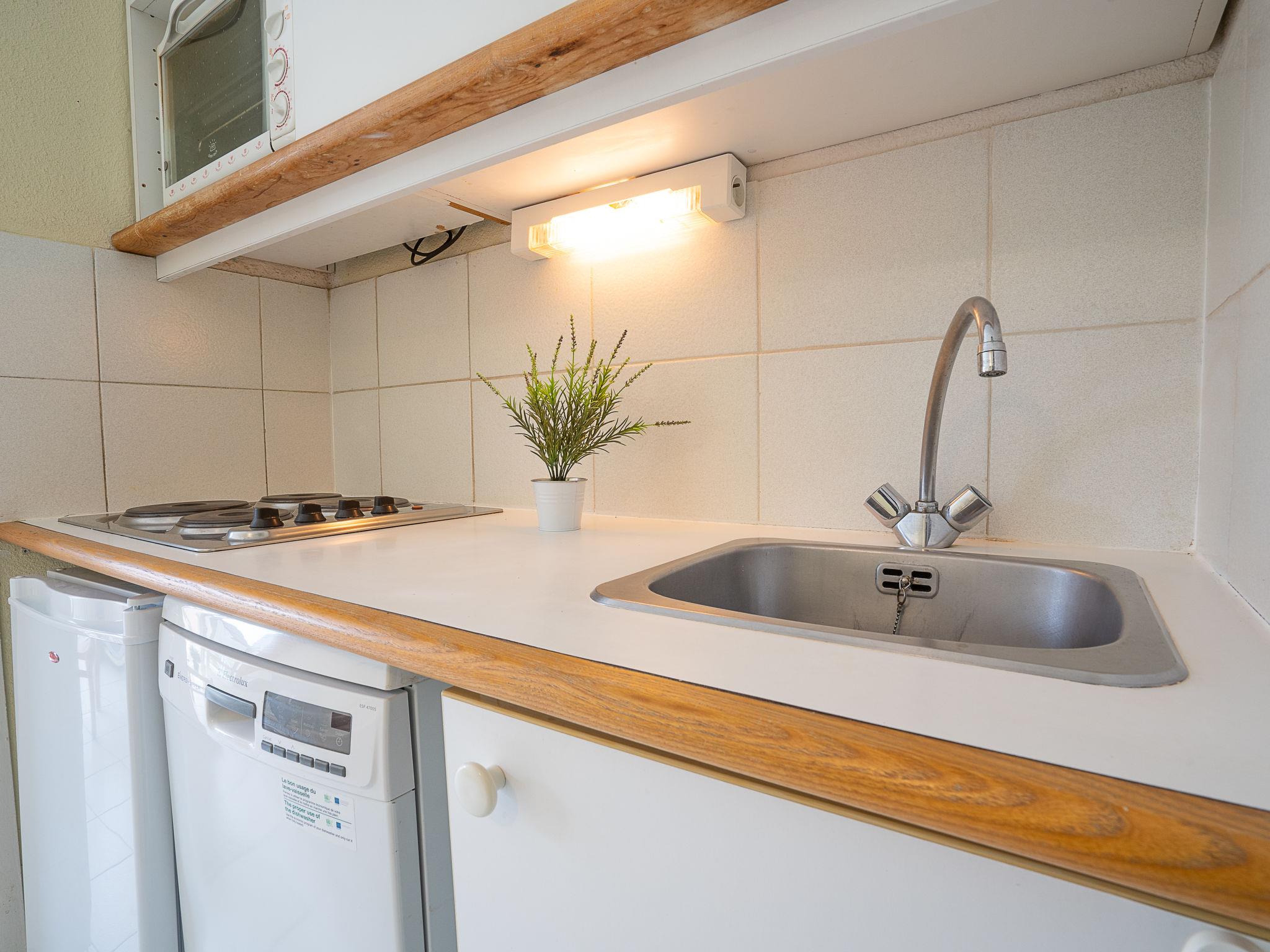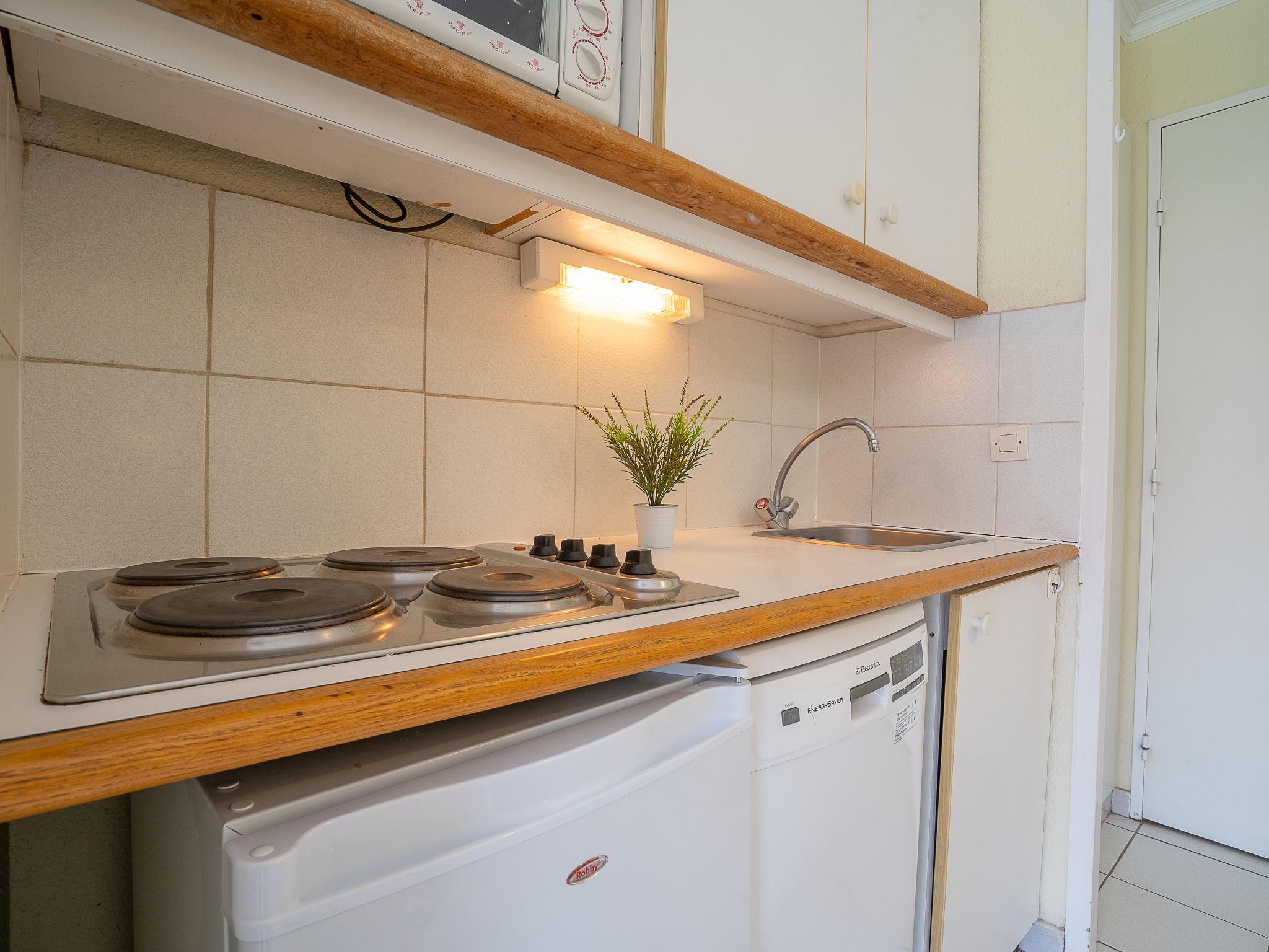 "L'Esquinade (J3 402)", 1-room studio 28 m2 on 3rd floor. Object suitable for 2 adults + 2 children. Living room with 2 sofabeds (80 cm, length 190 cm), TV (flat screen). Exit to the terrace. Sleeping alcove with 1 x 2 bunk beds (80 cm, length 190 cm), air conditioning. Kitchenette (4 hot plates, dishwasher, kettle, microwave, electric coffee machine). Bath/WC. Electric heating. Terrace 9 m2. Terrace furniture. Beautiful view of golf course. Facilities: Internet (WiFi, extra). Parking (1 car). Please note: fridge without freezer, non-smokers only. Maximum 1 small pet/ dog allowed. Smoke alarm. Instead of an enclosed bedroom, some sleeping areas are located in an open-plan area (gallery, alcove, etc.). Offer by a private individual according to Art. 155, IV of CGI.
