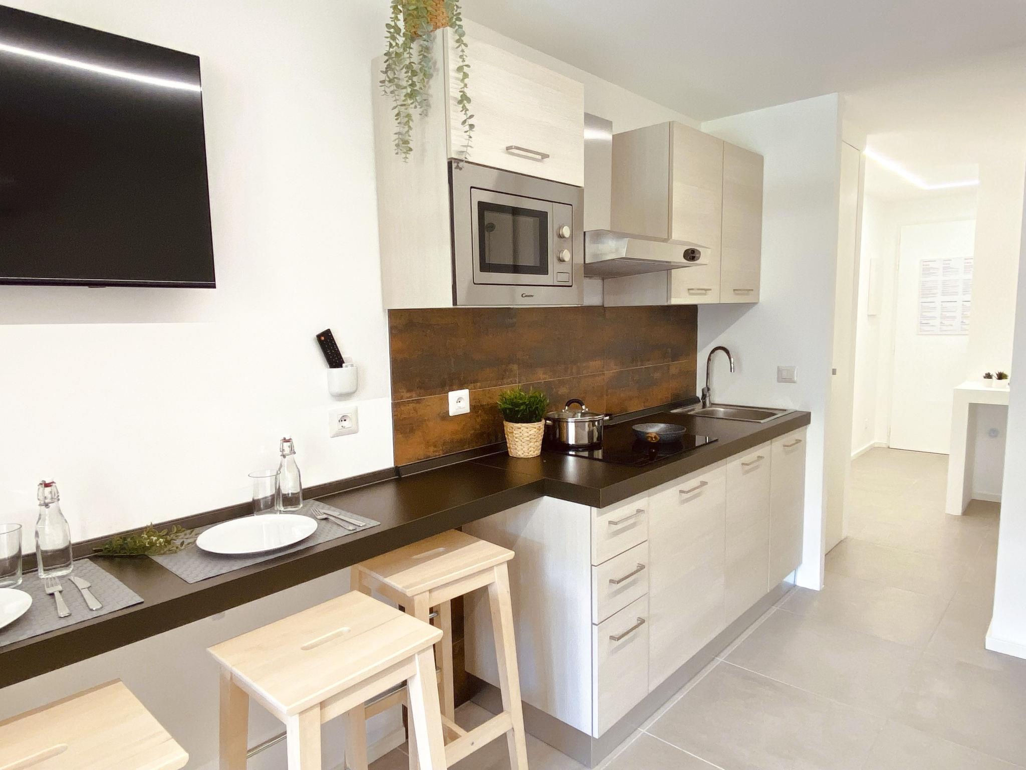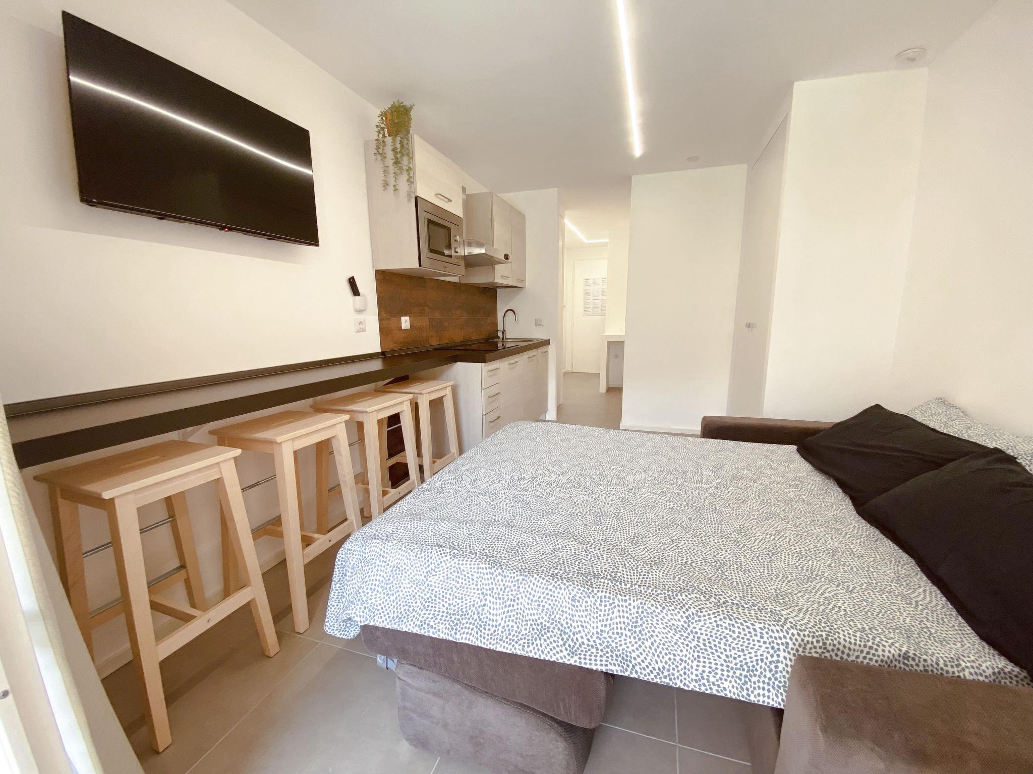 "L'Esquinade (J2 206)", 1-room studio 24 m2 on 1st floor. Object suitable for 2 adults + 2 children. Living room with 1 double sofabed (140 cm, length 190 cm), TV (flat screen). Exit to the terrace. Sleeping alcove with 1 x 2 bunk beds (80 cm, length 190 cm). Kitchenette (4 hot plates, dishwasher, toaster, microwave, electric coffee machine). Shower/WC. Electric heating. Terrace 8 m2, roofed. Terrace furniture. Facilities: Internet (WiFi, extra). Parking (1 car). Please note: non-smokers only. Smoke alarm. Instead of an enclosed bedroom, some sleeping areas are located in an open-plan area (gallery, alcove, etc.). Offer by a private individual according to Art. 155, IV of CGI.