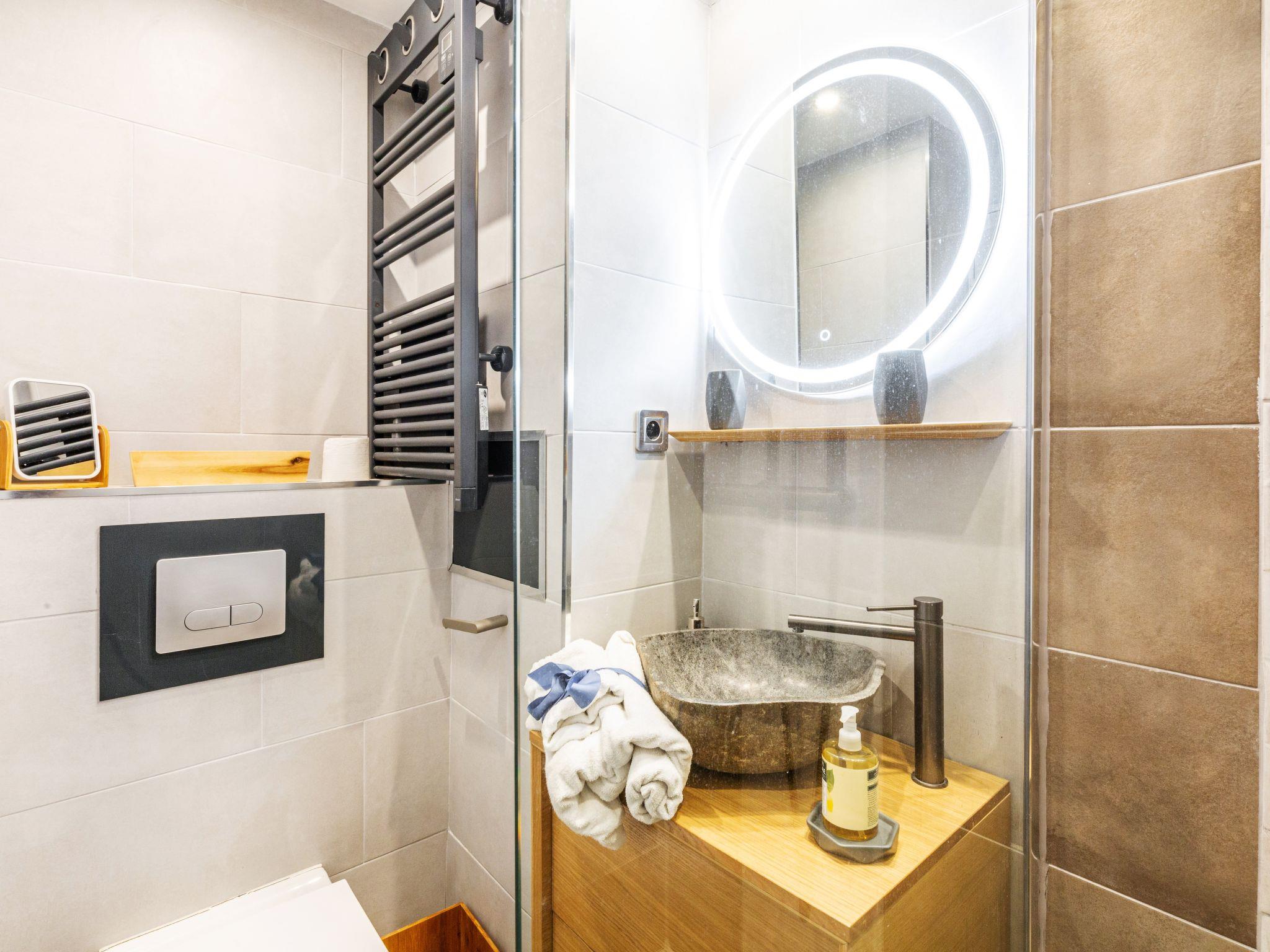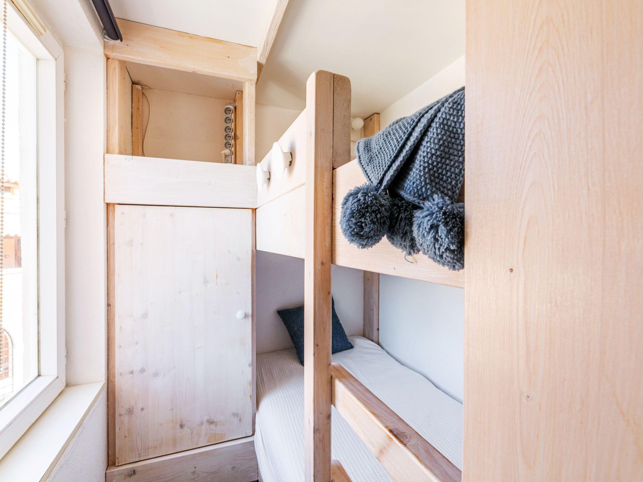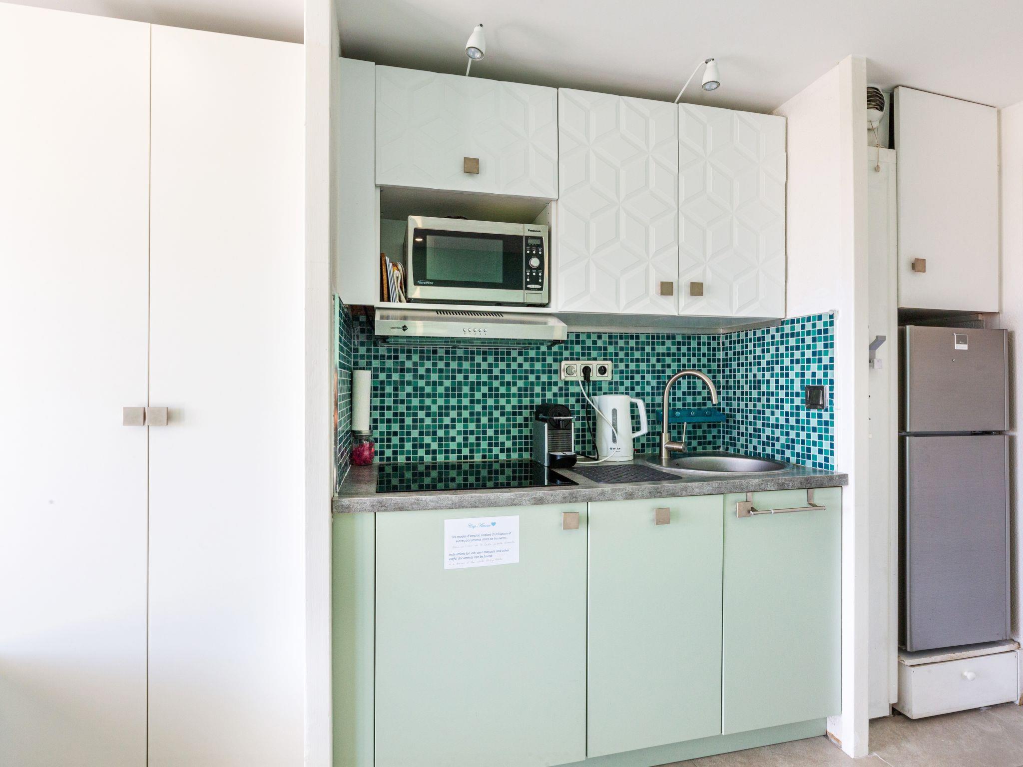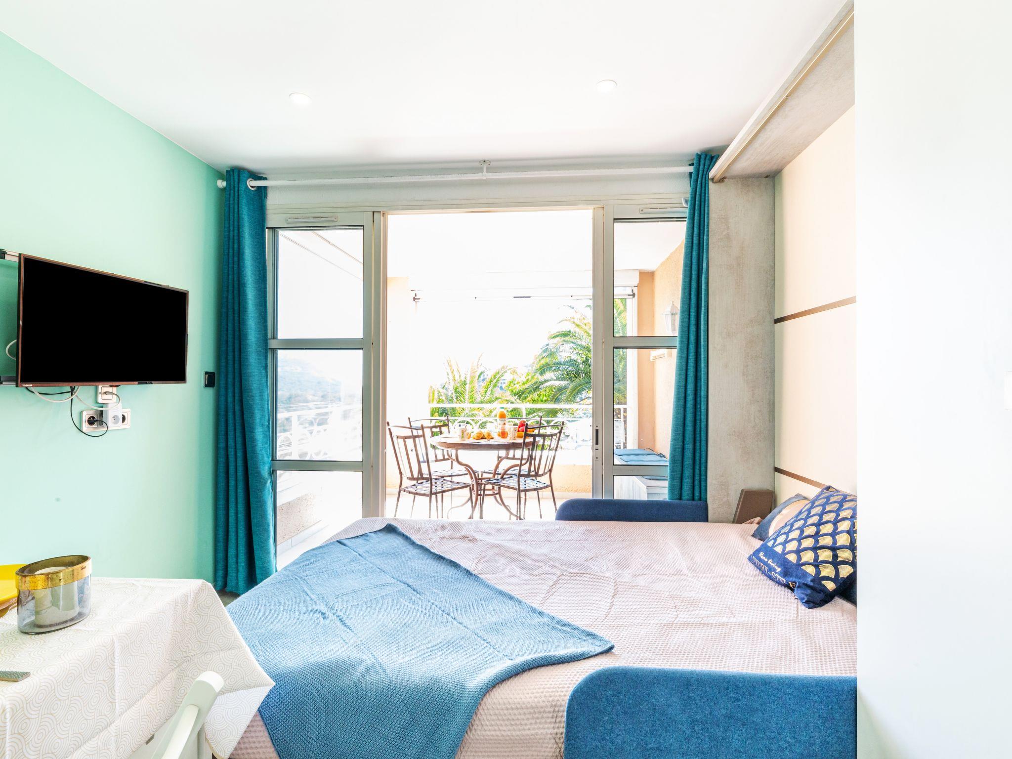 "L'Esquinade P1 101", 1-room studio 24 m2, on the ground floor. Object suitable for 2 adults + 2 children. Fully renovated in 2021, modern and cosy furnishings: living room with 1 double fold-away bed (140 cm, length 190 cm), hydro massage bath, TV, flat screen and air conditioning. Exit to the terrace. Sleeping alcove with 1 x 2 bunk beds (90 cm, length 190 cm). Kitchenette (dishwasher, 3 ceramic glass hob hotplates, toaster, kettle, microwave, freezer, electric coffee machine, Capsules for coffee machine (Nespresso) extra). Shower/WC. Electric heating, air-conditioning. Terrace 9 m2. Terrace furniture. Side view of the sea and the mountains. Facilities: washing machine. Internet (WiFi, extra). Parking (1 car). Please note: non-smokers only. Maximum 1 small pet/ dog allowed. Smoke alarm. Instead of an enclosed bedroom, some sleeping areas are located in an open-plan area (gallery, alcove, etc.). Offer by a private individual according to Art. 155, IV of CGI.