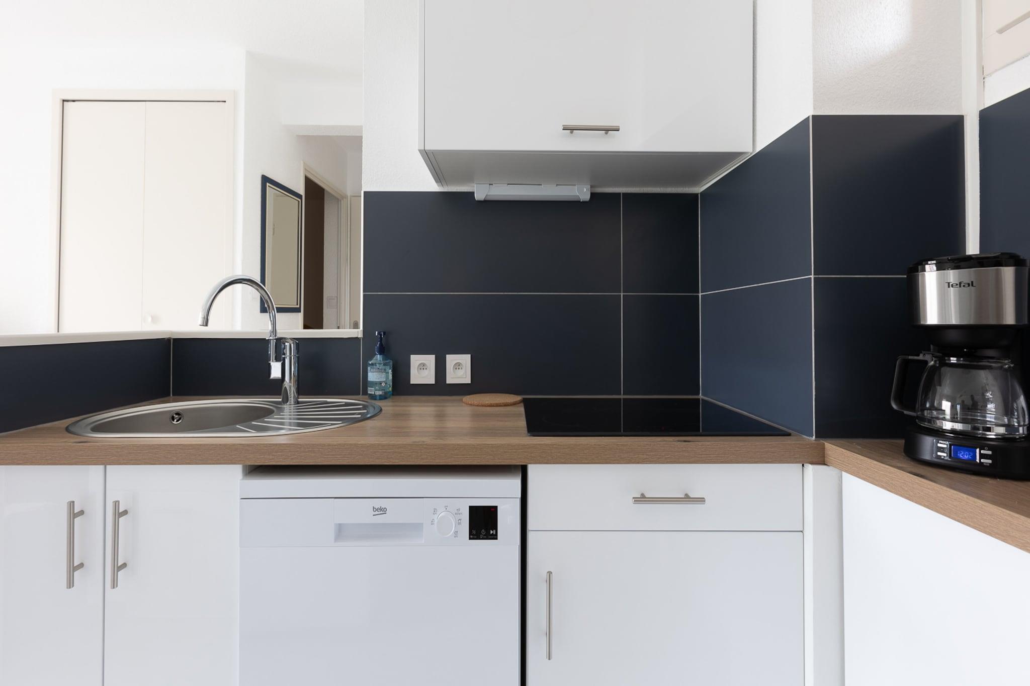 Denne 30 m² store lejlighed i Agde er perfekt til op til 6 gæster, og tilbyder et veldesignet og hyggeligt rum med 1 soveværelse. Beliggende bekvemt tæt på byens centrum giver det nem adgang til alle fornødenheder og attraktioner. Ejendommen ligger 150 meter fra supermarkedet "Proxi", 200 meter fra sandstranden og 500 meter fra restauranten "Perle de la Mer." Dens faciliteter og fælles opvarmet swimmingpool gør det til et fremragende valg for en afslappende ferie. Lejligheden har balkon med udendørsmøbler, så gæsterne kan nyde den friske luft og omgivelserne. Yderligere funktioner omfatter en hårtørrer, fælles opvarmet swimmingpool, udendørs parkering i samme bygning og et tv til underholdning. Det åbne køkken er fuldt udstyret med alt det nødvendige til at tilberede måltider, herunder køleskab, mikroovn, fryser, opvaskemaskine, kaffemaskine, brødrister, kedel og tallerkener/bestik. Uanset om du slapper af ved poolen, nyder den nærliggende strand eller udforsker lokale spisemuligheder, tilbyder denne lejlighed alt hvad du behøver for et behageligt og behageligt ophold i Agde.