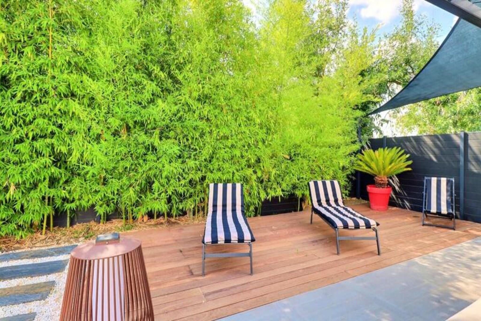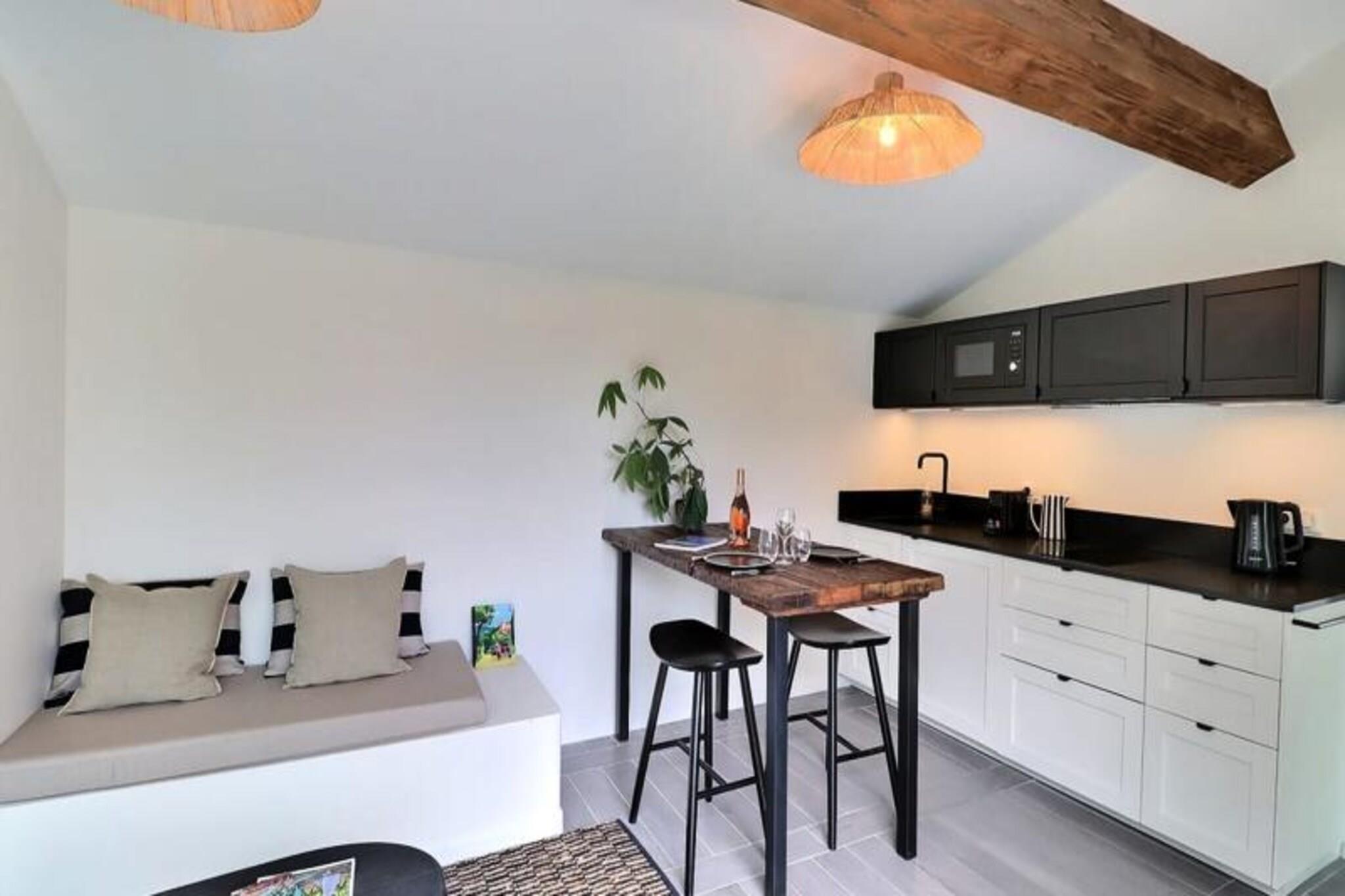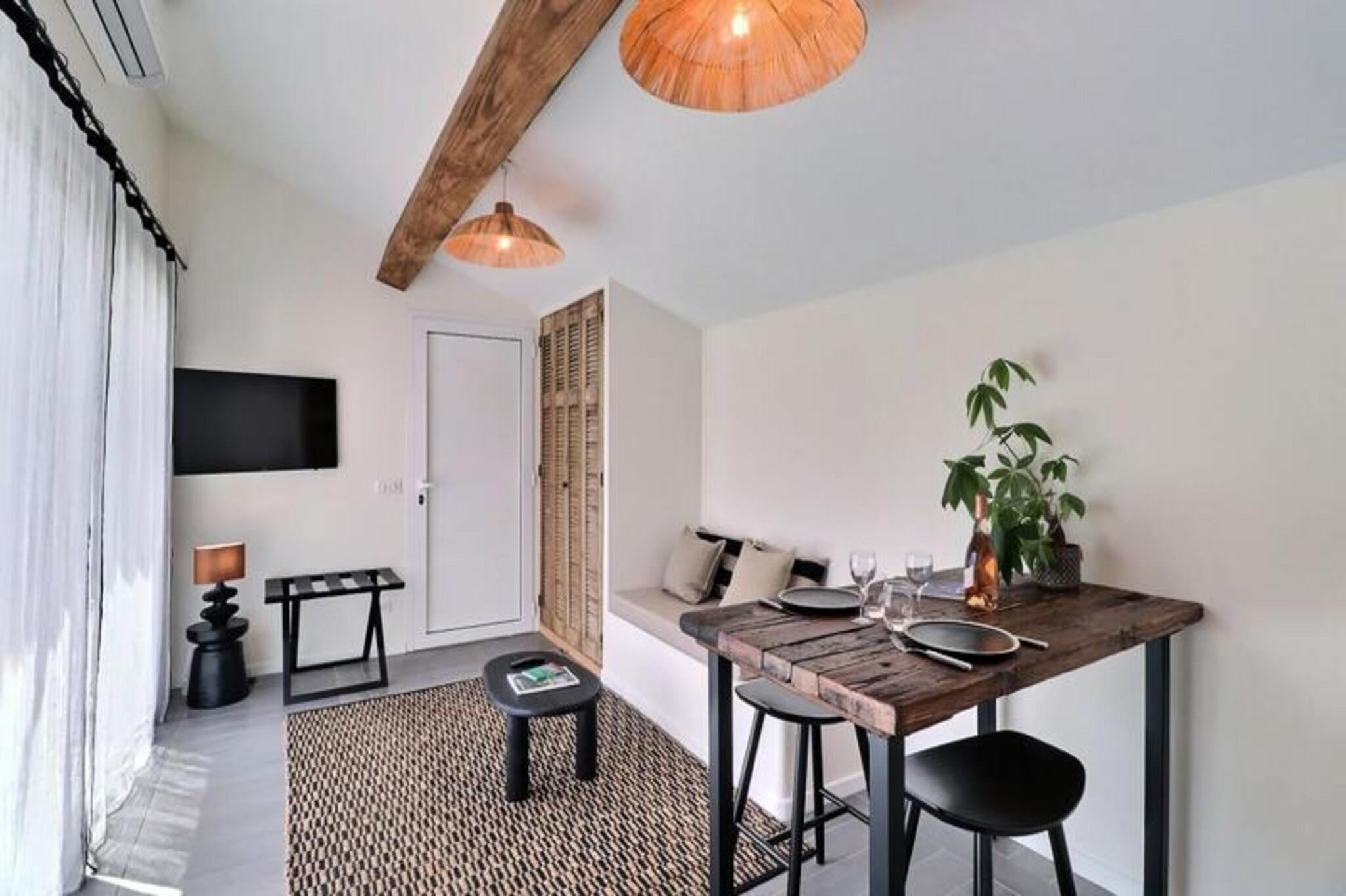Dette charmerende feriehus i hyttestil tilbyder en perfekt blanding af moderne komfort og en bohemeånd, ideel til 2 gæster. Soveværelset med aircondition har en stor dobbeltseng (160x200) med direkte adgang til en møbleret terrasse, mens opholdsstuen indeholder en sofa, væghængt tilsluttet tv og hyggelig plads til at slappe af. Med privat parkering til rådighed, sikrer denne bolig et fredeligt ophold væk fra hverdagens travlhed. Denne ejendom ligger i det rolige Pont de l'Arc-distrikt i Aix-en-Provence, kun 10 minutter fra det historiske centrum. Gæsterne kan udforske nærliggende attraktioner såsom Cours Mirabeau, lokale springvand og kulturelle steder, samt nyde naturskønne vandreture på Sainte-Victoire-bjerget. Ejendommen er også ideelt beliggende for at få adgang til destinationer som Marseille, Avignon og Lourmarin, hvilket gør det til en perfekt base for udforskning. Det moderne, fuldt udstyrede køkken byder på en 2-brænder keramisk kogeplade, mikroovn, køleskab med lille fryser og Nespresso kaffemaskine. Det stilfulde badeværelse har italiensk bruser og badehåndklæder. En stor terrasse med modulopbyggede siddepladser, en overdækket pergola med liggestole og en smuk have giver det perfekte sted at slappe af i naturen.