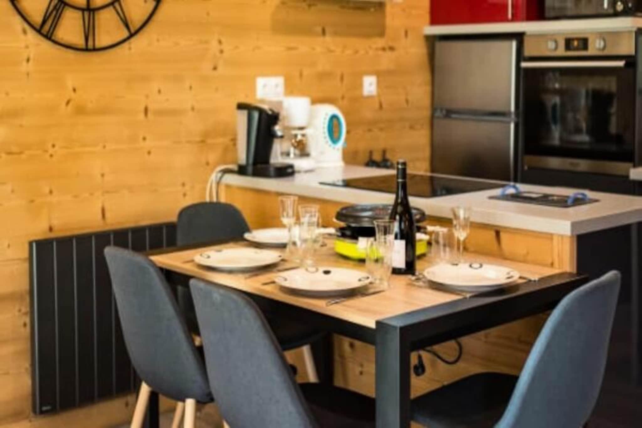 Oplev denne charmerende lejlighed i chalet-stil beliggende i Albiez-Montrond, kun få minutters gang fra skiløjperne. Denne hyggelige lejlighed er perfekt til en ferie i bjergene og kan komfortabelt rumme 4 gæster med mulighed for at være vært for op til 6 personer. Med to indbydende soveværelser og alle de nødvendige bekvemmeligheder, lover det et mindeværdigt ophold i hjertet af bjergene. Det åbne køkken er fuldt udstyret med opvaskemaskine, hvidevarer og raclette-, fondue- og pierradesæt, ideelt til at nyde hyggelige måltider. Stuen har et tv til din afslapning. Soveværelse 1 byder på en komfortabel dobbeltseng, mens soveværelse 2 har to køjesenge, hvilket gør det perfekt til børn eller venner. Yderligere soveplads er tilgængelig på sovesofaen i stuen. Badeværelset har et badekar til en afslappende oplevelse efter en dag på pisterne, med separate toiletter. Udenfor finder du et rum med bord og stole, perfekt til at nyde den smukke udsigt over Aiguilles d'Arves. Lejligheden inkluderer også et skiskab og småbørnsudstyr såsom en høj stol, rejseseng, badesæde og børns spil og bøger. Kæledyr er velkomne, og boligen byder på en varm og indbydende atmosfære for hele familien.