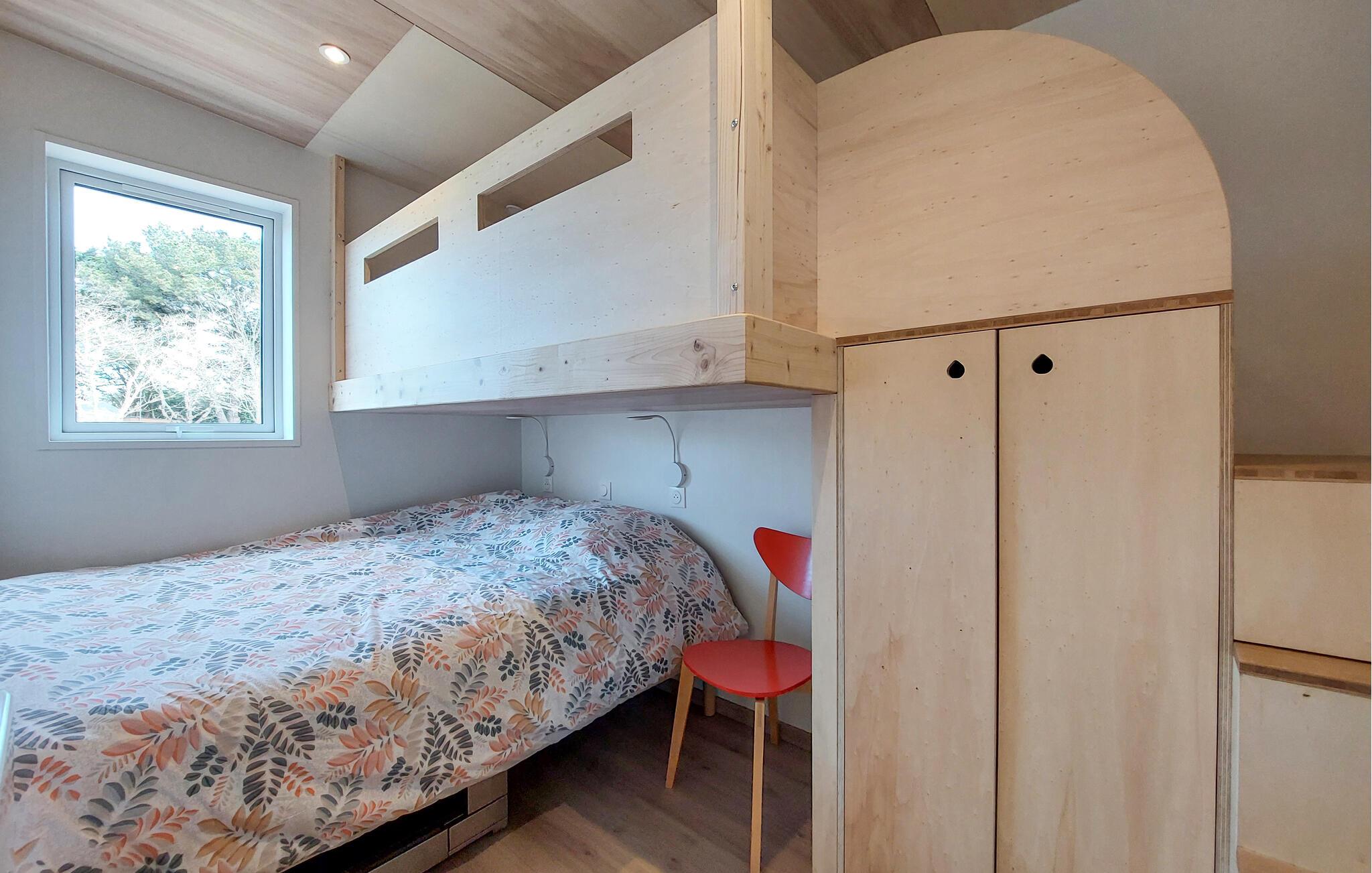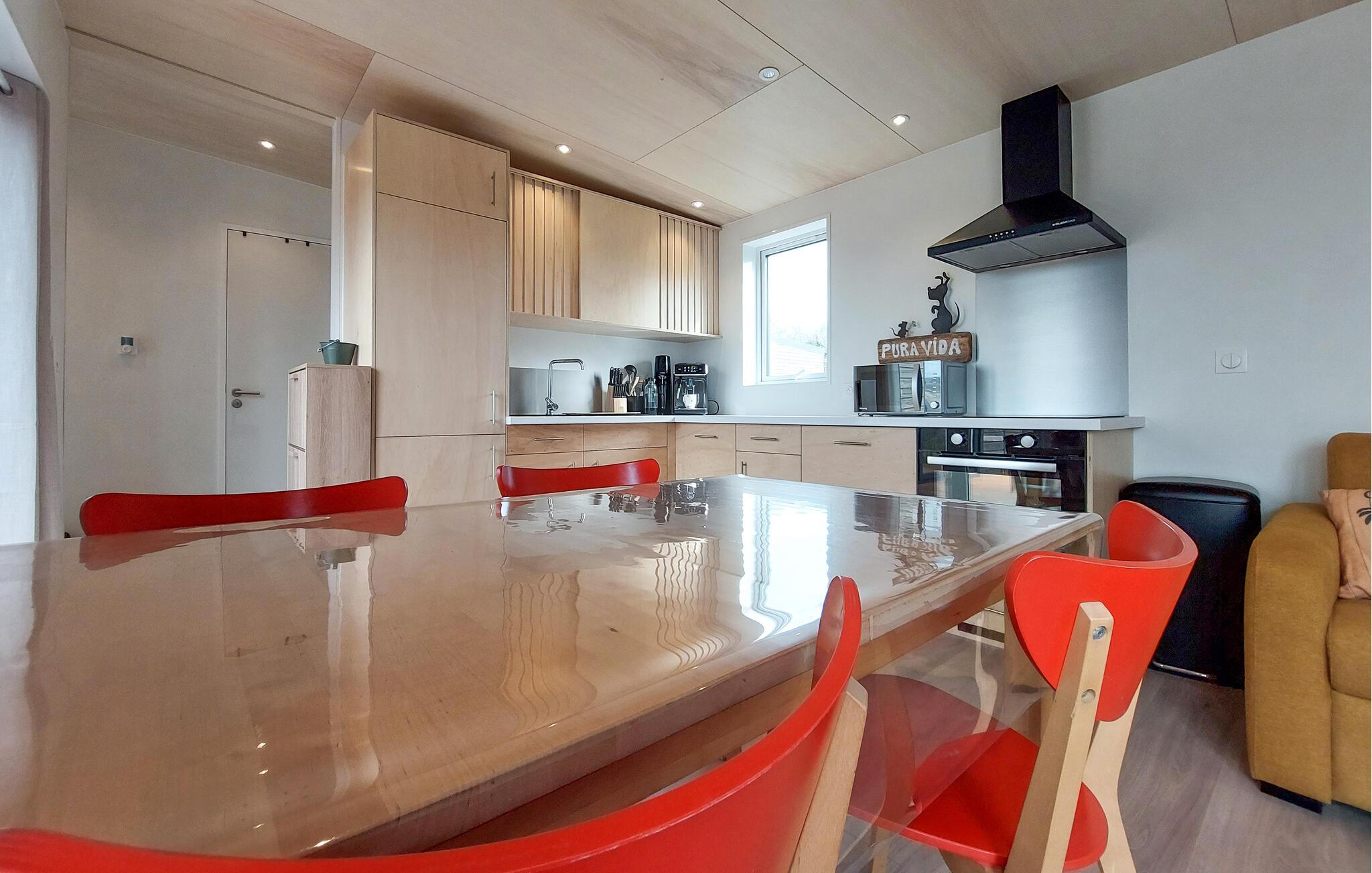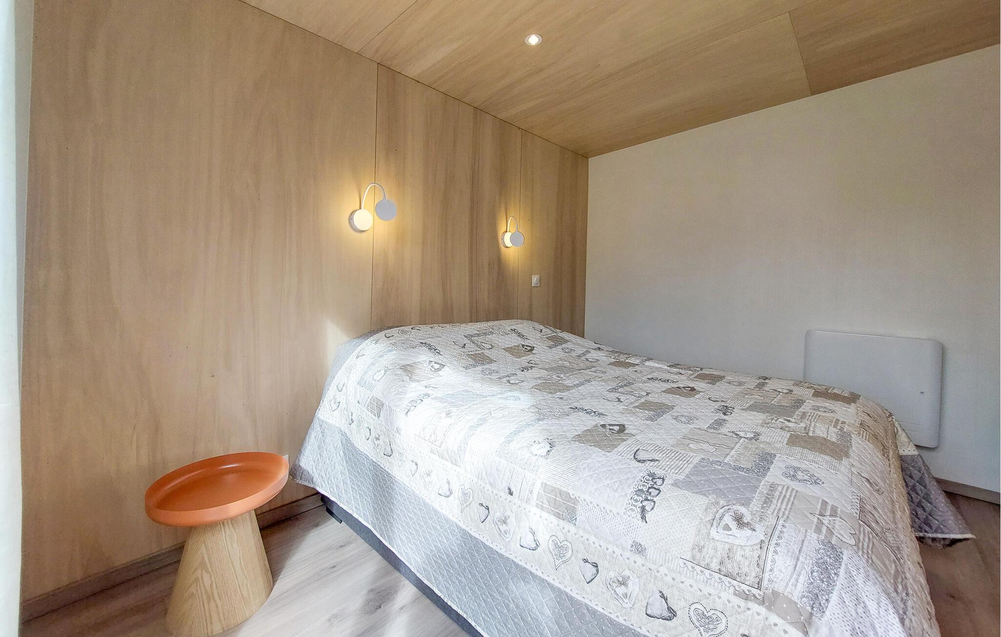 Tilbring ferien i denne moderne, komfortable indkvartering med træfacade og en stor terrasse. Chaleten ligger i et velholdt feriekompleks i Bétahon, kun få skridt fra havet. Nyd den hjemlige atmosfære i lyse, naturlige toner. Den åbne opholdsstue er udstyret med en komfortabel sofa, et tv og en stilfuld spiseplads. I kan nemt selv sørge for maden i køkkenet. Få friske ingredienser og tilbered lækre retter sammen.