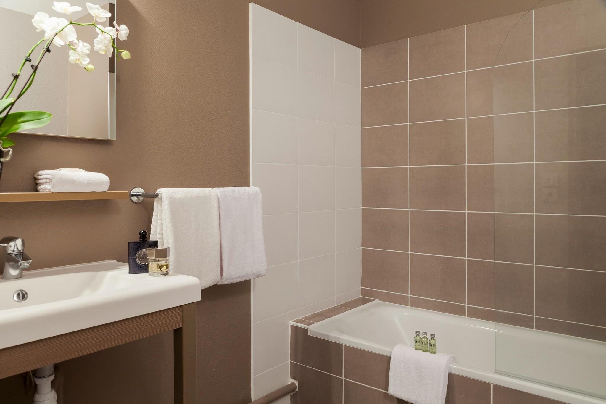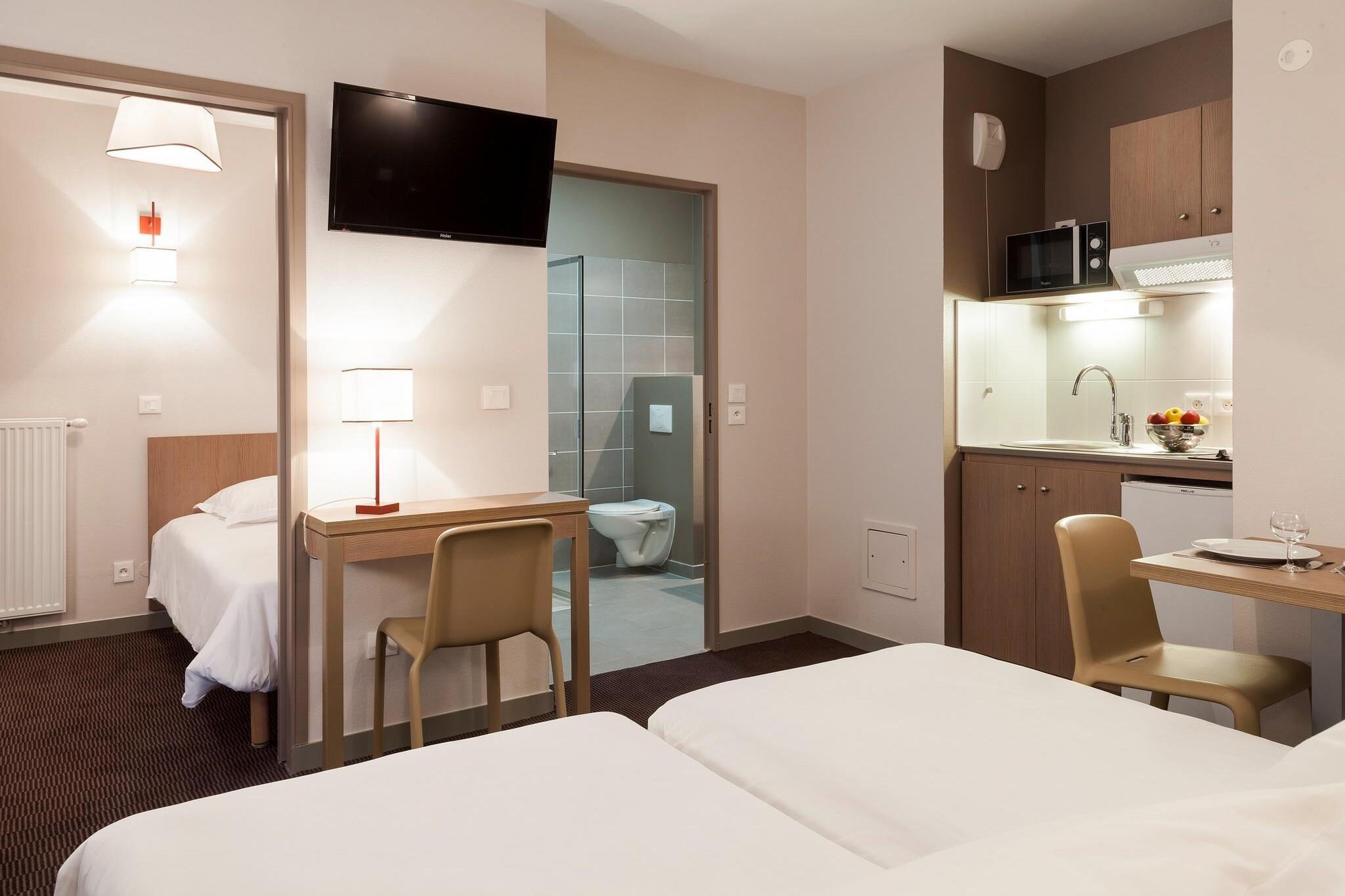 Rummelig lejlighed med 1 soveværelse på 38 m² med plads til op til 4 personer, ideel til både forretningsrejser og ferieophold på den fransk-schweiziske grænse. Soveværelset er møbleret med enten en dobbeltseng 160×200 eller to enkeltsenge 80×200, afhængigt af tilgængelighed, og stuen har en komfortabel dobbeltsovesofa og et tv. Lejligheden har et privat badeværelse med badekar og et fuldt udstyret tekøkken, så du kan nyde komforten ved et lejlighedshotel under dit ophold. Gæsterne har adgang til hele udvalget af tjenester på Nehô Suites Porte de Genève – Gare Annemasse. Nyd meget hurtig Wi-Fi, døgnåben reception, bagageopbevaring, parkeringskælder mod et gebyr, cykelgarage og et selvbetjeningsvaskeri. En varm og kold morgenmadsbuffet serveres hver morgen fra kl. 7.00 til 10.00, og der er døgnåben spisemulighed på stedet. Barnesenge tilbydes gratis efter anmodning, og kæledyr under 30 kg er tilladt mod et tillæg. Beliggenheden er perfekt til at udforske området. Annemasse centrum ligger en kort gåtur væk, og Genève og Genevesøen kan nås på cirka 20 minutter i bil eller tog. Populære attraktioner omfatter Jet d'Eau, Genèves gamle bydel, Parc La Grange og Mont Salève, som tilbyder panoramaudsigt og vandreture. Gæsterne kan også nyde søkrydstogter, cykling, lokale markeder og shopping i både Frankrig og Schweiz. Dette lejlighedshotel kombinerer komforten ved et hotel med friheden ved en lejlighed, hvilket gør det til et ideelt valg til korte eller længere ophold. Cykelopbevaring er tilgængelig for (EURO1/dag).