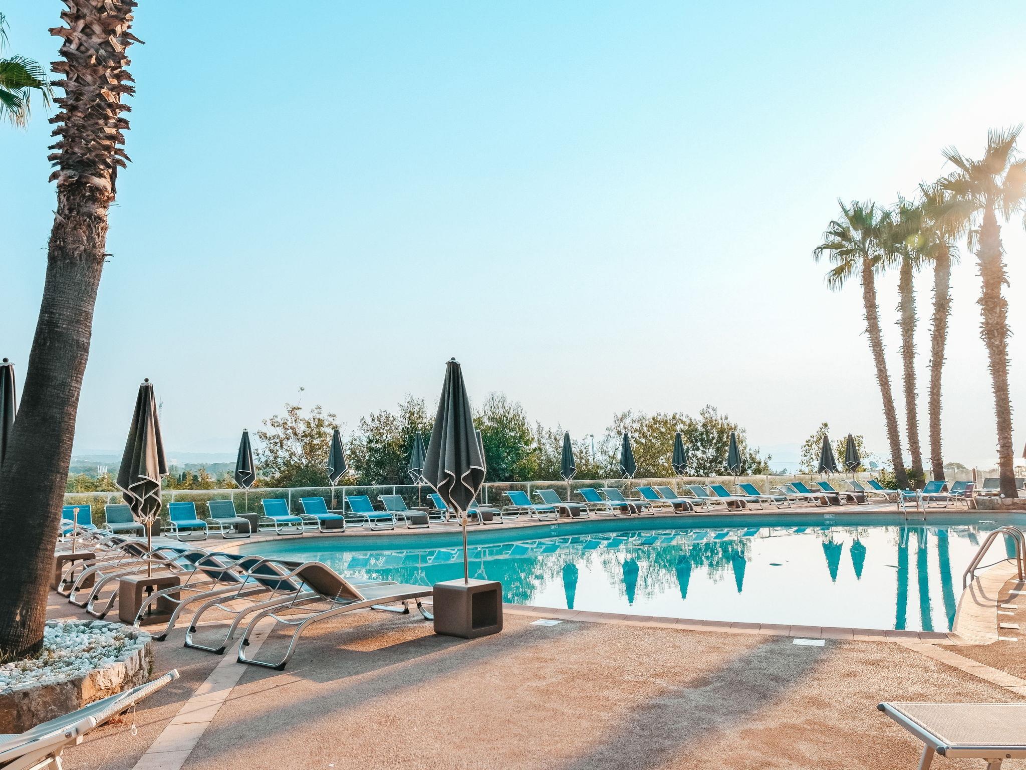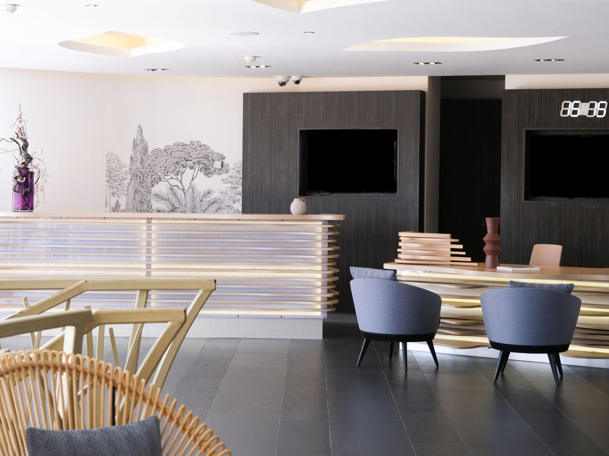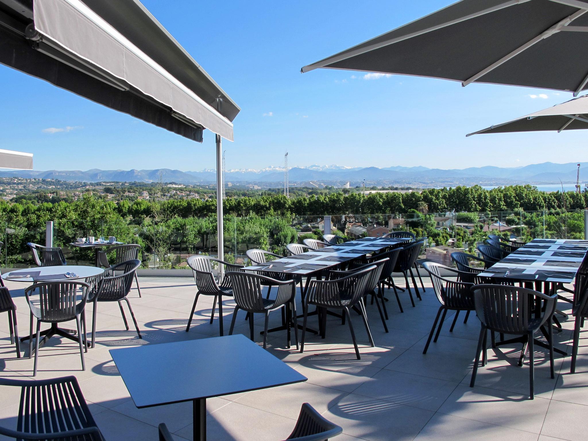 Residence "Résidence Thalazur Antibes", 4 storeys. 46 apartments in the residence. 4 km from the centre of Antibes, 14 km from the centre of Cannes, 20 km from the centre of Nice, in the residential district, 3 km from the sea. For shared use: property 17'000 m2 (fenced), 2 swimming pools kidney-shaped (18 x 12 m, seasonal availability: 01.Jan. - 31.Dec.) with salt water. Children's pool. In the complex: reception, restaurant, bar, WiFi, sauna, fitness room, massage (extra). Steam room, lift. Bread roll service and breakfast full board half board possible (extra). E-charging station. Shop 800 m, bus stop 400 m, sandy beach 4 km pebble beach 3 km. Please note: reception open 01:00-24:00 hrs. Residence with electric gates.