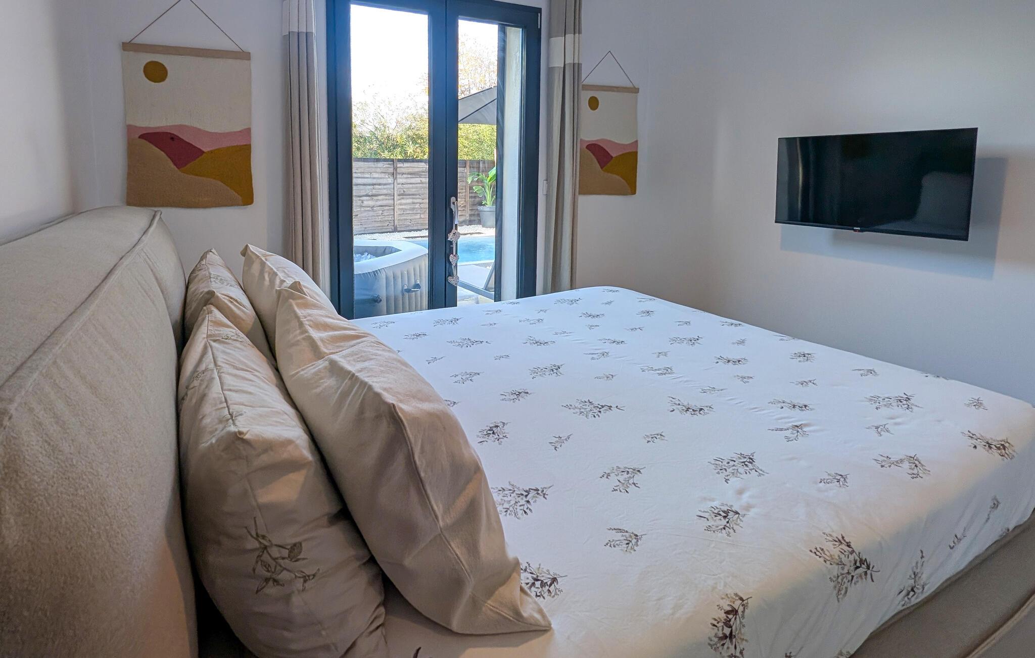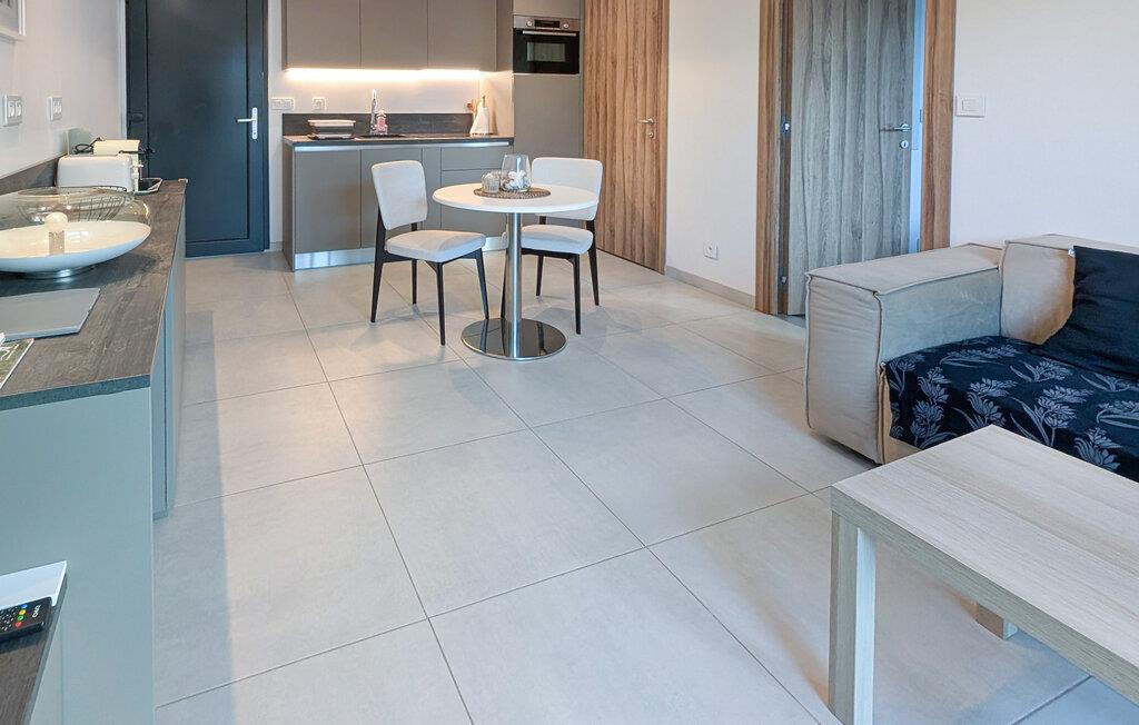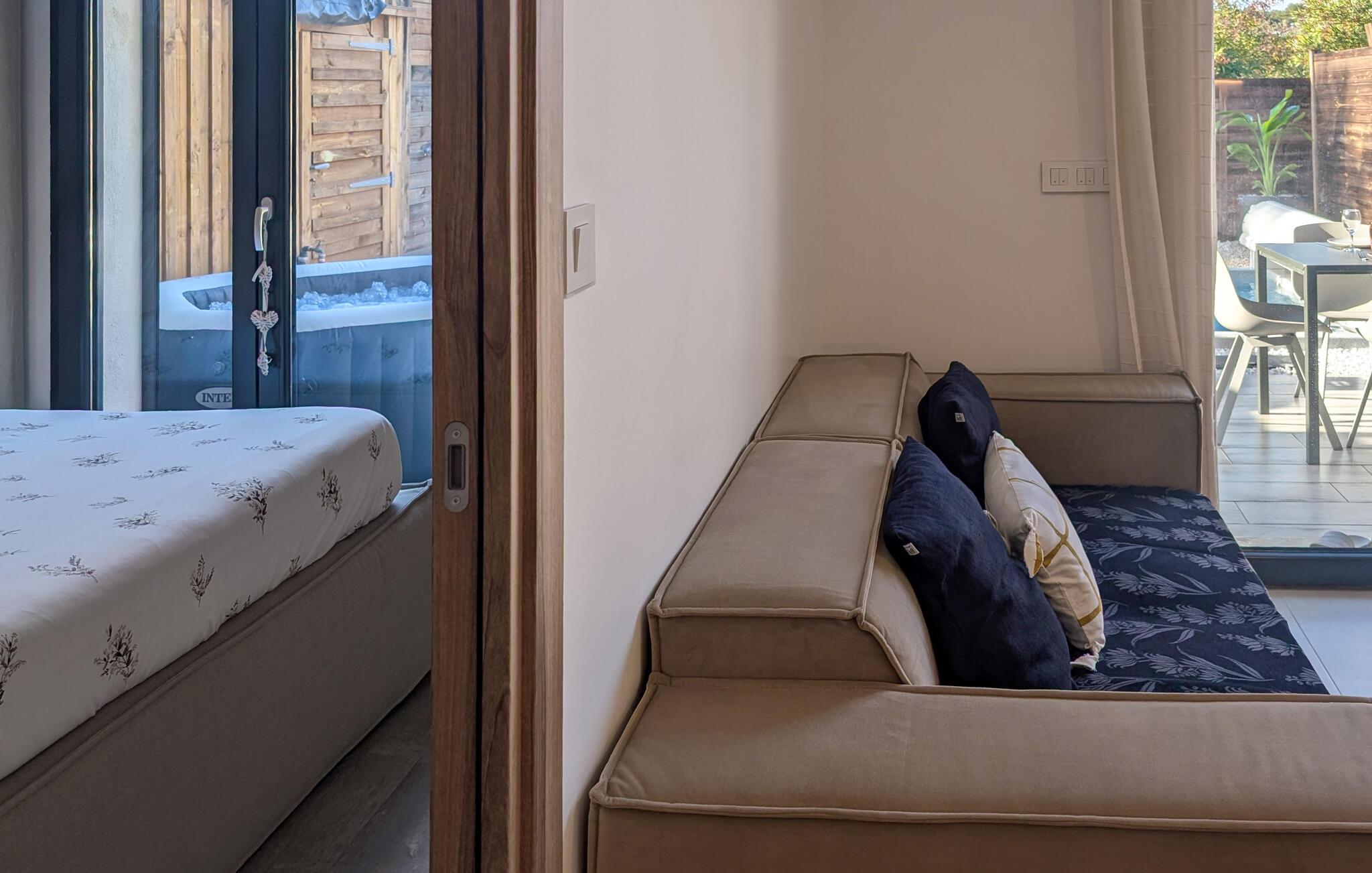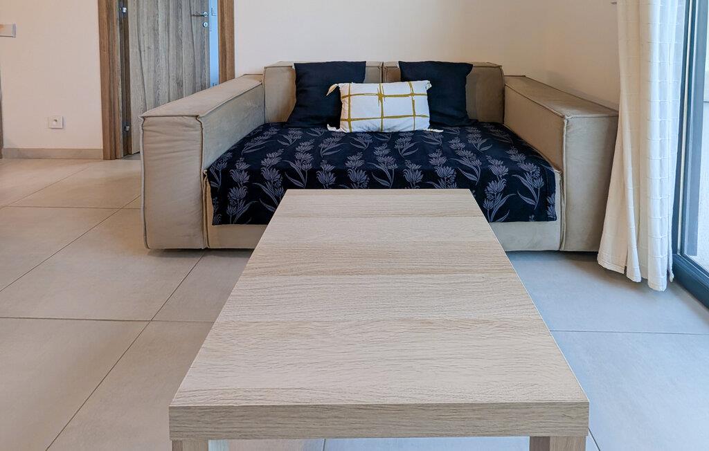 Indenfor vil du nyde optimal komfort med aircondition og et fuldt udstyret køkken, herunder Nespresso kaffemaskine, opvaskemaskine, vaskemaskine og alt hvad du behøver til dit ophold. Den rummelige og moderne stue kan rumme en tredje gæst på en sovesofa og har et Smart TV til din underholdning. Det store soveværelse er en hyggelig oase med en komfortabel 160 cm seng, et smart-tv og aircondition, der garanterer afslappende nætter. Sengen vil blive redt ved din ankomst, og friske håndklæder vil også blive leveret.