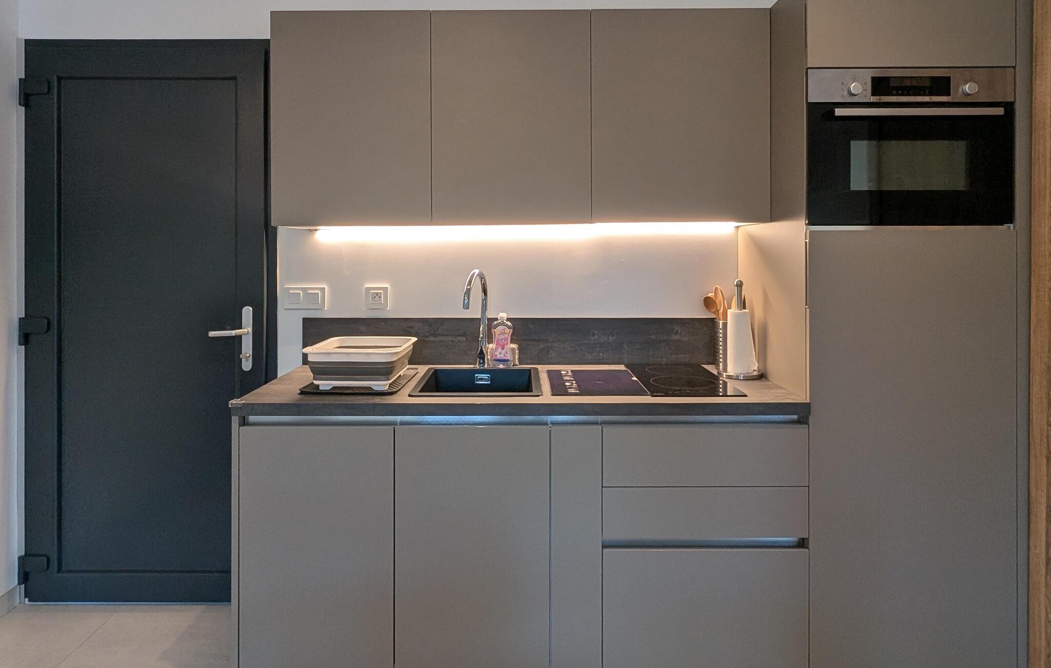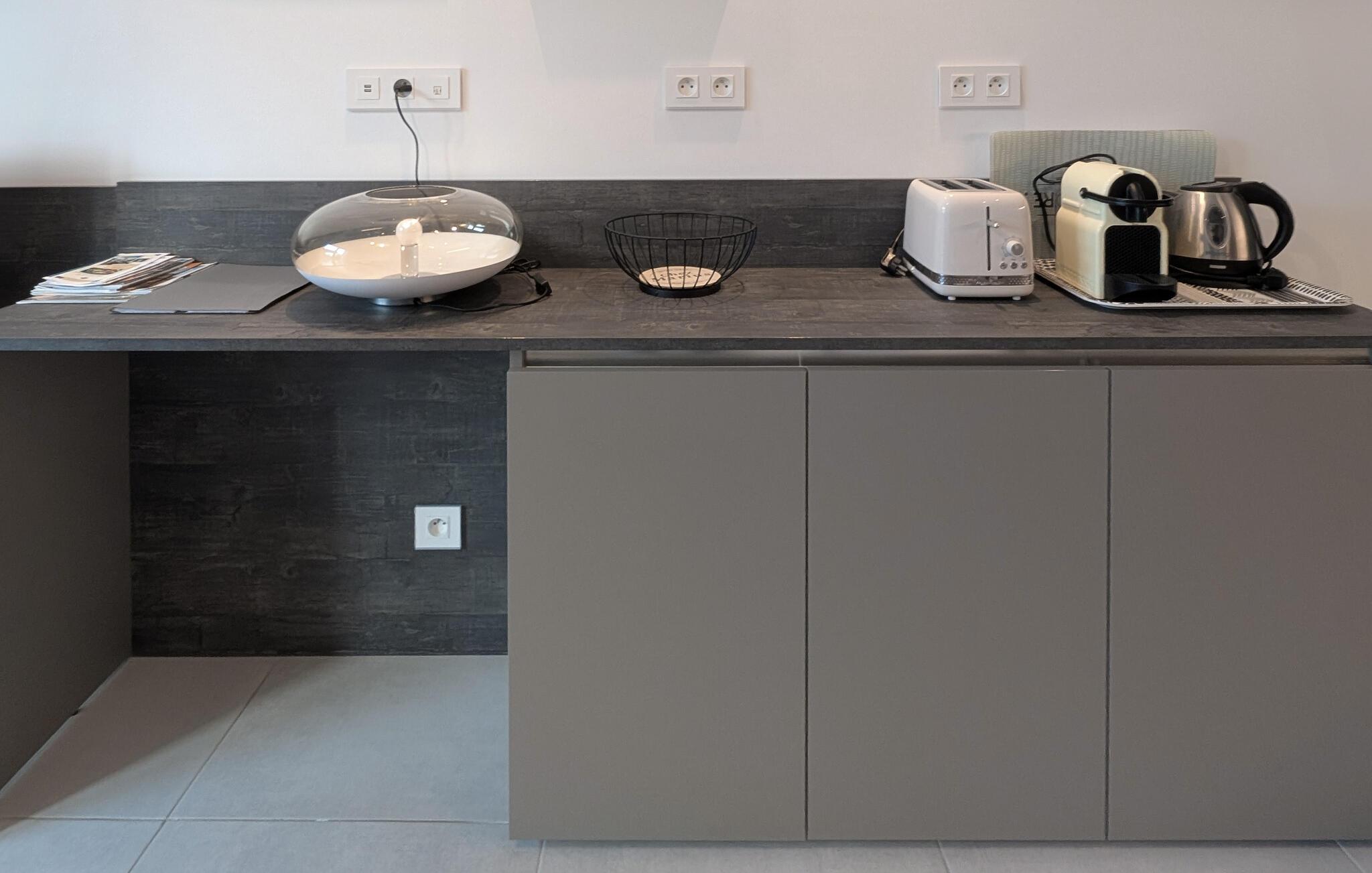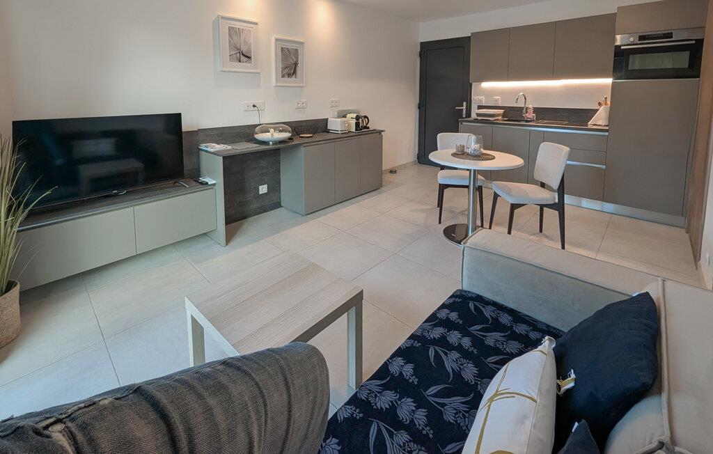 Indenfor vil du nyde optimal komfort med aircondition og et fuldt udstyret køkken, herunder Nespresso kaffemaskine, opvaskemaskine, vaskemaskine og alt hvad du behøver til dit ophold. Den rummelige og moderne stue kan rumme en tredje gæst på en sovesofa og har et Smart TV til din underholdning. Det store soveværelse er en hyggelig oase med en komfortabel 160 cm seng, et smart-tv og aircondition, der garanterer afslappende nætter. Sengen vil blive redt ved din ankomst, og friske håndklæder vil også blive leveret.