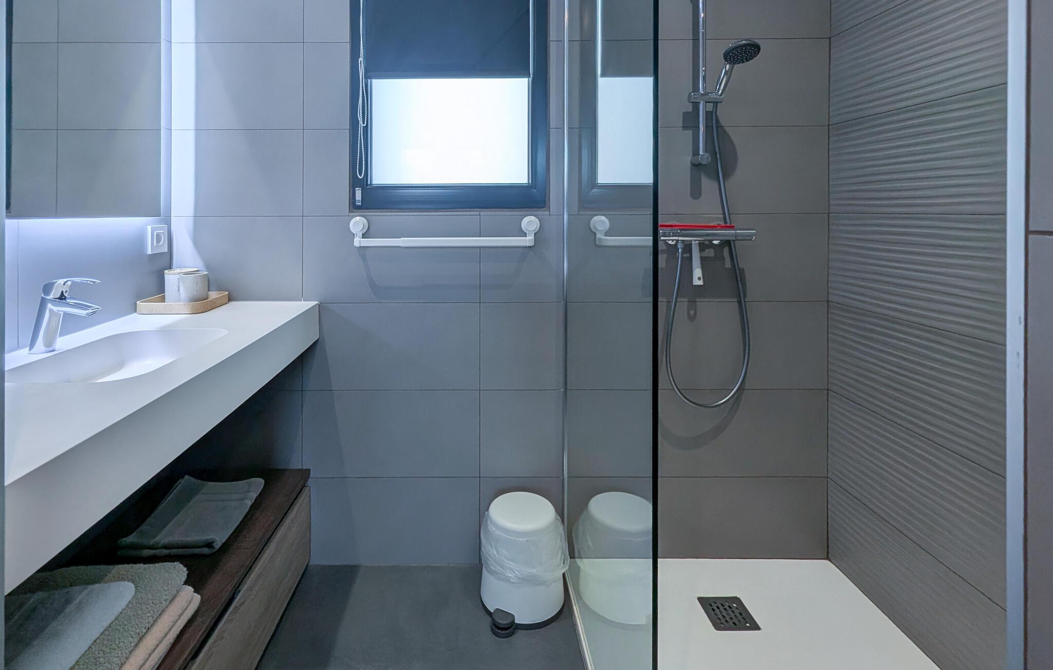 Det elegante badeværelse har en moderne bruser, og det separate toilet giver ekstra privatliv. Du vil også have adgang til højhastighedsinternet for at holde dig forbundet under hele dit ophold.