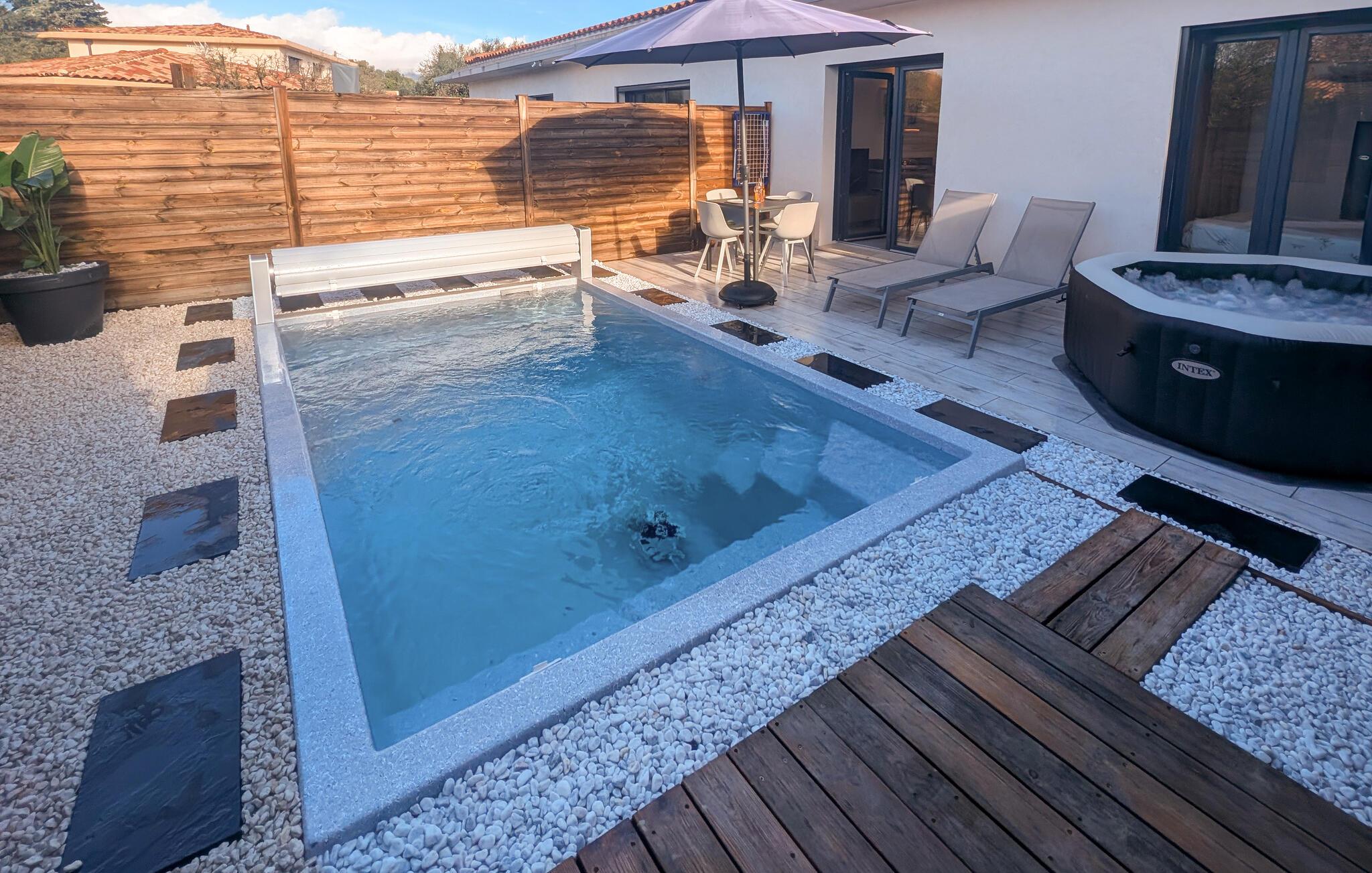 Denne fortryllende beliggenhed på den franske riviera er meget mere end blot en lejlighed – den er en oase af fred og komfort. Lejligheden er designet med dit velvære i tankerne og tilbyder en perfekt blanding af moderne bekvemmeligheder og rolige omgivelser. Slap af Slap af i den opvarmede 10 m² store pool, som er åben hele året afhængigt af vejret, eller forkæl dig selv med den ultimative afslapningsoplevelse i din egen private spa. Den private terrasse, der er udstyret med liggestole, havemøbler og bruser, er perfekt til Nyd solen eller tilbring en stille aften under stjernerne.