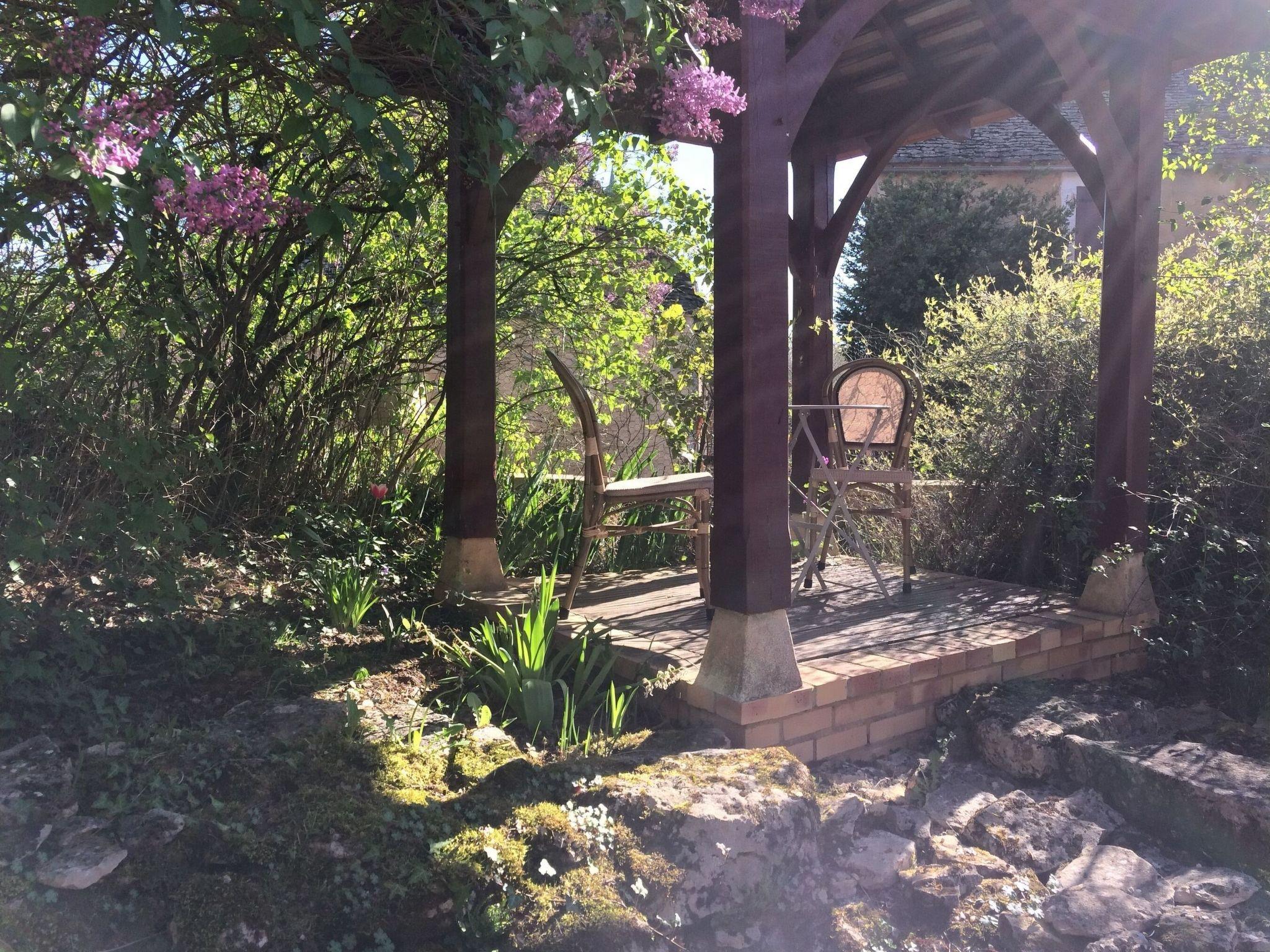 Outside: Private garden of 500 m2, not enclosed, with shaded terrace, south-facing Garden furniture and sunlit gazebo. Private car park