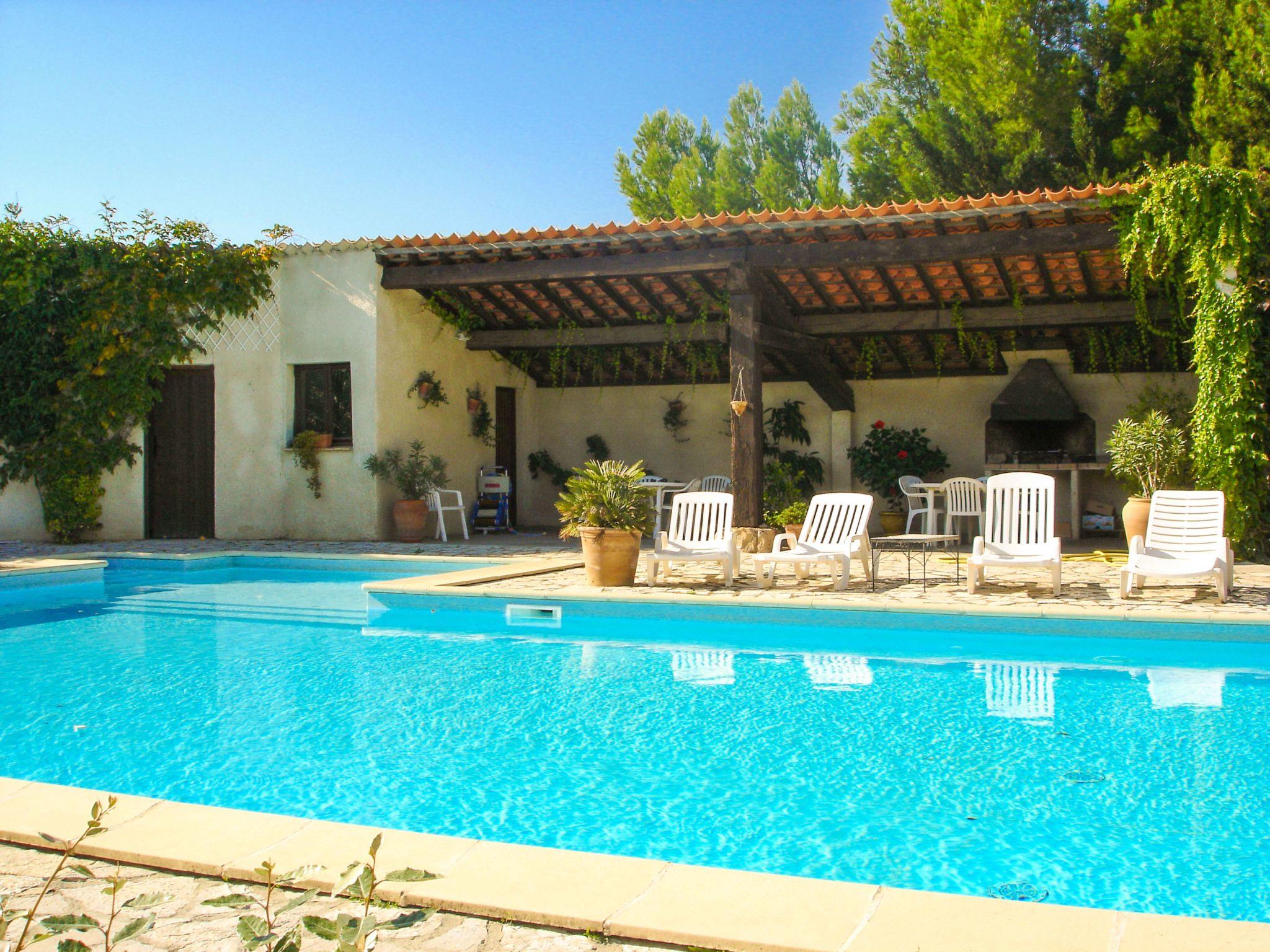 3 villas share the swimming pool with 1 barbecue, 1 summer kitchen, 1 shower, 1 changing room and garden furniture with deckchairs. Swimming pool with small 60 cm deep pool. Vine stumps provided for BBQ (1 private barbecue).