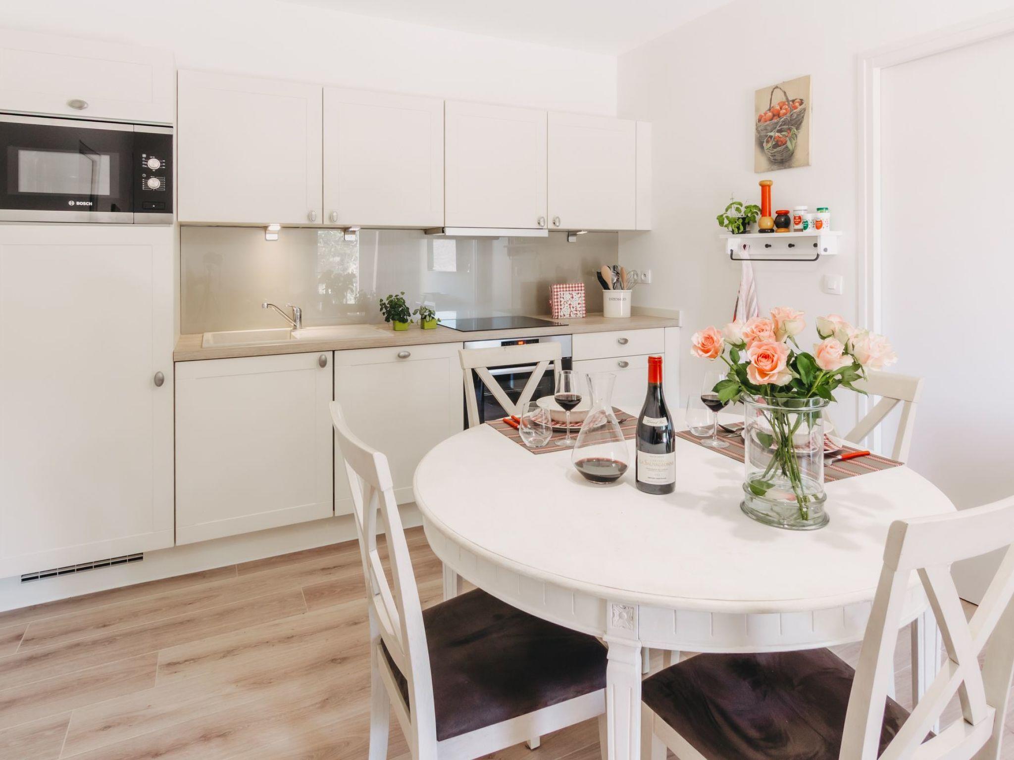 This spacious flat for 4 people with 2 bedrooms is available on the estate.The rooms and facilities:A separate entrance leads to the upper floor of the house. Here you will find the spacious living and dining room with open-plan kitchen. The kitchen is equipped with all the necessary cooking utensils, crockery, a dishwasher, coffee machine, microwave and oven, and there are also two beautiful bedrooms and a spacious bathroom, with direct access to the terrace, which has its own barbecue. The house is located in an 8000 square metre park and has a pool and parking facilities on the property.the flat itself has a washing machine, satellite TV and free WLAN is available throughout the flat.