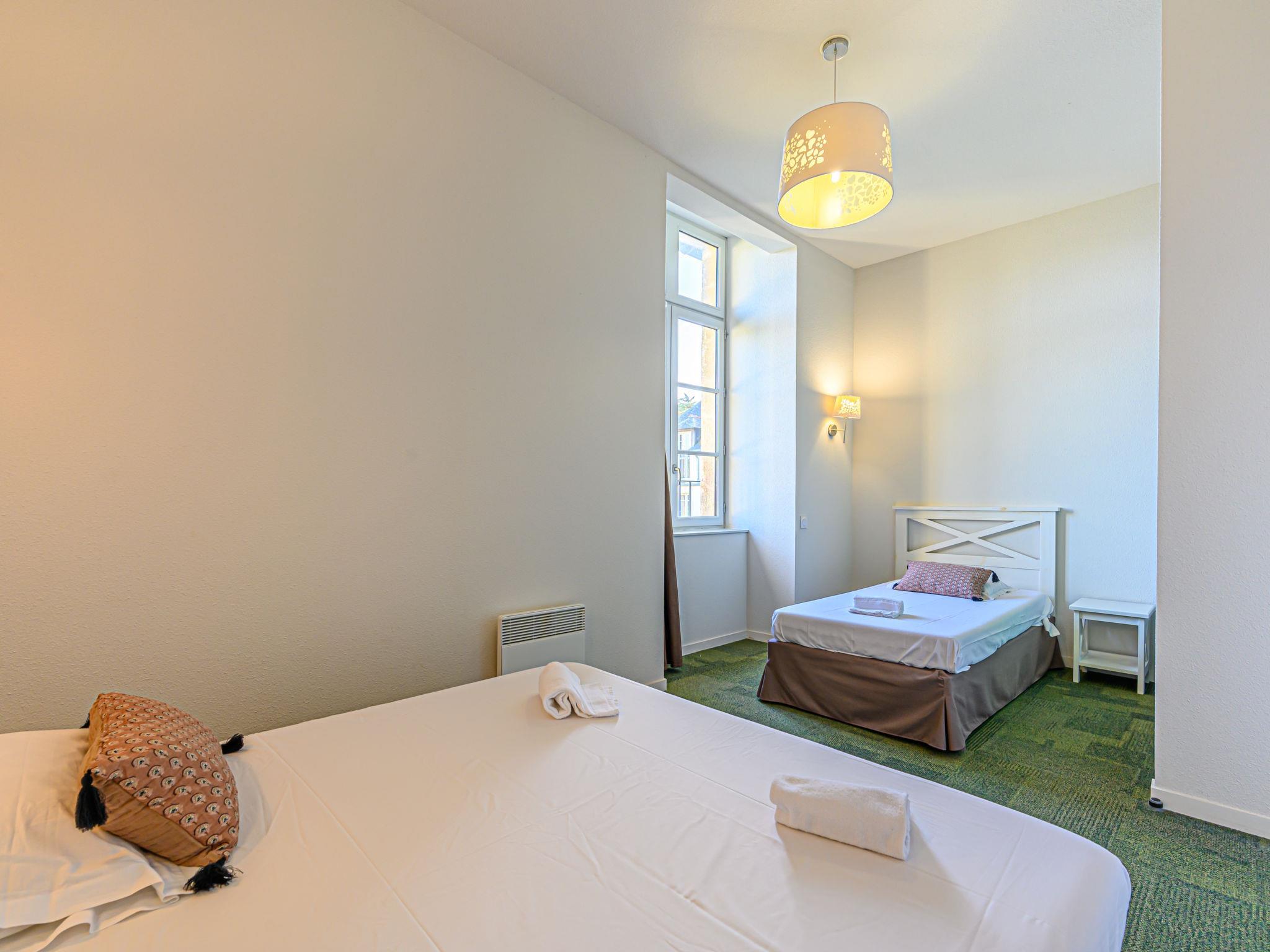 "Château De Kergonano,", 3-room apartment 56 m2 on 1st floor. Practical and beautiful furnishings: living/dining room with 1 double sofabed and TV (flat screen). Exit to the balcony. 1 room with 1 french bed (1 x 140 cm, length 190 cm). 1 room with 1 x 2 bunk beds (90 cm, length 190 cm). Kitchenette (dishwasher, 4 ceramic glass hob hotplates, toaster, kettle, microwave, electric coffee machine). Shower, sep. WC. Electric heating. Balcony. View of the swimming pool and the garden. Facilities: Internet (WiFi, extra). Parking. Please note: non-smokers only. Smoke alarm. Daily cleaning and change of linen possible on request and extra. Offer by a private individual according to Art. 155, IV of CGI. LOGEMENT A19