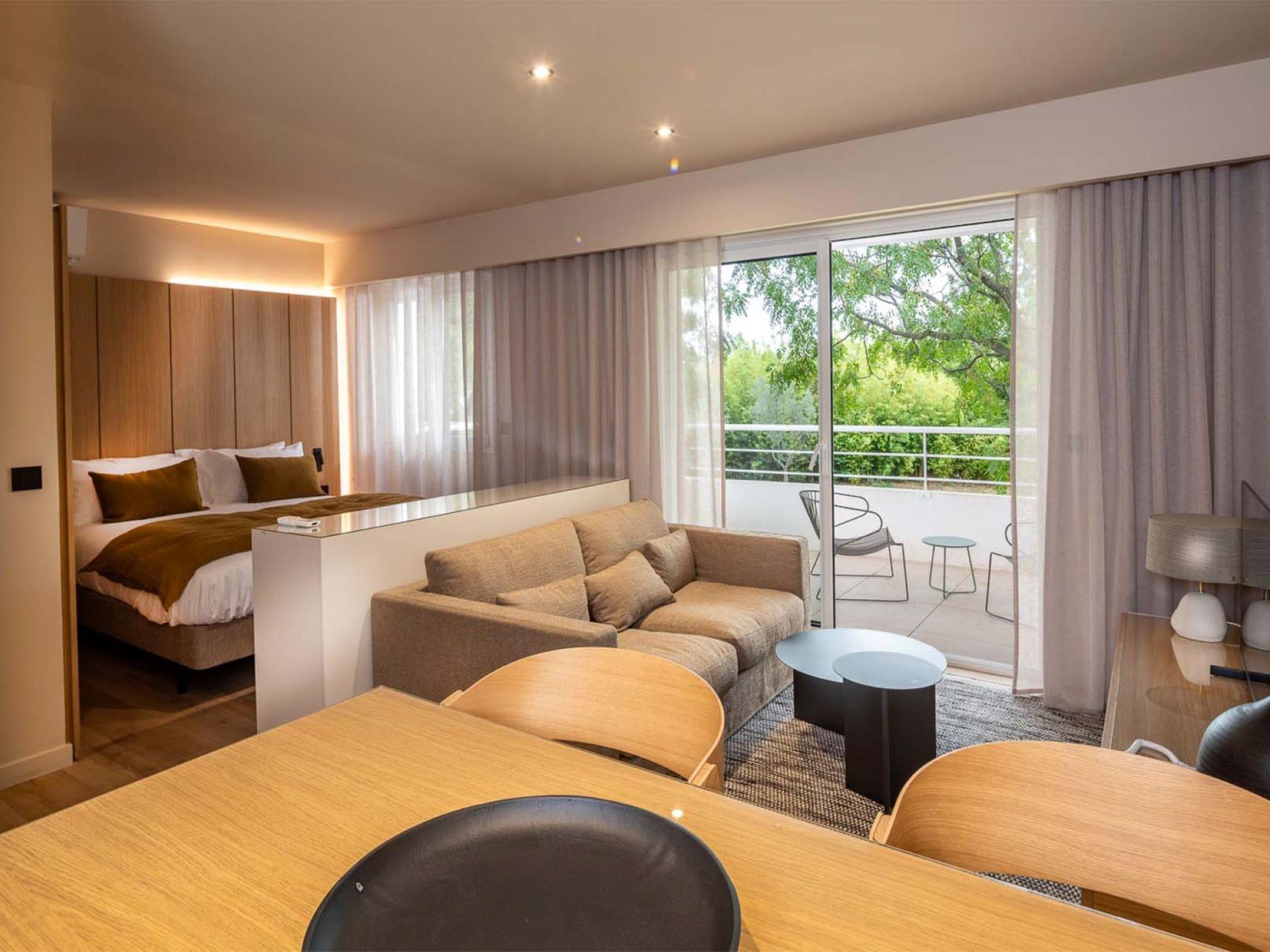 Modern, beautiful aparthotel "Horizon Resort Massane". 39 apartments in the residence. 3 km from the centre of Baillargues, 17 km from the centre of Montpellier, 27 km from the centre of La Grande Motte, 27 km from the sea, 27 km from the beach, on the golf course. For shared use: swimming pool heated, fenced (seasonal availability: 15.Apr. - 15.Oct.). In the complex: restaurant, bar, WiFi, sauna (extra). Fitness room. Parking. E-charging station. Shop 1.5 km, supermarket 1.5 km, bus stop "Gare de Baillargues" 1 km. Golf course (18 hole). Nearby attractions: Montpellier 17 km, Plages de la Méditerranée 27 km, Nimes / Aigues Mortes 40 km, Saintes Maries de la Mer 60 km, Arles 70 km, Béziers / Avignon 80 km. Please note: the photograph shows a typical example. The holiday properties may differ in living space, floorplan, equipment and furnishing.