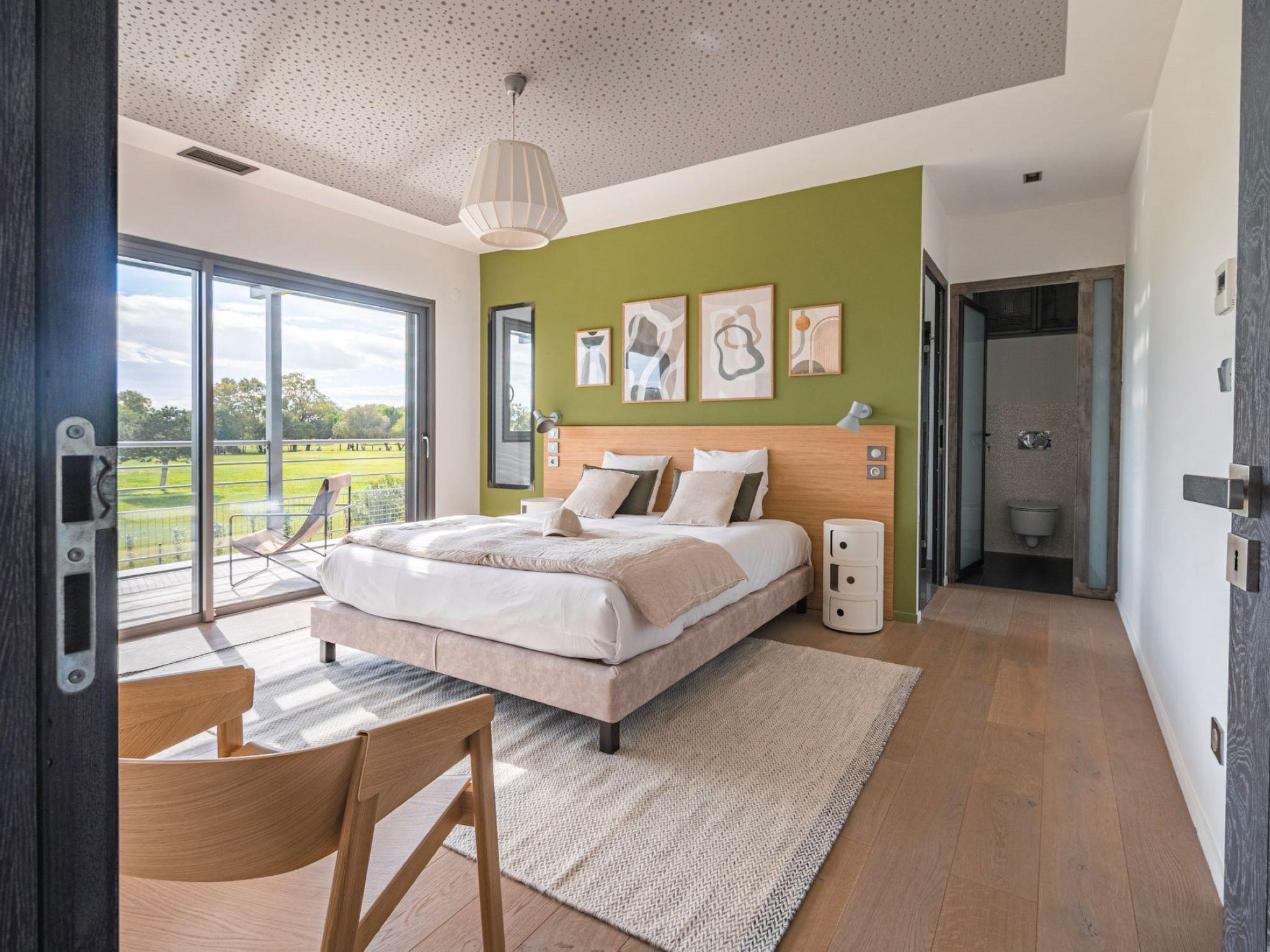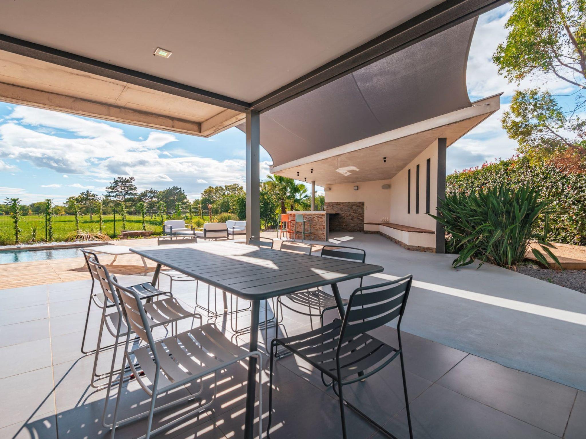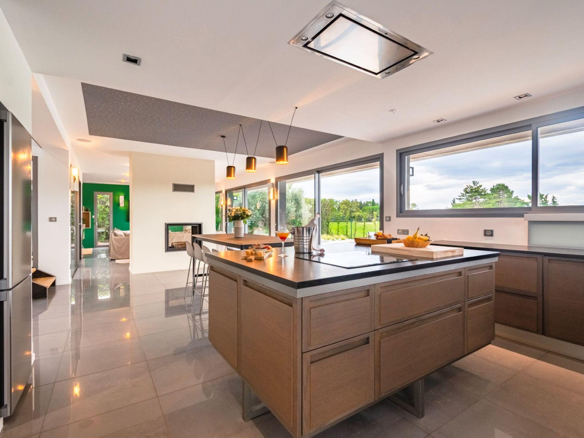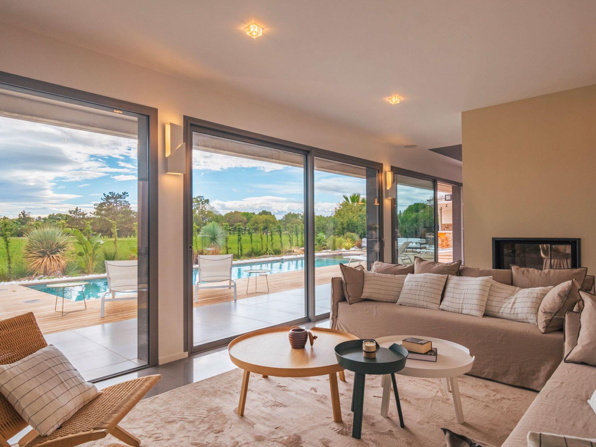 "Villa Horizon Resort Massane", 5-room villa 270 m2 on 2 levels. Spacious and bright, comfortable and modern furnishings: large living/dining room with winter garden with open-hearth fireplace, dining table and TV (flat screen). Exit to the terrace, to the swimming pool. Open kitchen (oven, dishwasher, 4 ceramic glass hob hotplates, toaster, kettle, microwave, freezer, electric coffee machine, cooking island). Exit to the terrace. Sep. WC. Upper floor: 1 room with Dressing room with 1 french bed (160 cm, length 200 cm), shower/WC and TV (flat screen). Exit to the balcony. 1 large room with 1 french bed (160 cm, length 200 cm), shower/WC and TV (flat screen). 1 room with 1 french bed (160 cm, length 200 cm), shower/WC and TV (flat screen). Exit to the balcony. 1 room with 2 beds (90 cm, length 190 cm), shower/WC. Exit to the balcony. Air-conditioning, forced-air heating. Large balcony, large terrace. Terrace furniture, balcony furniture, deck chairs (8). View of golf course. Facilities: washing machine, telephone, safe, children's high chair, baby cot, hair dryer. Internet (WiFi, free). Garage on the property (2 cars). Please note: maximum 1 pet/ dog allowed. Smoke alarm.