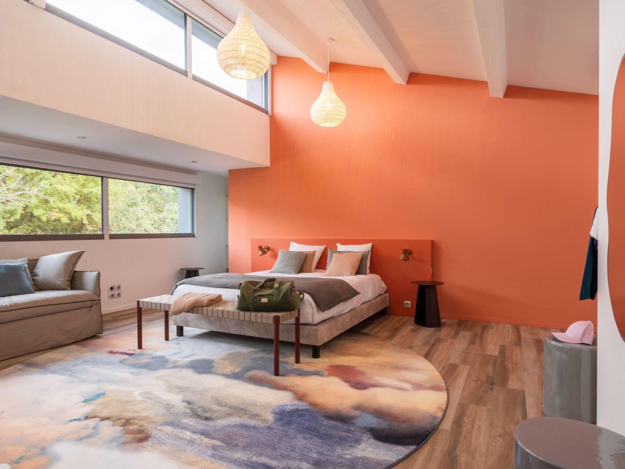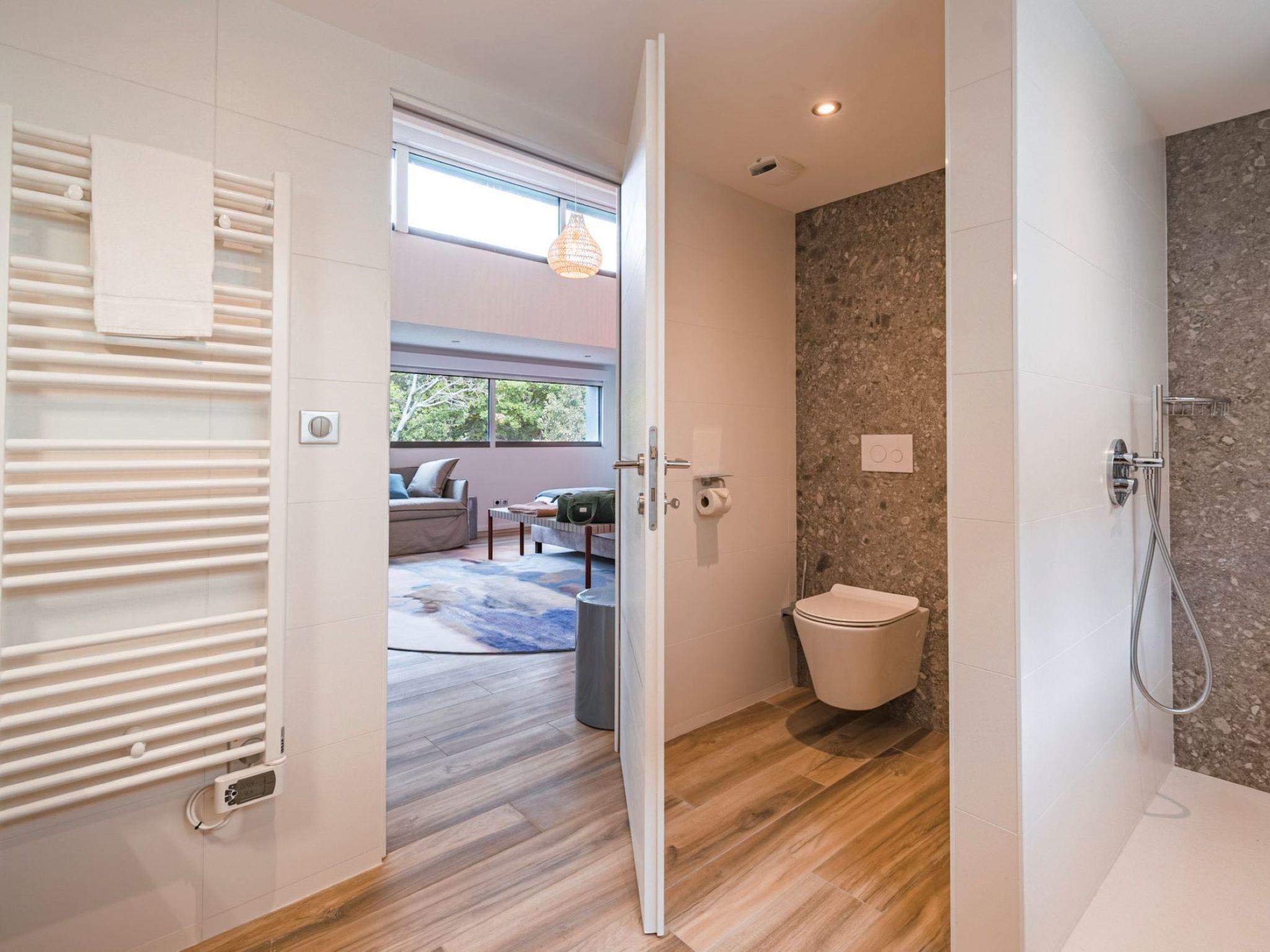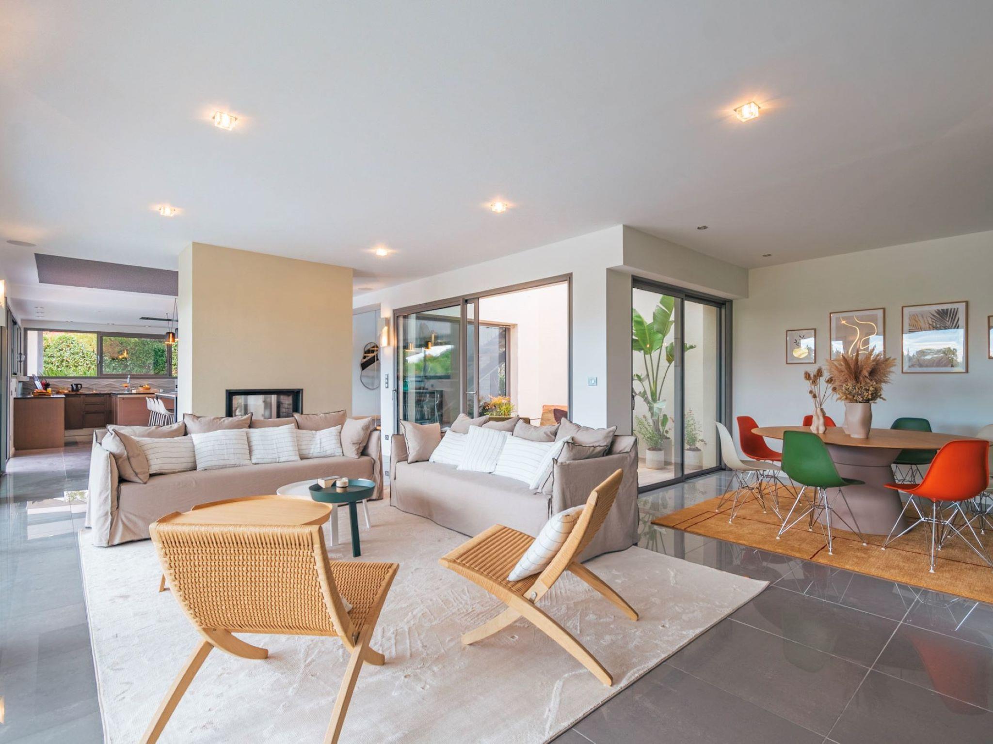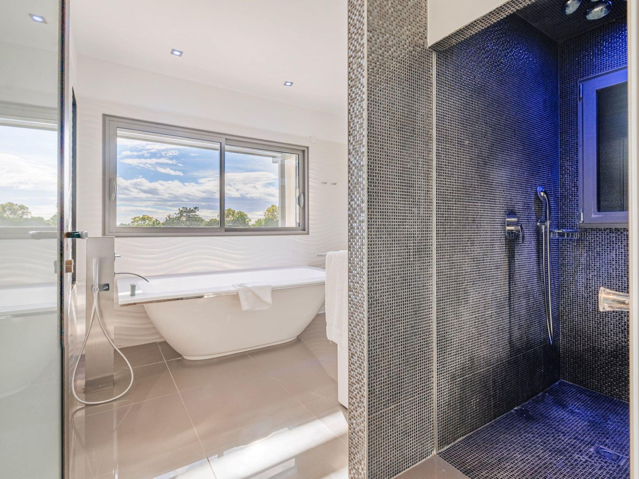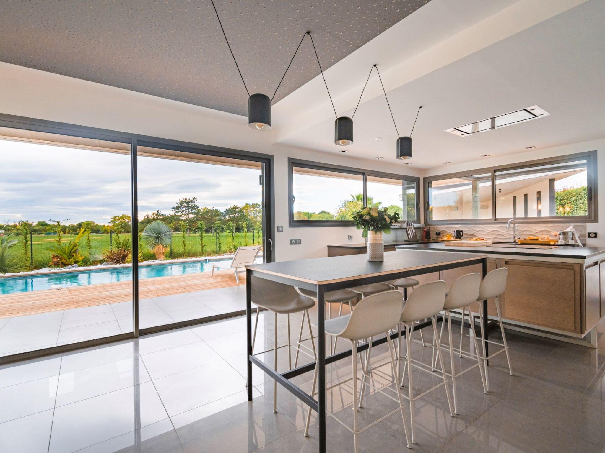 "Villa Horizon Resort Massane", 5-room villa 270 m2 on 2 levels. Spacious and bright, comfortable and modern furnishings: large living/dining room with winter garden with open-hearth fireplace, dining table and TV (flat screen). Exit to the terrace, to the swimming pool. Open kitchen (oven, dishwasher, 4 ceramic glass hob hotplates, toaster, kettle, microwave, freezer, electric coffee machine, cooking island). Exit to the terrace. Sep. WC. Upper floor: 1 room with Dressing room with 1 french bed (160 cm, length 200 cm), shower/WC and TV (flat screen). Exit to the balcony. 1 large room with 1 french bed (160 cm, length 200 cm), shower/WC and TV (flat screen). 1 room with 1 french bed (160 cm, length 200 cm), shower/WC and TV (flat screen). Exit to the balcony. 1 room with 2 beds (90 cm, length 190 cm), shower/WC. Exit to the balcony. Air-conditioning, forced-air heating. Large balcony, large terrace. Terrace furniture, balcony furniture, deck chairs (8). View of golf course. Facilities: washing machine, telephone, safe, children's high chair, baby cot, hair dryer. Internet (WiFi, free). Garage on the property (2 cars). Please note: maximum 1 pet/ dog allowed. Smoke alarm.